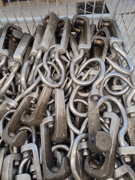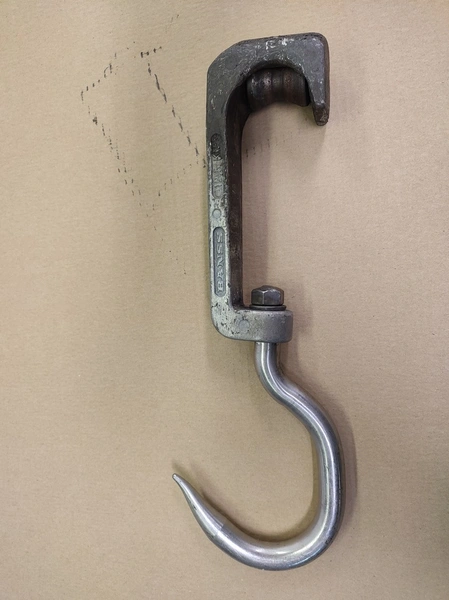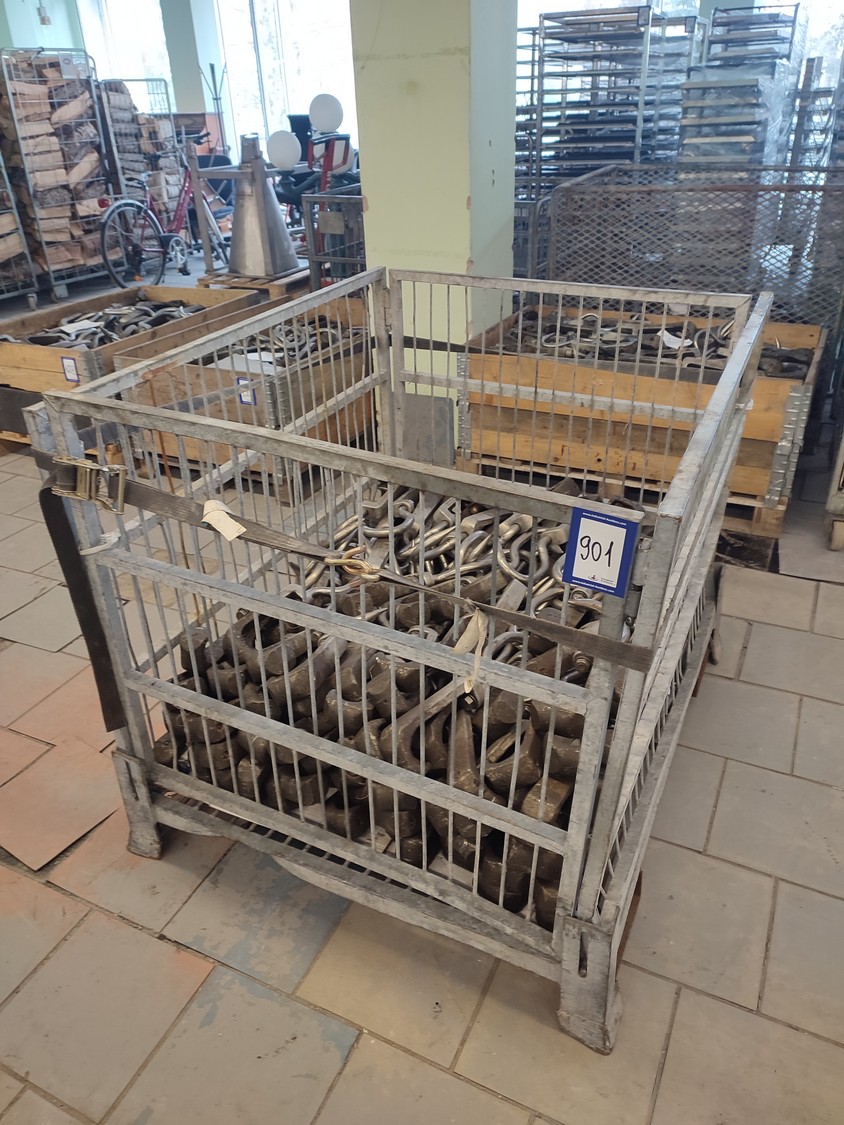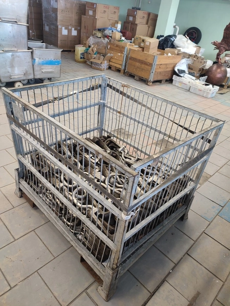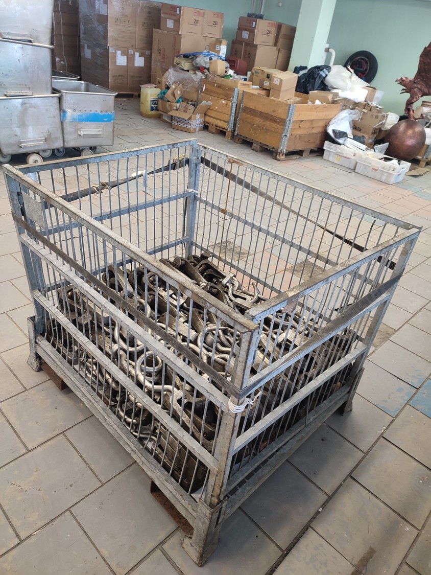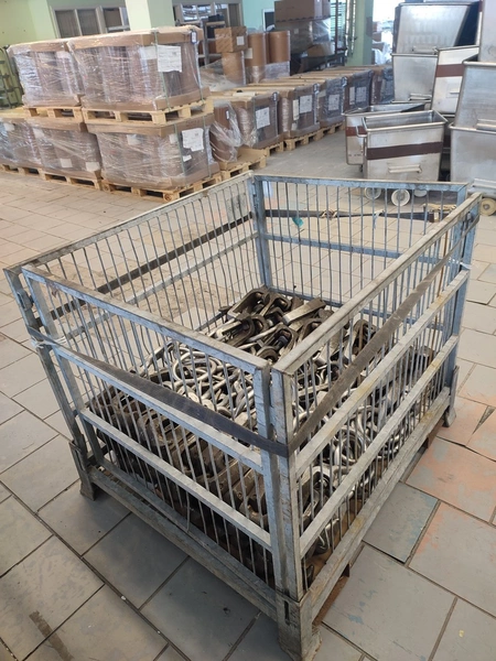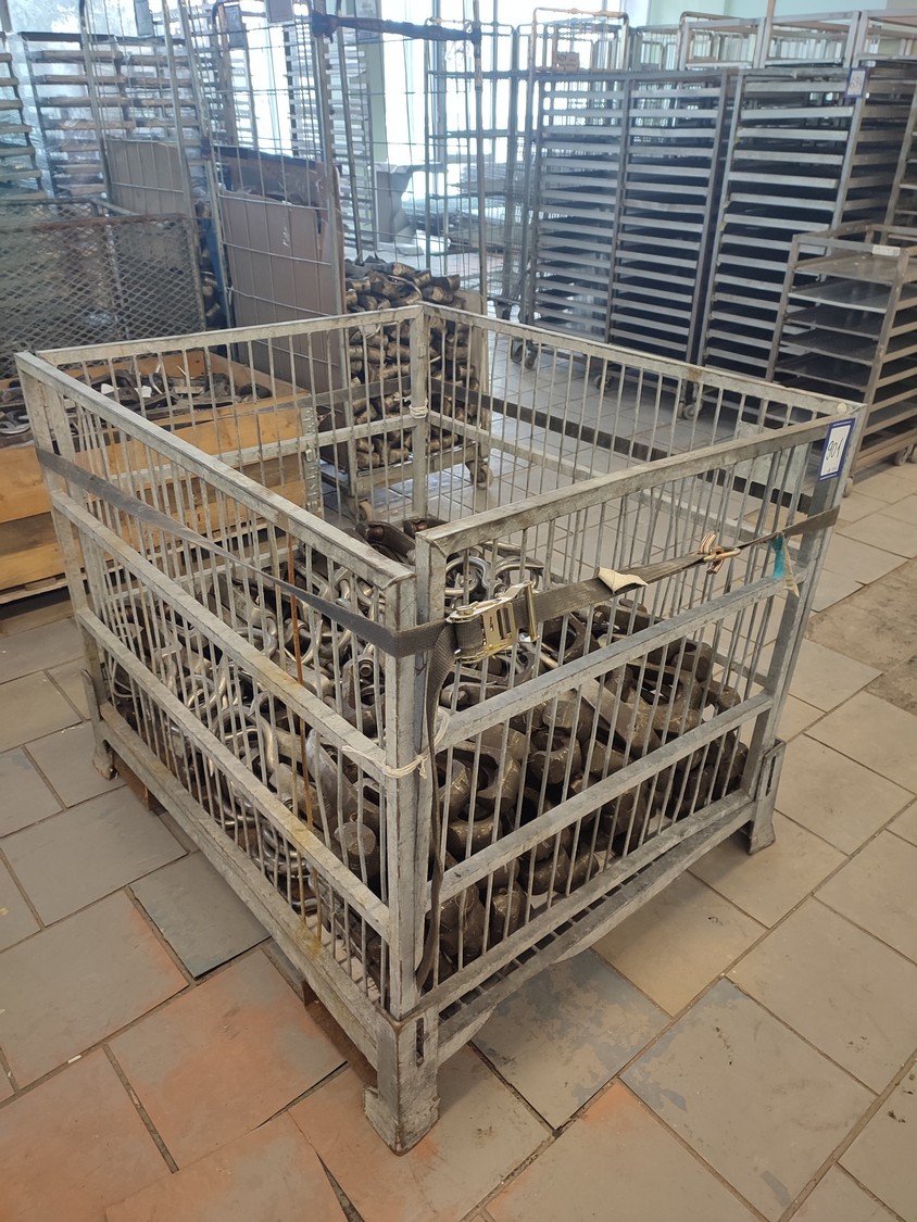 Steel container with 150 roller meat hooks, dimensions hooks: 440 mm x 145 mm x 50 mm, dimensions pallet box: 1200 mm x 1000 mm x 1000 mm.