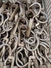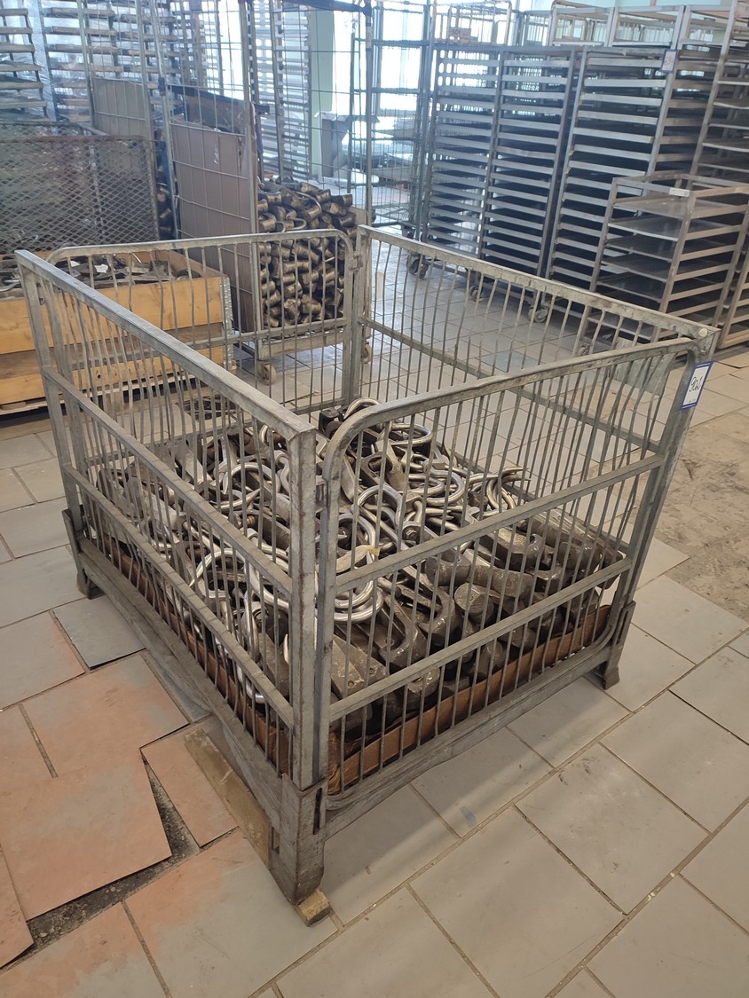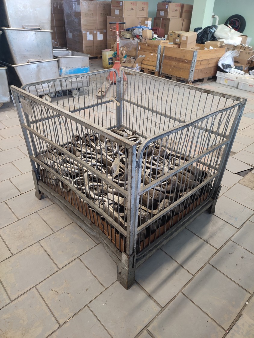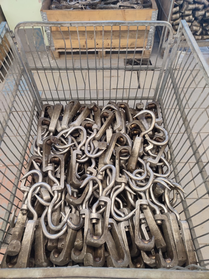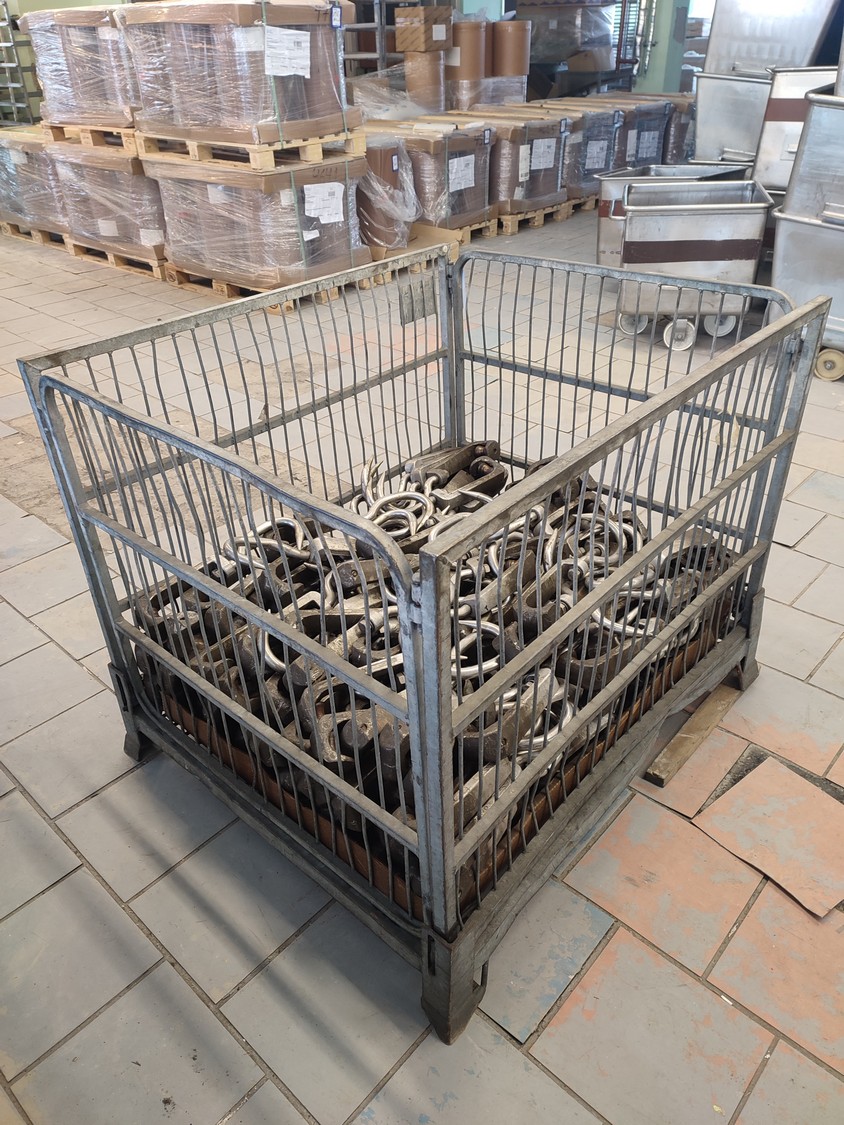 Steel container with 150 roller meat hooks, dimensions hooks: 440 mm x 145 mm x 50 mm, dimensions pallet box: 1000 mm x 1200 mm x 960 mm.
