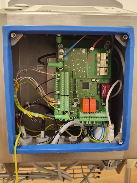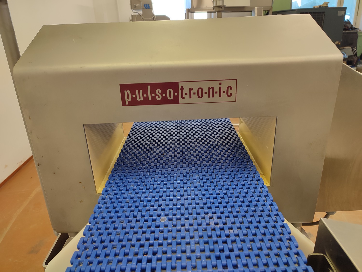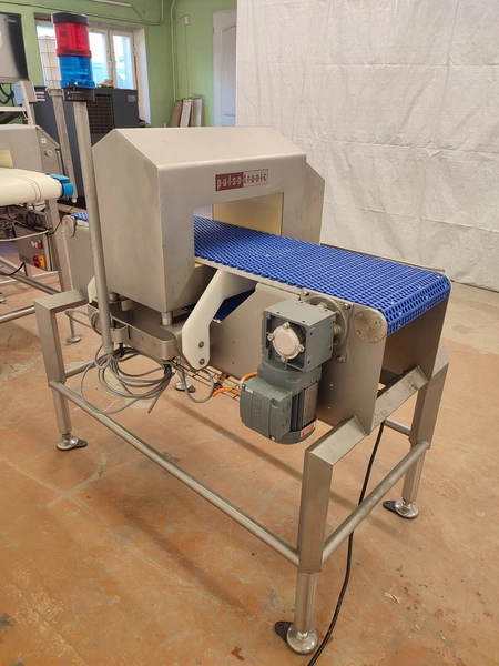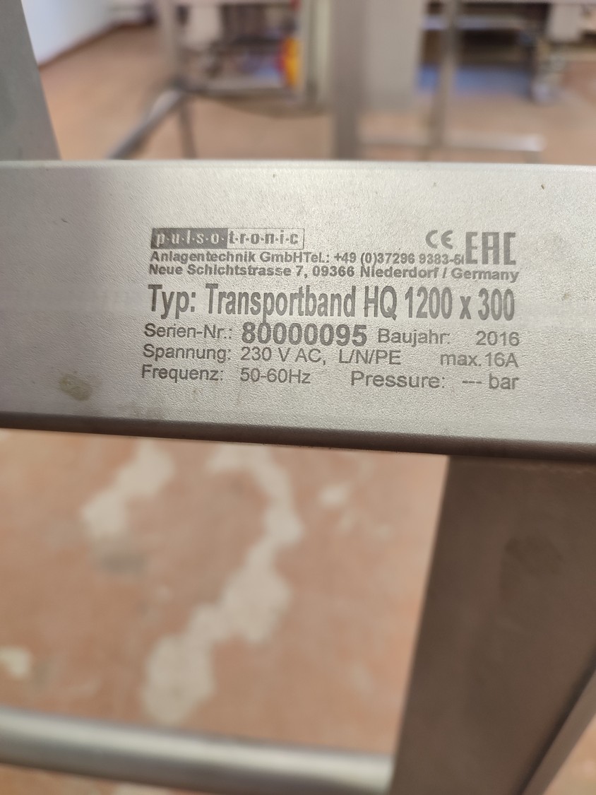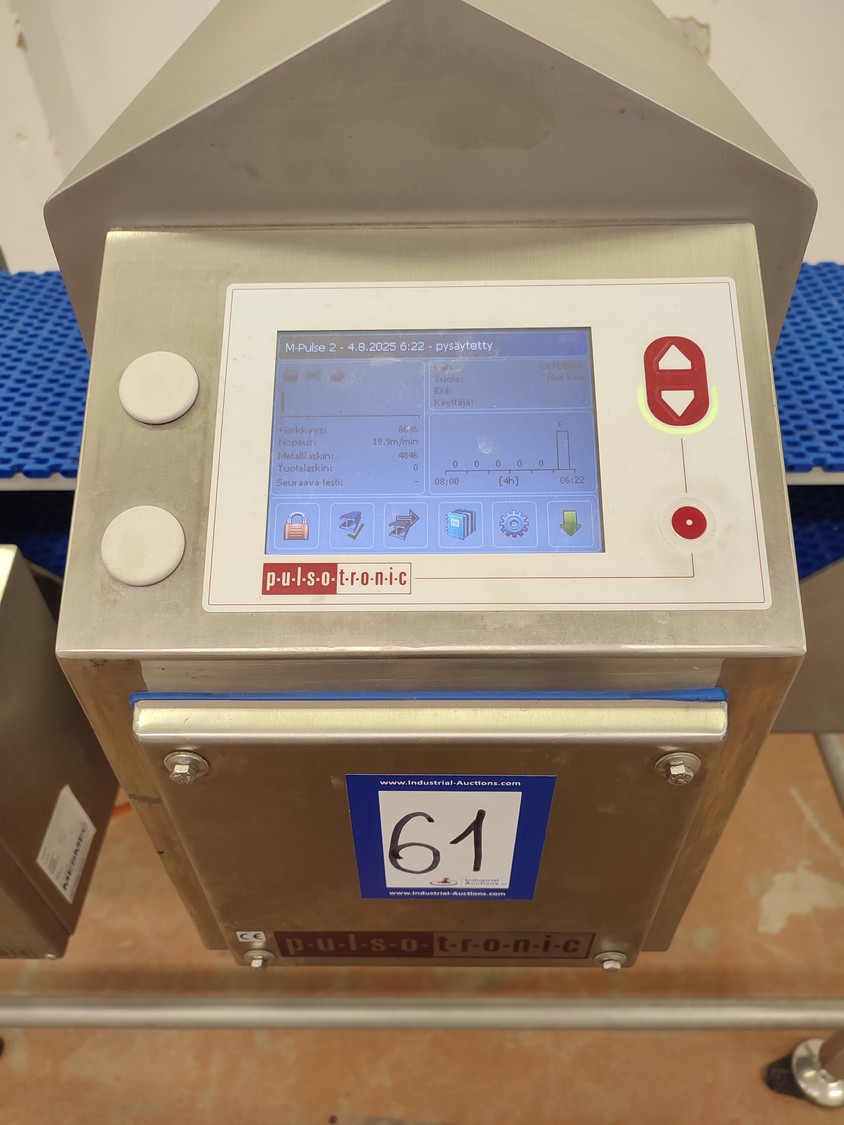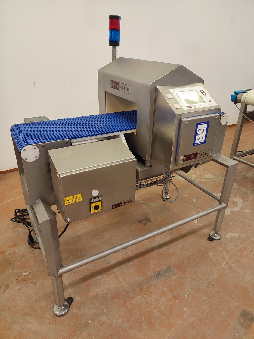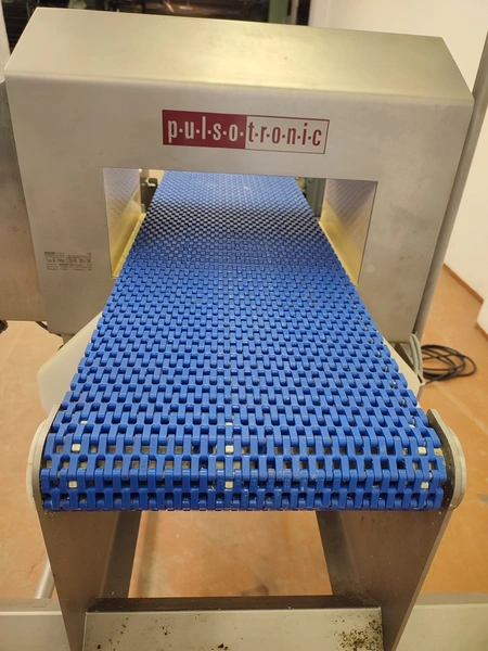 Pulsotronic metal detector, type: M-Pulse 2 BD-HD 350 x 150, serial number: 90006199, year of construction: 2016, 115/230 V, 1 Ph, 50/60 Hz, max 16 A, plastic mesh belt, belt width: 300 mm, clearance: 340 mm x 120 mm, total dimensions: 1200 mm x 820 mm x 1365 mm.
