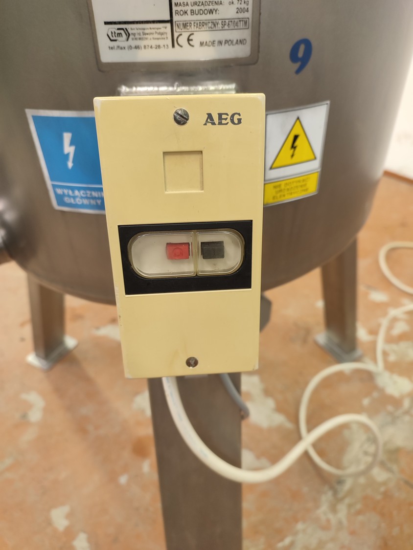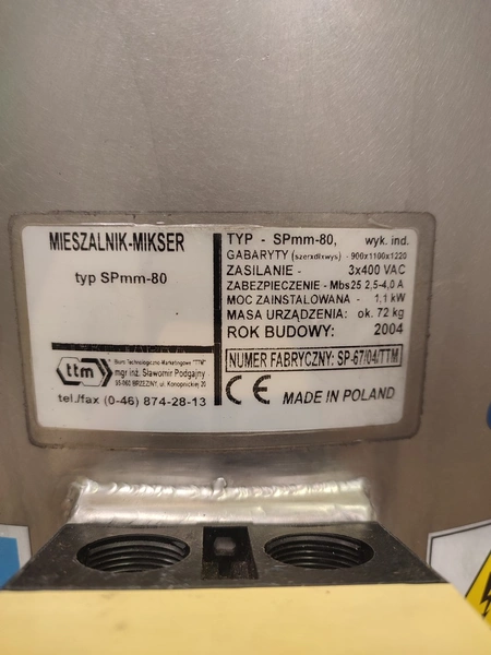 TTM s/s mixer, type: SPmm-80, number: SP-67/04/TTM, year of construction: 2004, 3 Ph, 400 V, 2.5-4.0 A, 1.1 kW, weight: 72 kg, inside dimensions: Ø 490 mm x 450 mm, total dimensions: 900 mm x 1100 mm x 1220 mm.