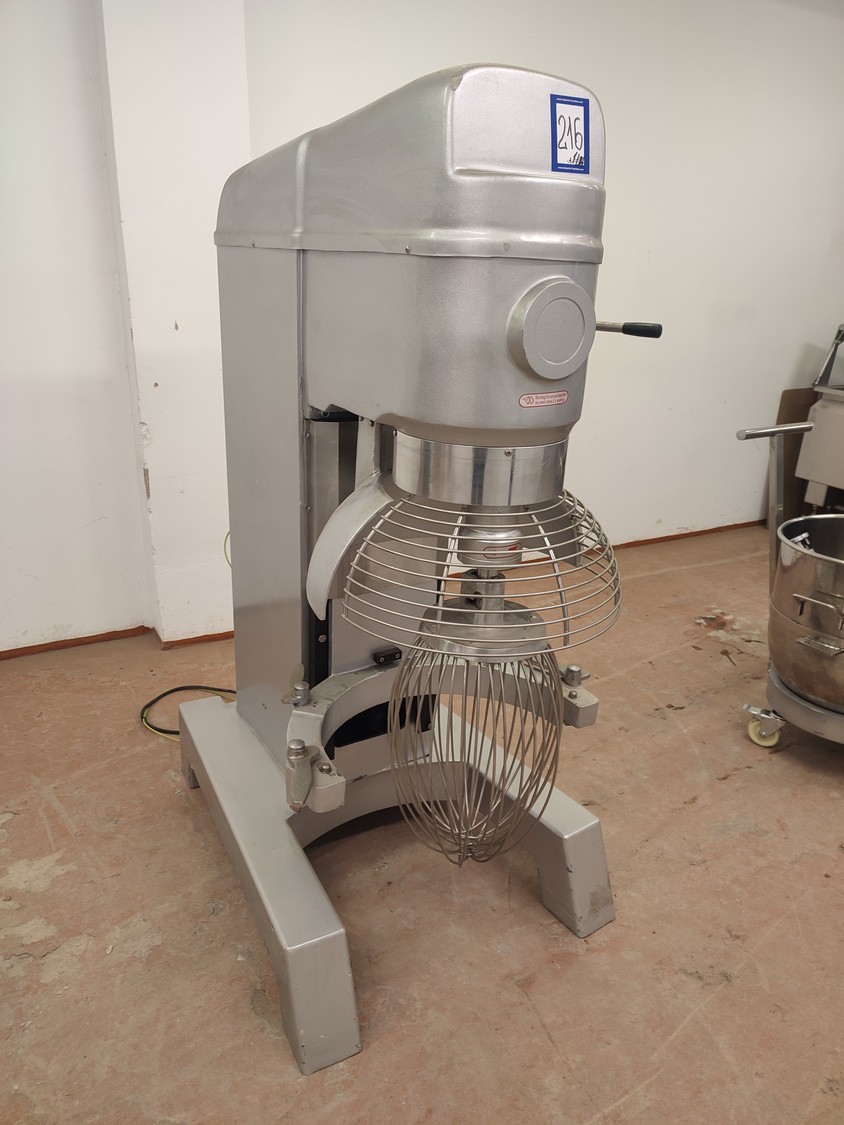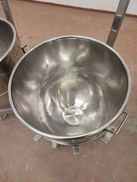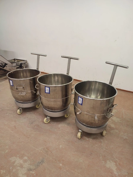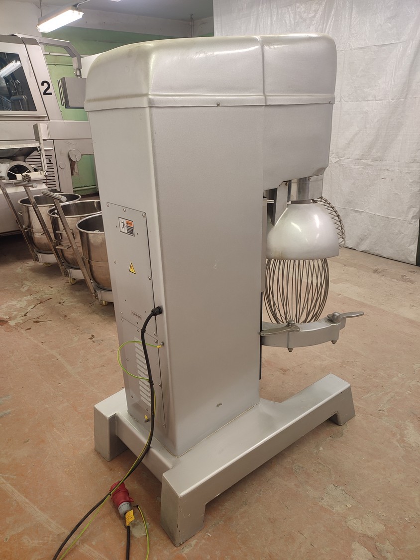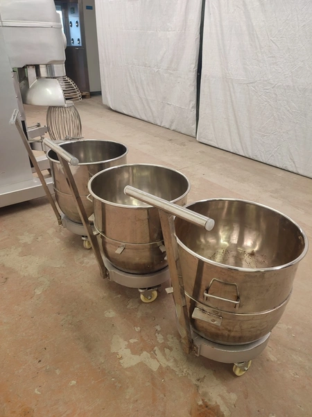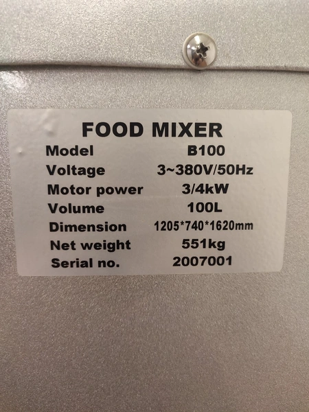 Food Mixer bowl mixer, model: B100, serial number: 2007001, 380 V, 3 Ph, 50 Hz, 3/4 kW, weight: 551 kg, inside dimensions bowl: Ø 520 mm x 480 mm, total dimensions mixer: 740 mm x 1205 mm x 1620 mm. Including 3 extra s/s bowls, dimensions: (3x) 630 mm x 700 mm x 930 mm.
