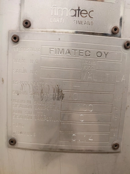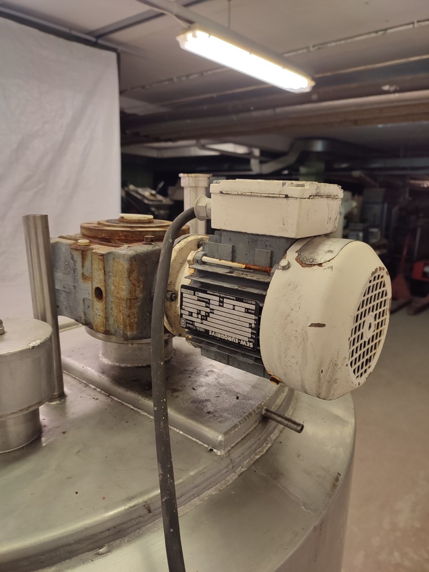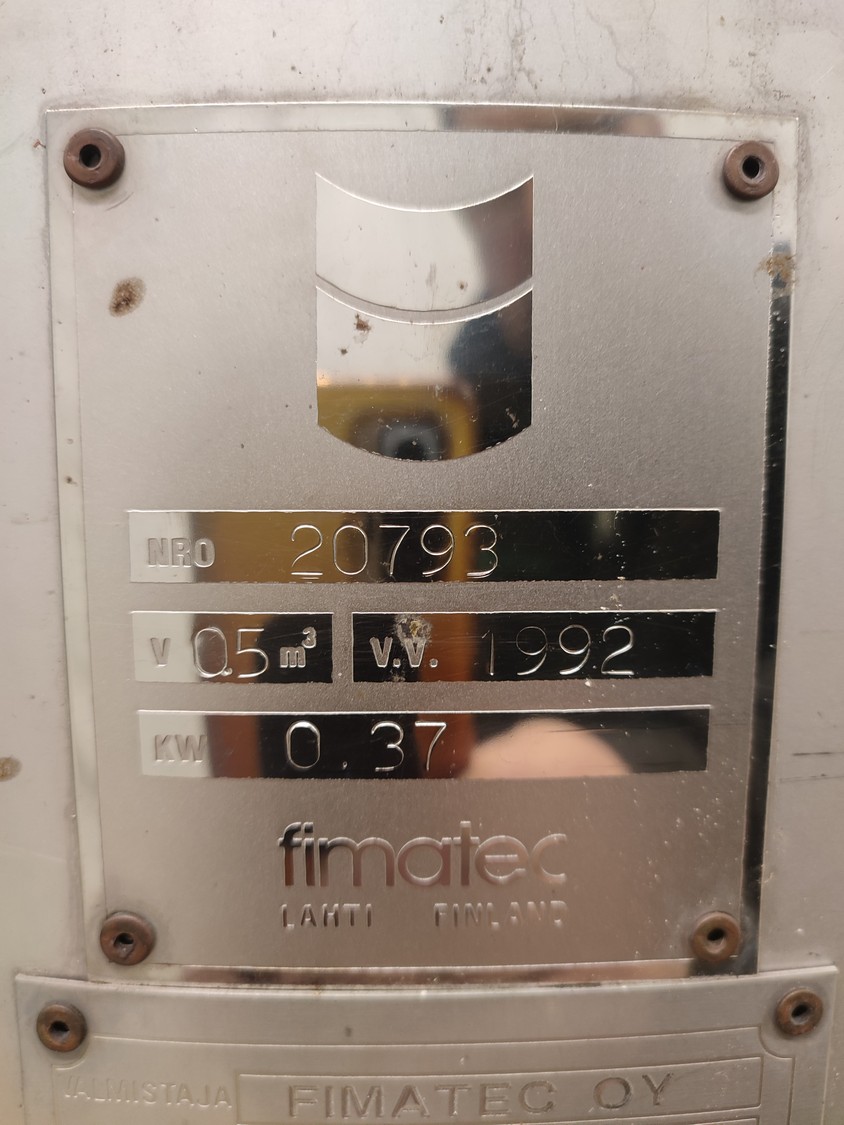 Fimatec Oy mixing tank, number: 20793, year of construction: 1992, 0.37 kW, volume: 500 liter, dimensions: 1000 mm x 1080 mm x 1600 mm.