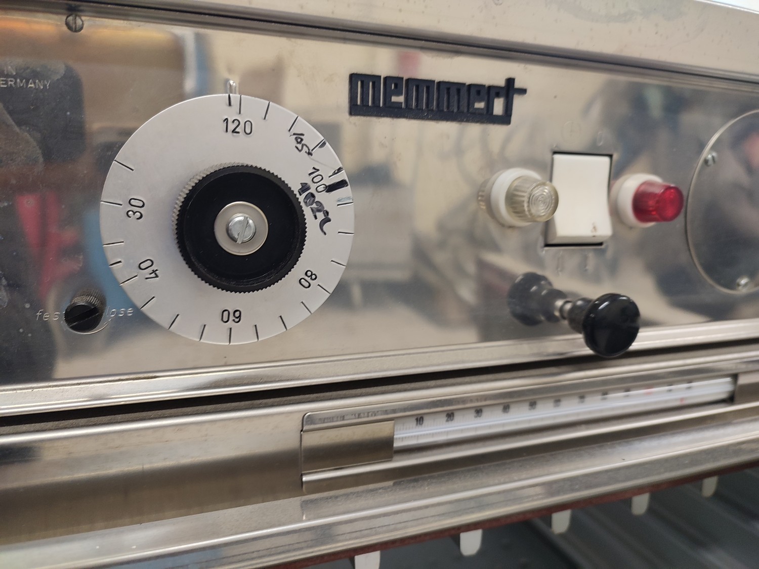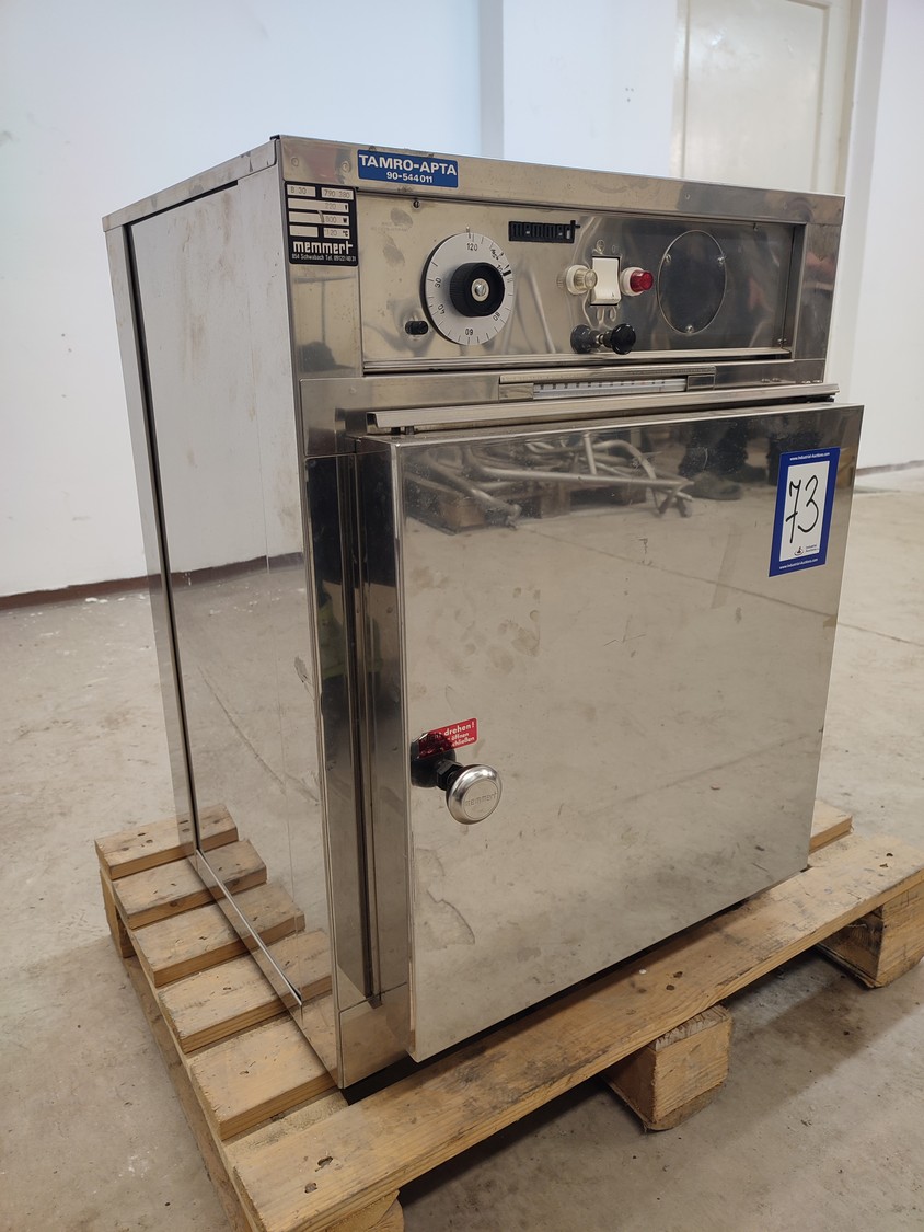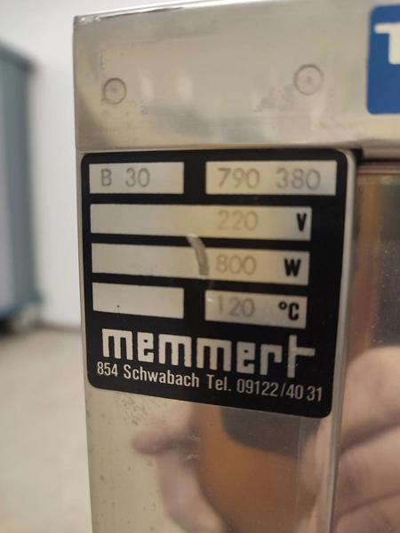 Memmert oven, model: B30, serial number: 790 380, 220 V, 800 W, max 120°C, 9 floors, floor dimensions: 400 mm x 320 mm, inside dimensions: 400 mm x 320 mm x 400 mm, total dimensions: 515 mm x 540 mm x 680 mm.