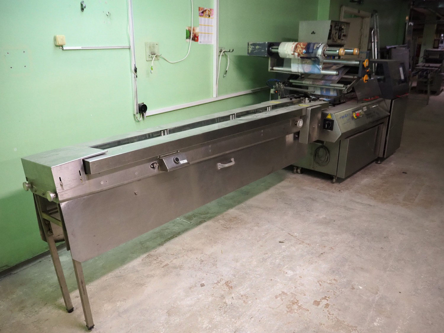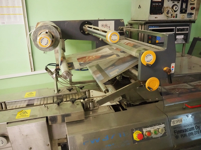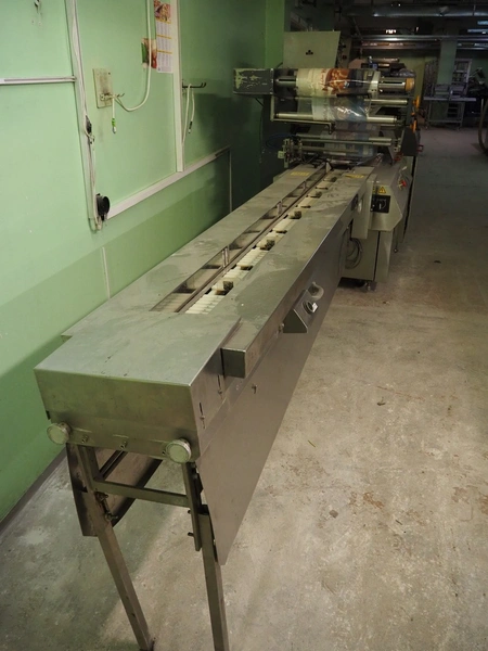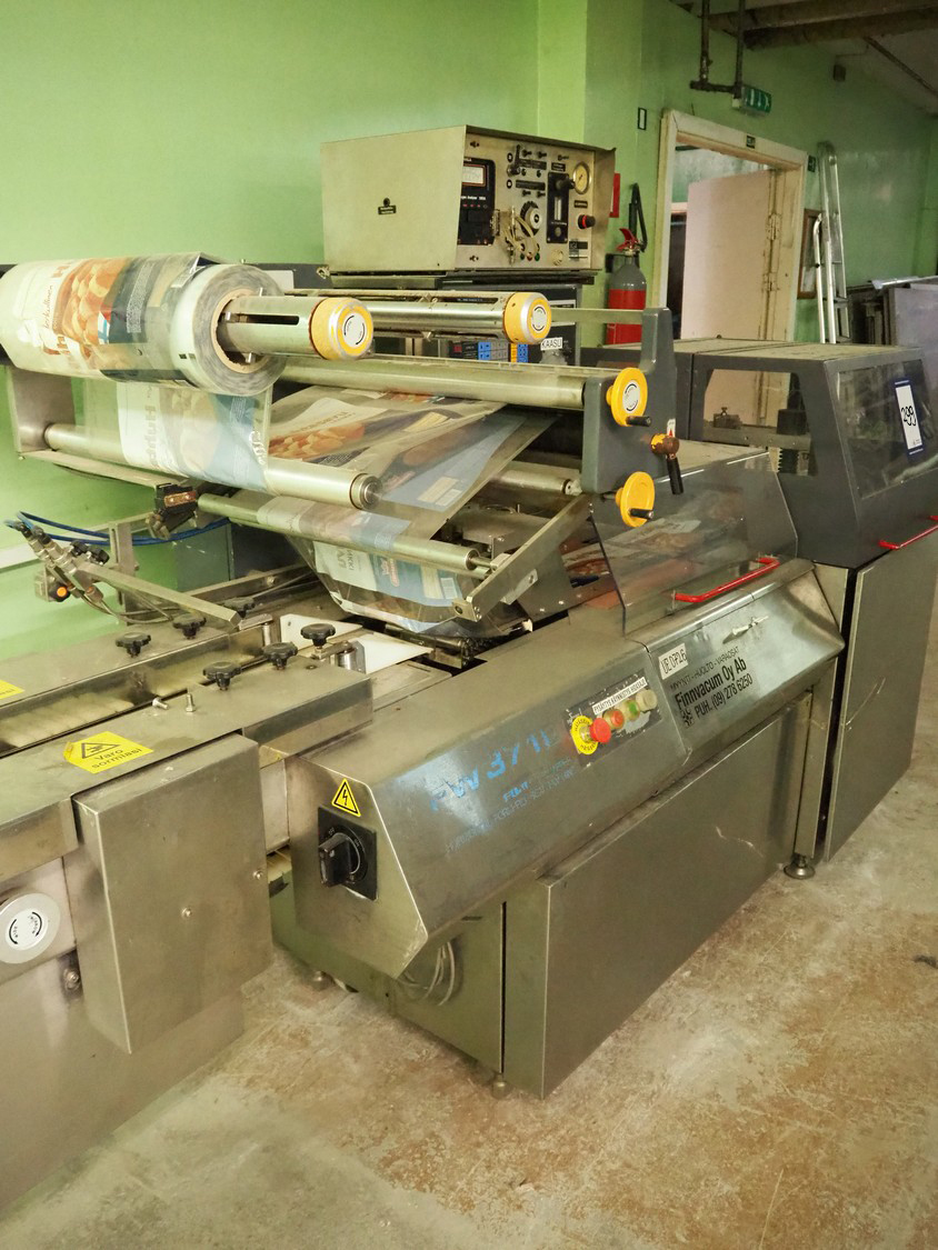 Fuji Machinery Co.Ltd flowpacker, model: FW3710B-R, serial number: 010218, year of construction: 1989, 200 VAC, 50/60 Hz, 3.045 kW, plastic belt, belt width: 220 mm, film width: 450 mm, Witt Gasetechnik gas mixing station, type: KM 100 2 MRAI, total dimensions flowpacker: 2700 mm x 1100 mm x 1720 mm, dimensions infeed conveyor: 2300 mm x 530 mm x 500 mm.