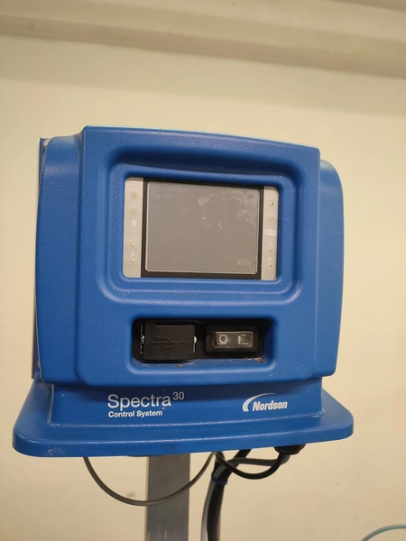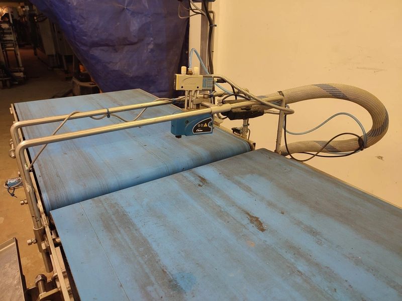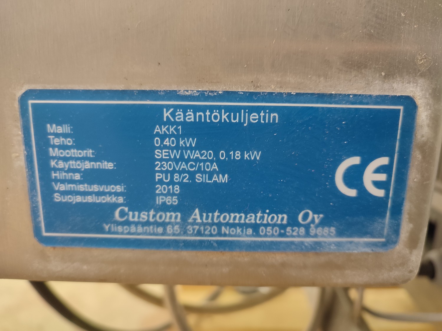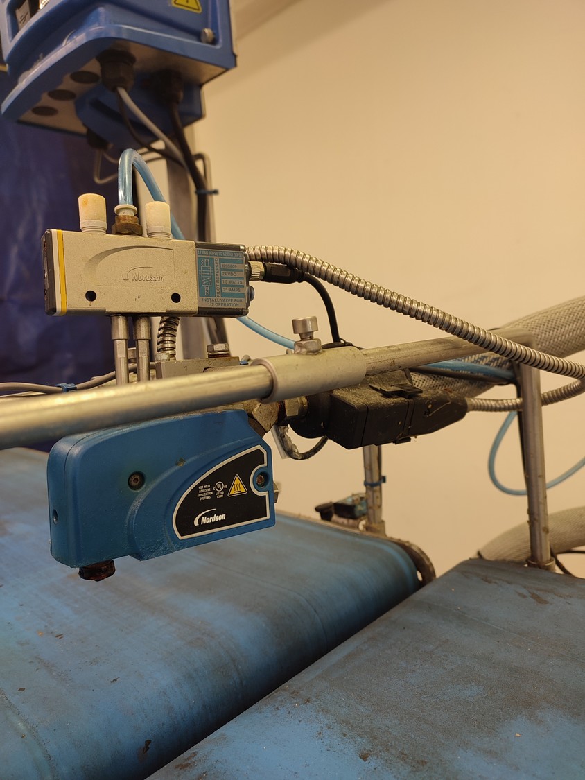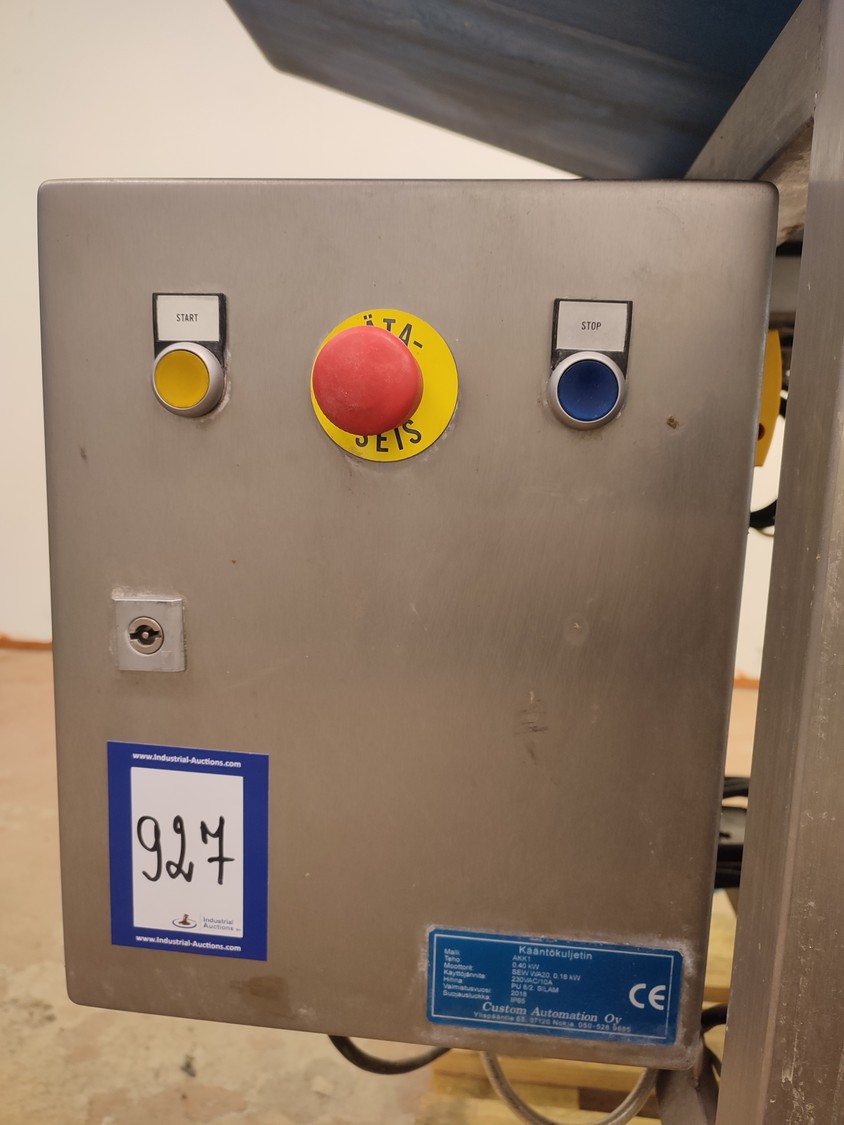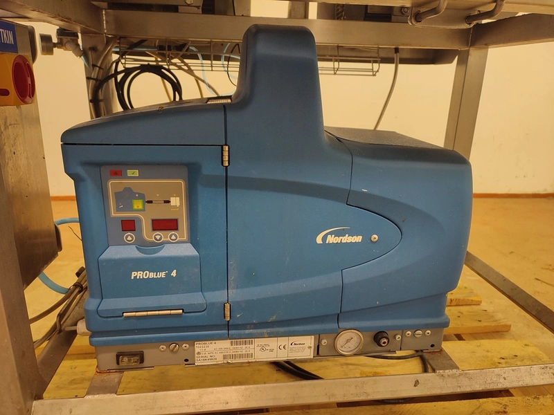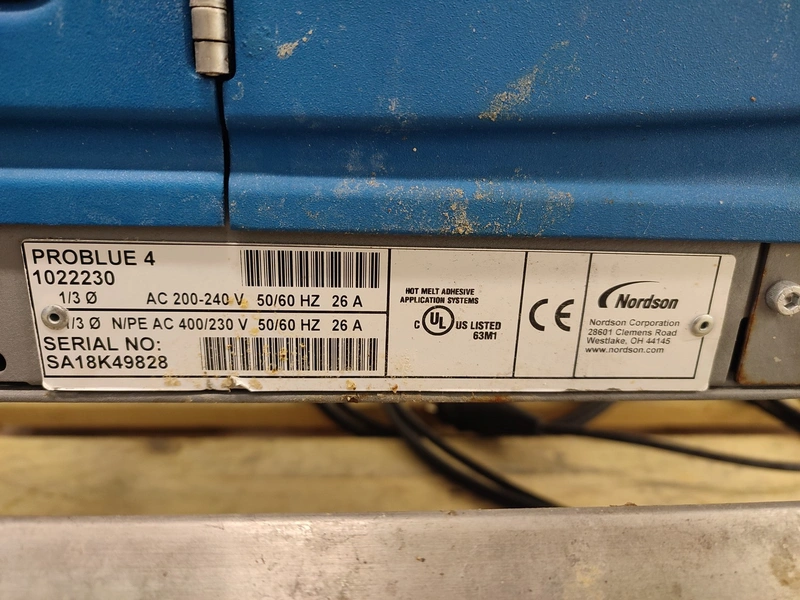 Custom Automation Oy packing belt, model: AKK1, year of construction: 2018, 230 V, 10 A, 0.40 kW, plastic belt, belt width: (2x) 550 mm. Including Nordson glue unit, model: PROBLUE 4, serial number: SA18K49828, 400/230 V, 1/3 Ph, 50/60 Hz, 26 A, total dimensions: 1860 mm x 910 mm x 1620 mm.