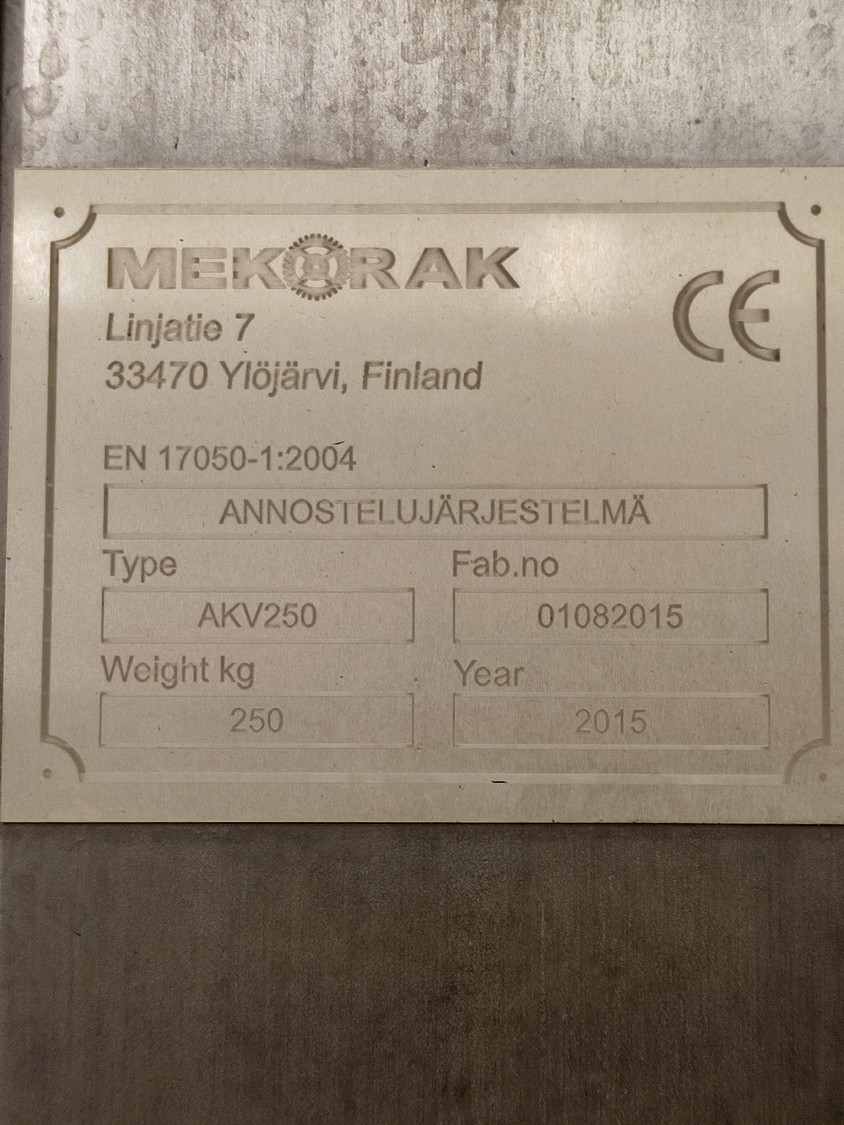 Mekorak mobile sleever , type: AKV250, number: 01082015, year of construction: 2015, 230 V, 50 Hz, 16 A, 3 kW, weight: 250 kg, dimensions: 3750 mm x 1250 mm x 1650 mm.