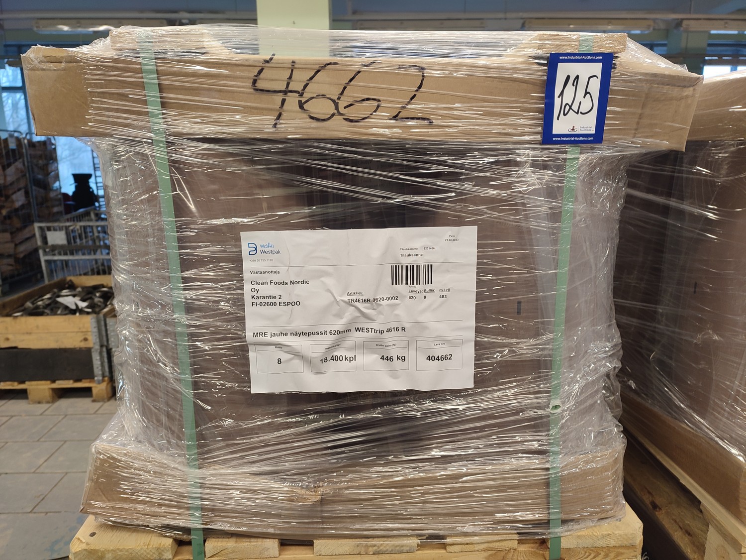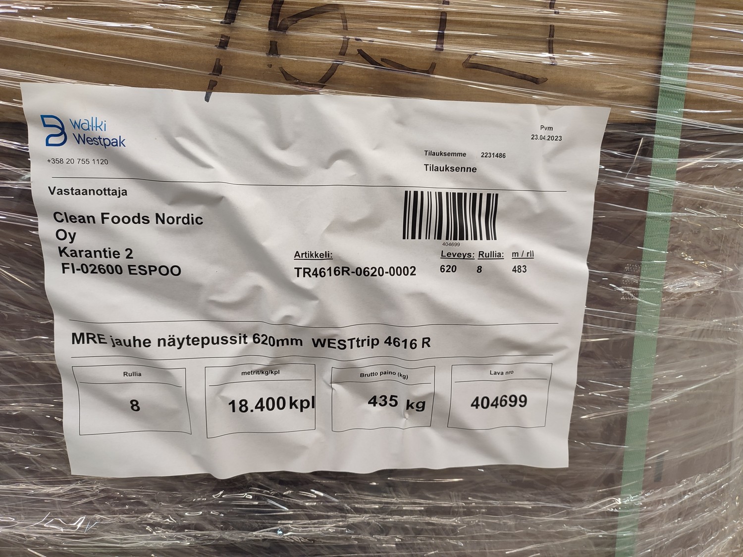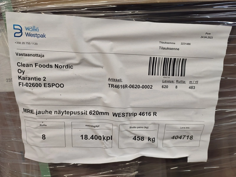4 pallets with 32 rolls of Walki Westpak plastic film rolls, type: WESTrip 4616 R, date of manufacture: 24.04.2023, film width: 620 mm, weight: 440/330 kg, total dimensions: (4x) 800 mm x 1200 mm x 800 mm.