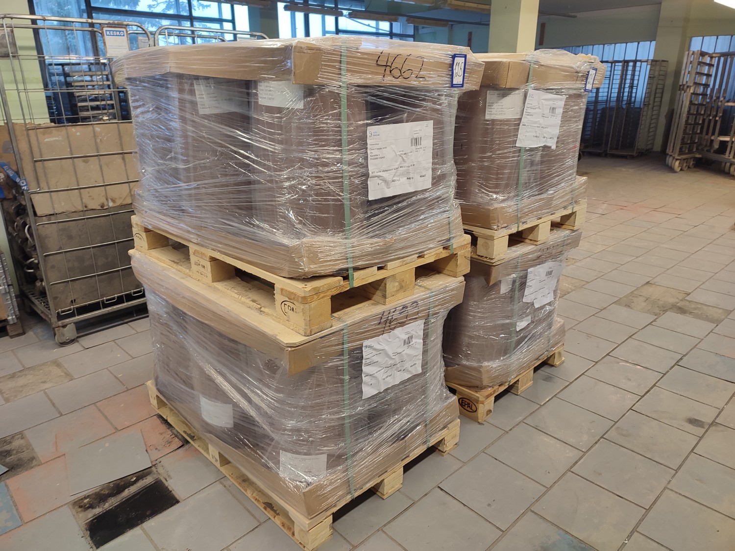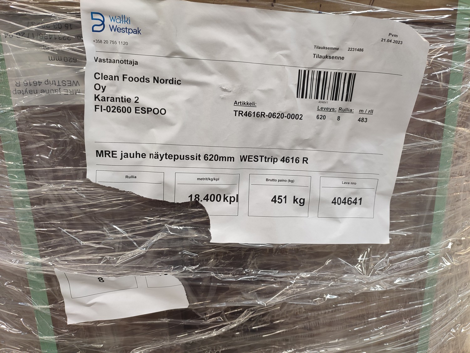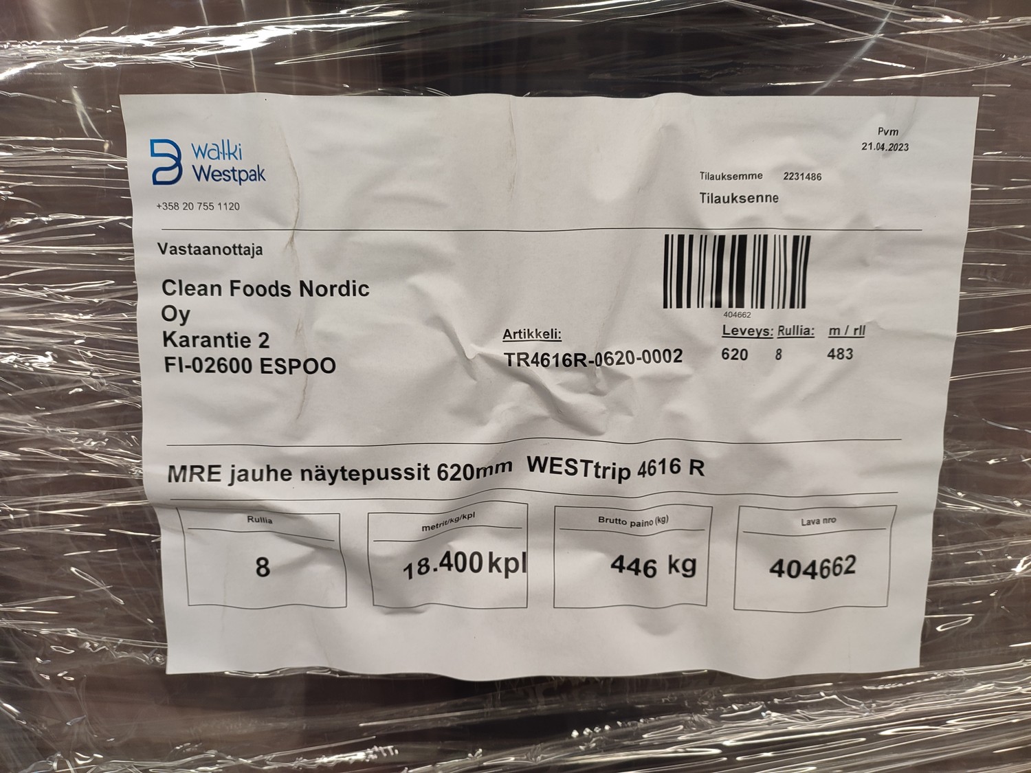 4 pallets with 32 rolls of Walki Westpak plastic film rolls, type: WESTrip 4616 R, date of manufacture: 24.04.2023, film width: 620 mm, weight: 440/330 kg, total dimensions: (4x) 800 mm x 1200 mm x 800 mm.