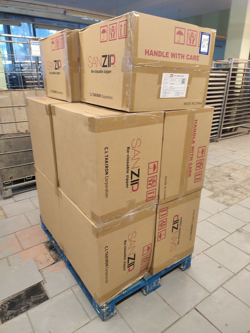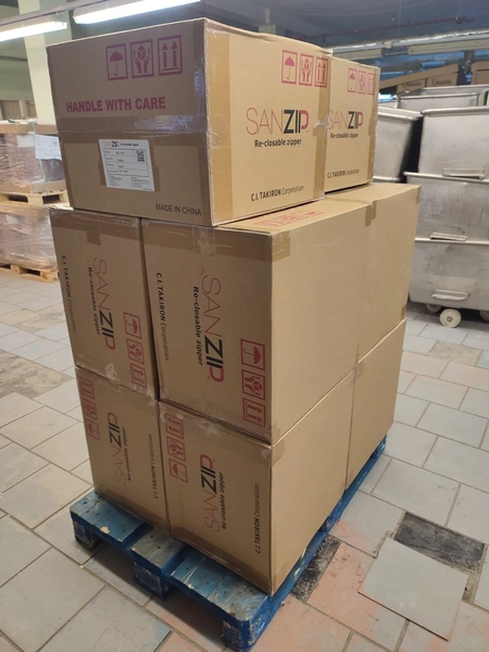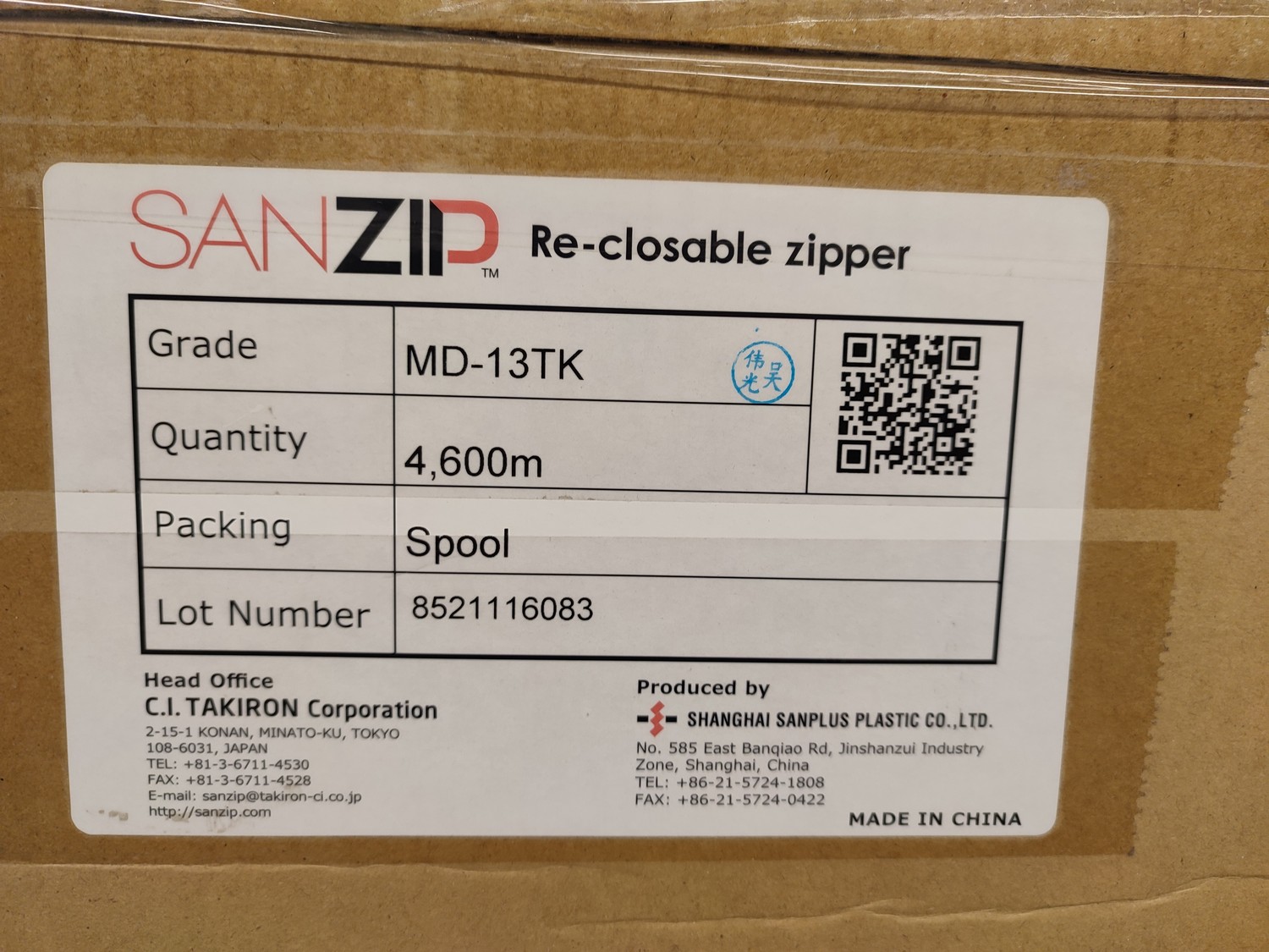 Shanghai Sanplus Plastic Co.,Ltd 10 boxes with plastic re-closable zipper, type: MD-13TK, quantity: 4.600 m, total dimensions: 800 mm x 1200 mm x 1630 mm.