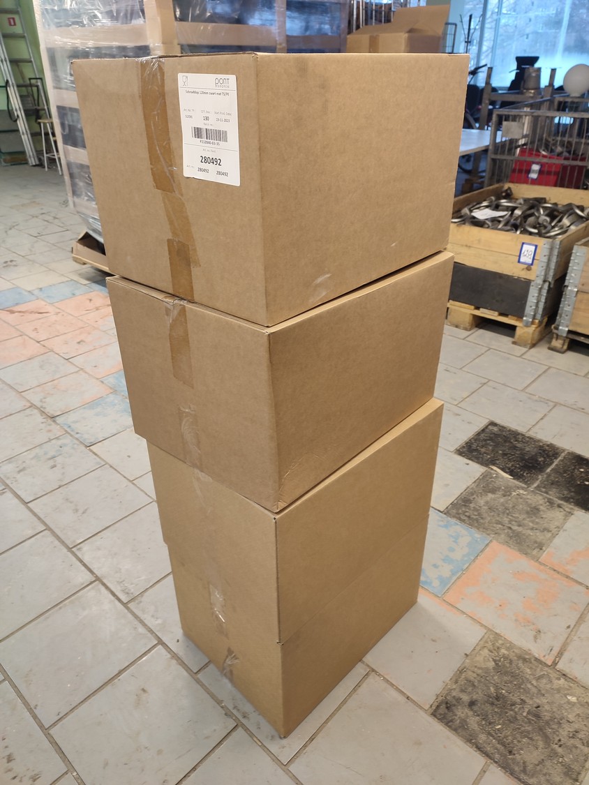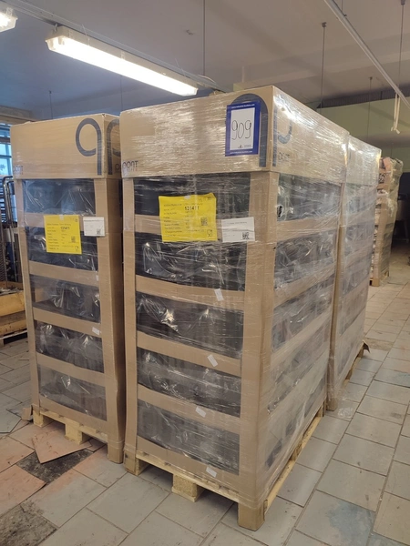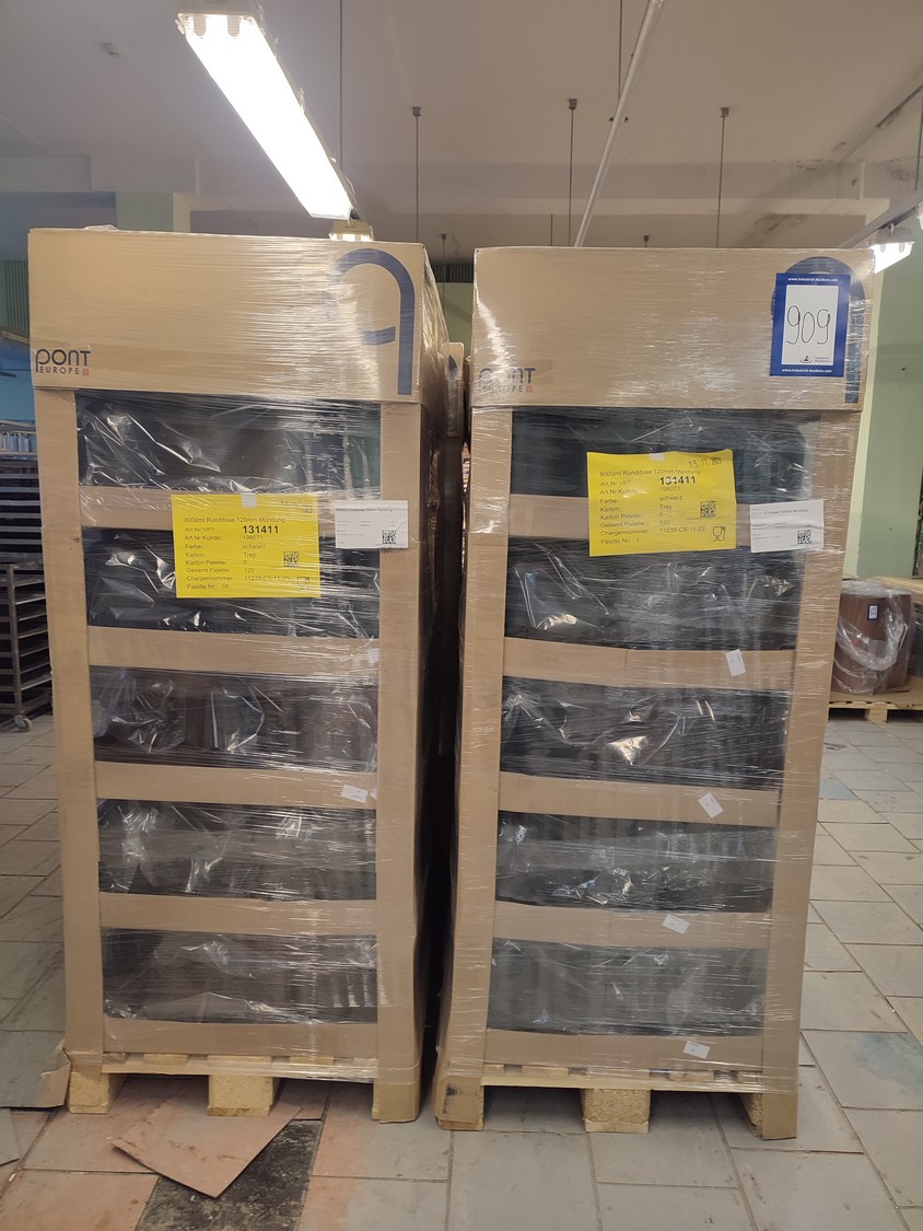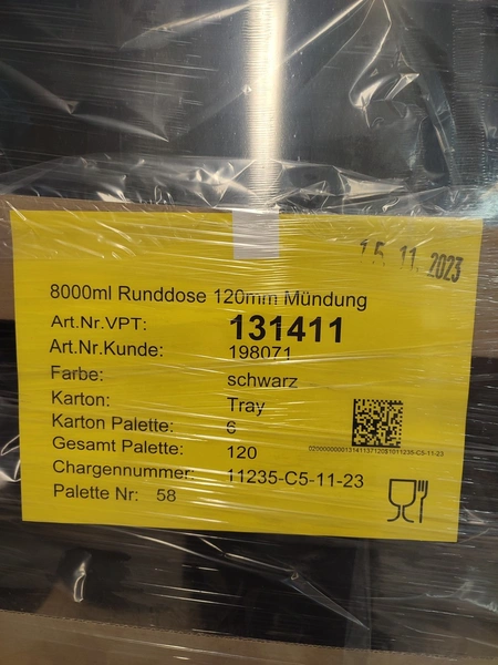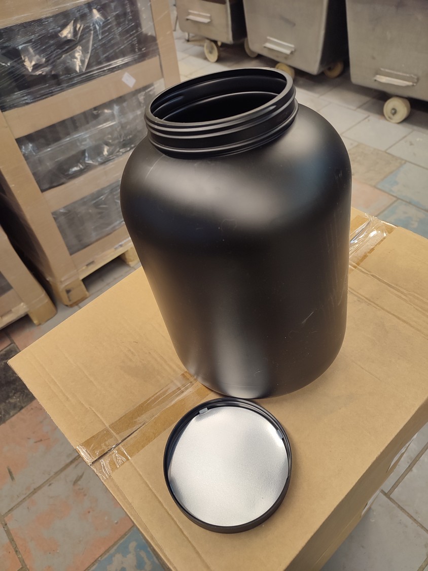 4 pallets and 4 boxes with black plastic jars with lids, approximately 480 pieces, jar volume: 8000 ml, neck diameter: 120 mm, pallets dimensions: (4x) 800 mm x 1200 mm x 1900 mm, boxes dimensions: (4x) 390 mm x 500 mm x 320 mm.