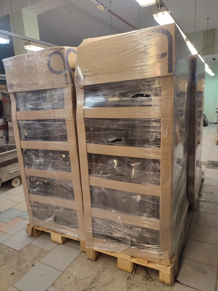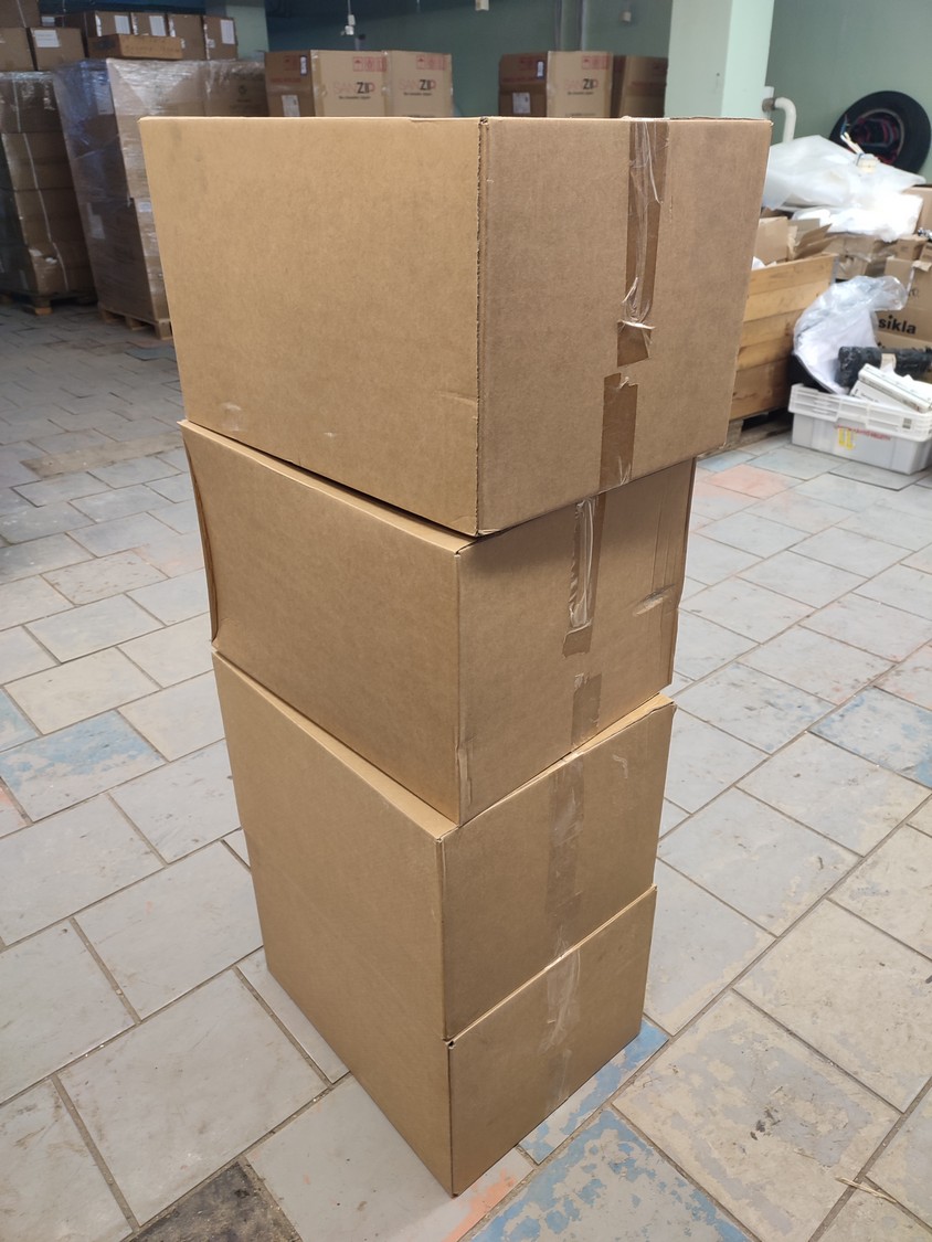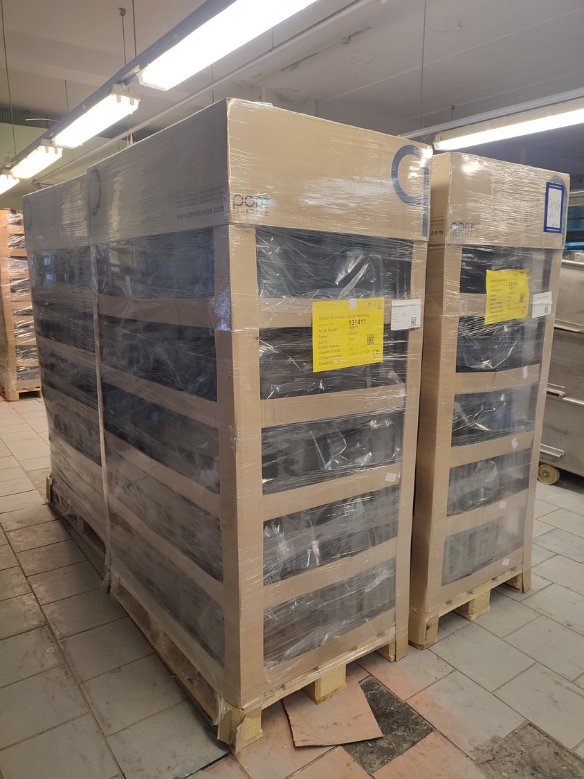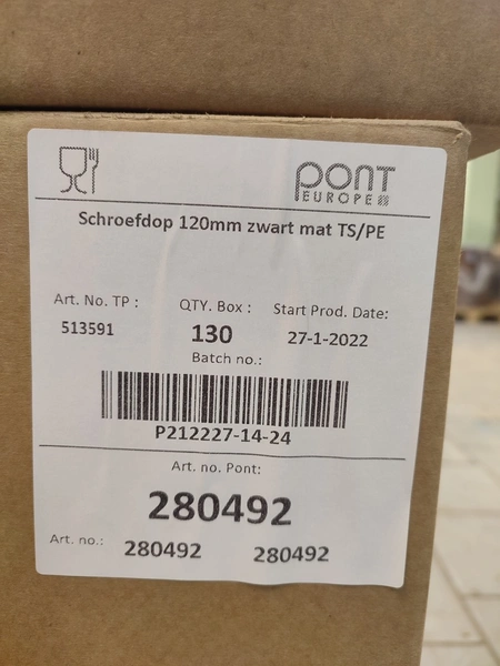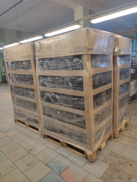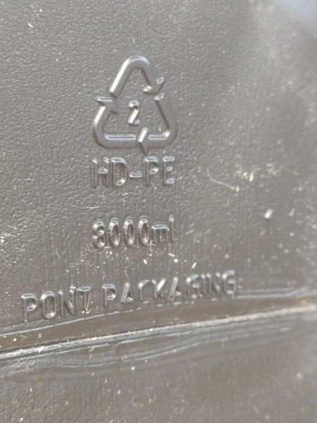 4 pallets and 4 boxes with black plastic jars with lids, approximately 480 pieces, jar volume: 8000 ml, neck diameter: 120 mm, pallets dimensions: (4x) 800 mm x 1200 mm x 1900 mm, boxes dimensions: (4x) 390 mm x 500 mm x 320 mm.