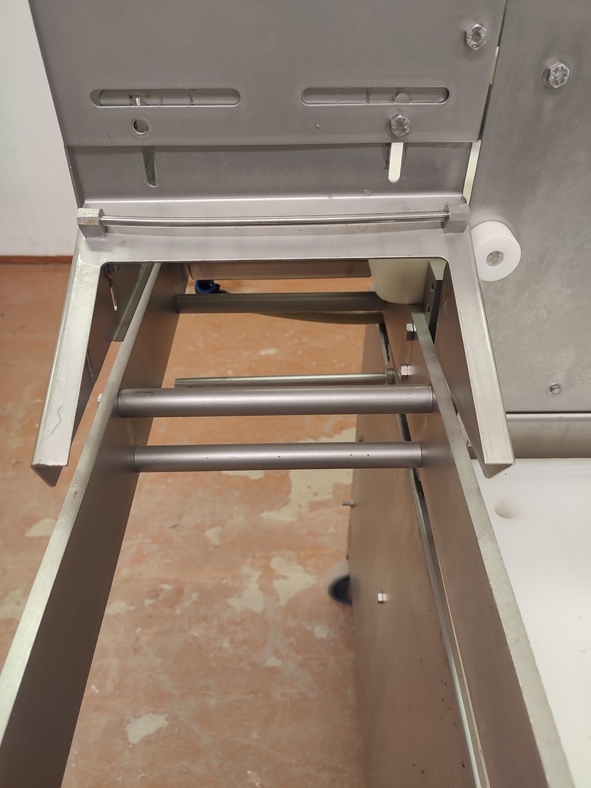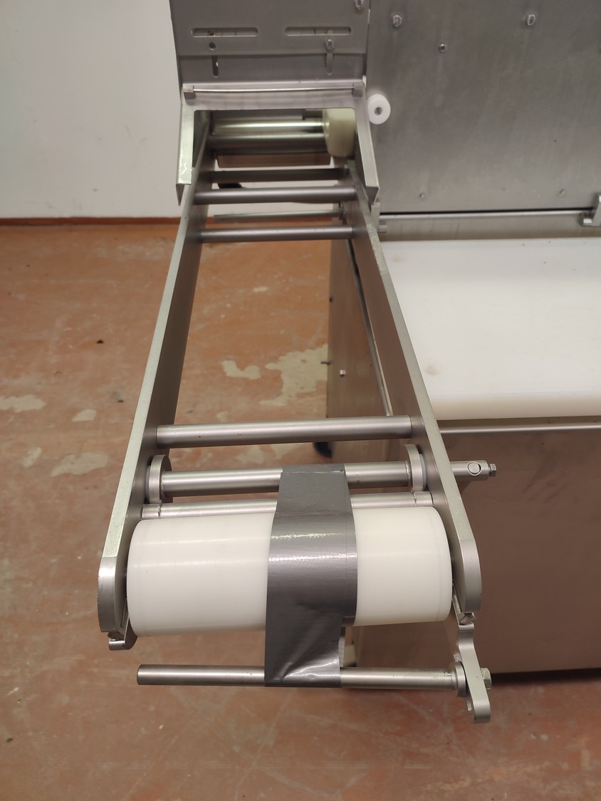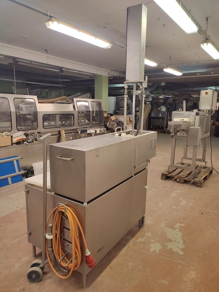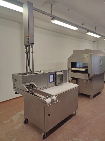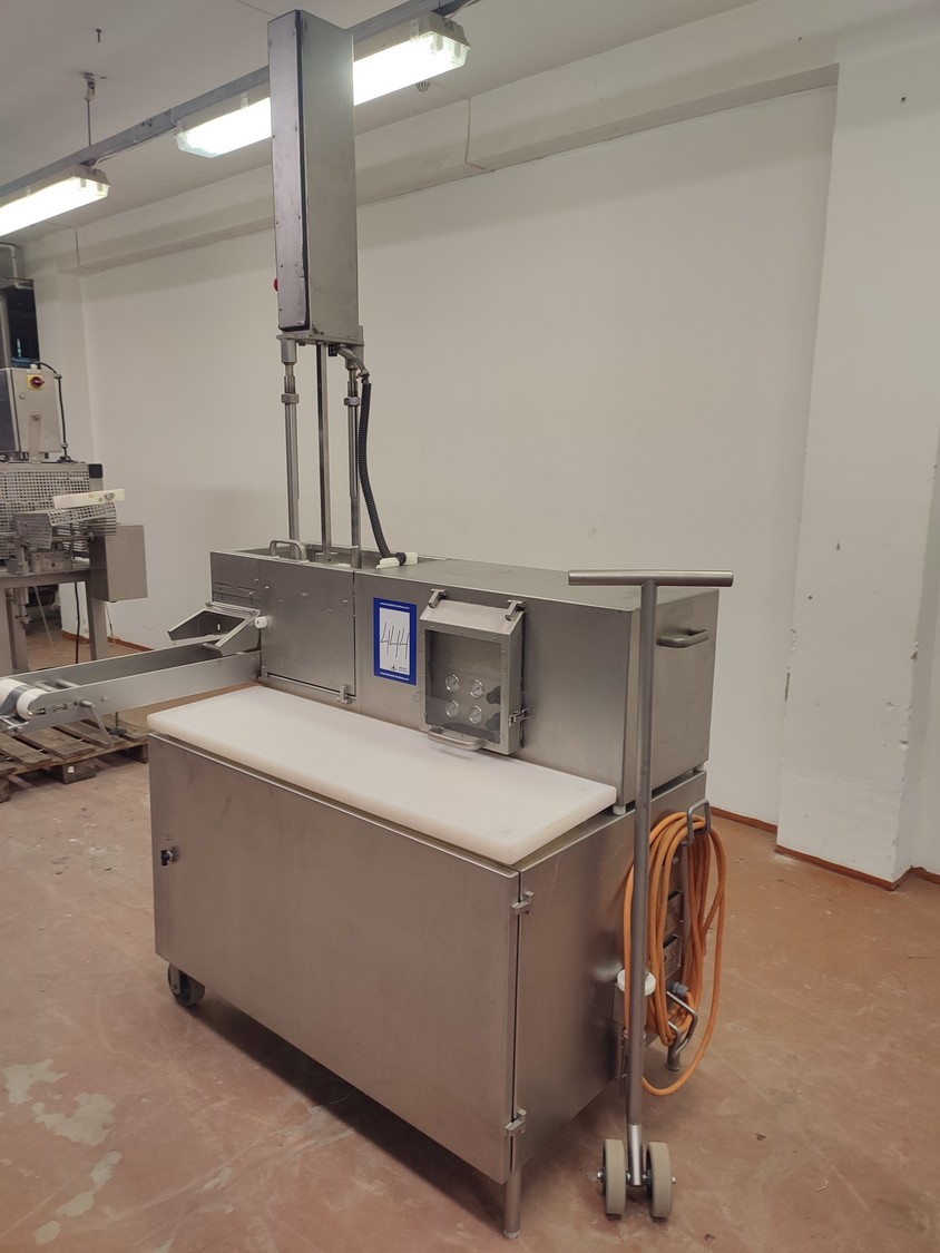 TVM mobile portioning machine, type: TVM Portio 4000, serial number: 03-01.26983 231, year of construction: 2001, 400 V, 3 Ph, 50 Hz, 2.5 A, 4-8 bar, 380 kg, dimensions: 1660 mm x 1070 mm x 2510 mm. Incomplete, missing mould and outfeed belt.