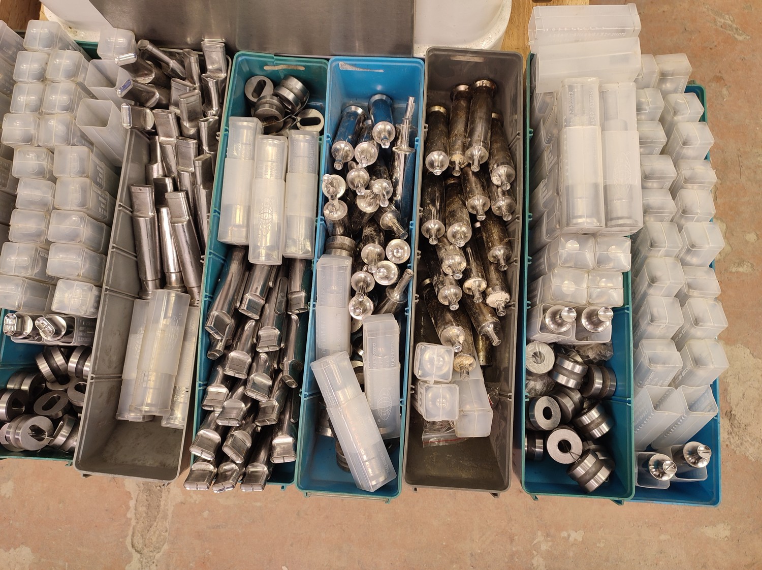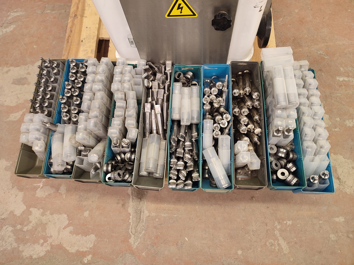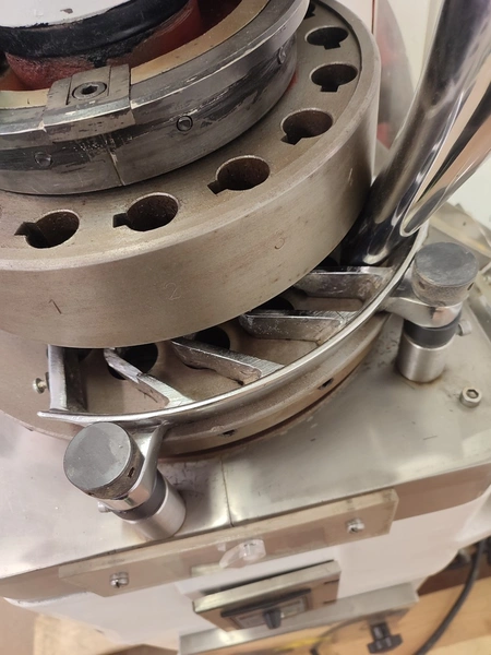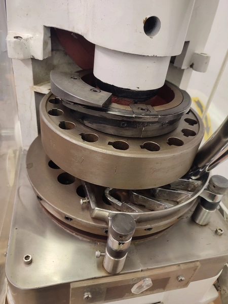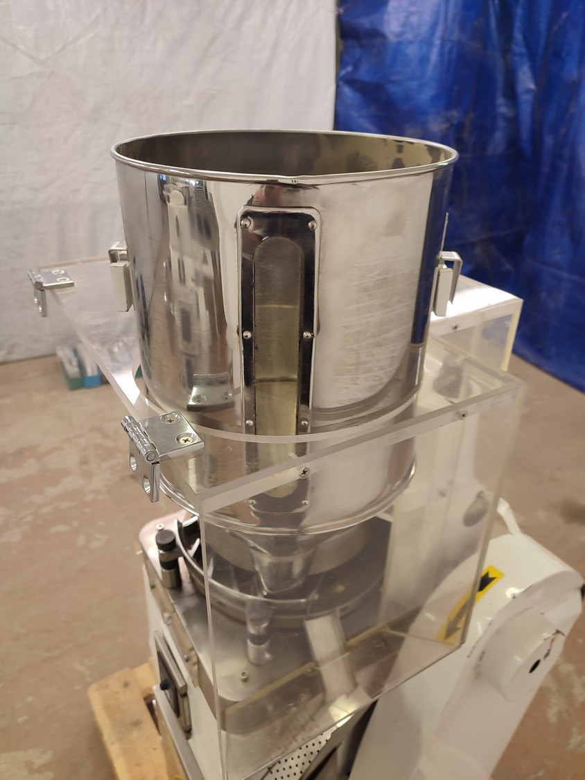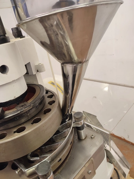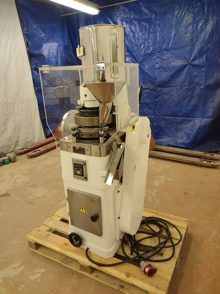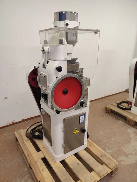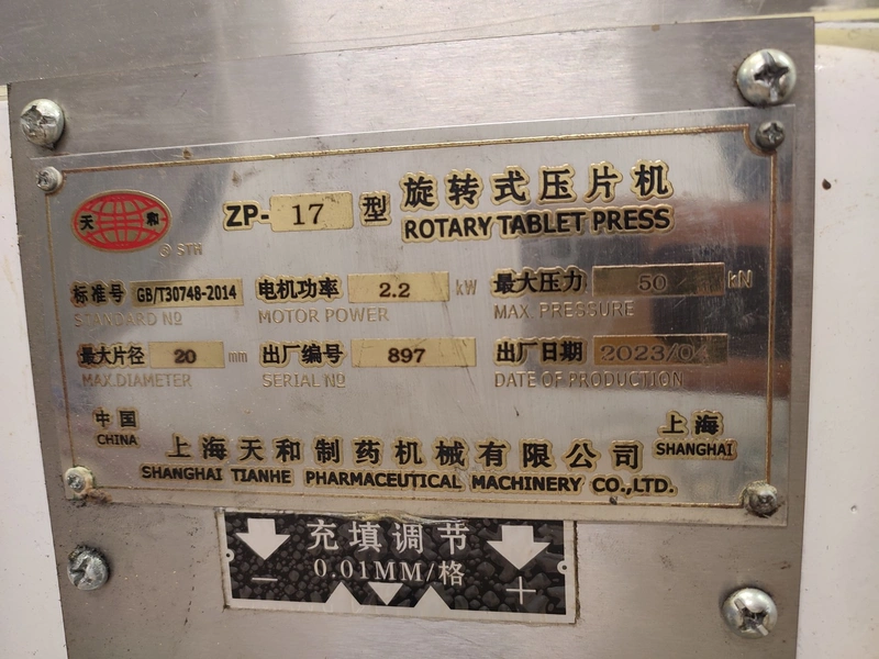 Shanghai Tianhe Pharmaceutical Machinery Co. Ltd rotary tablet press, model: ZP-17, serial number: 897, year of construction: 04.2023, 2.2 kW, max. pressure: 50 kN, max. diameter: 20 mm, dimensions: 650 mm x 720 mm x 1530 mm. Including extra tablet press forms.