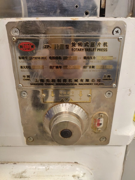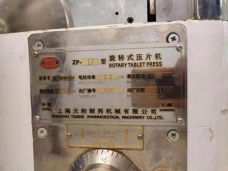 Shanghai Tianhe Pharmaceutical Machinery Co. Ltd rotary tablet press, model: ZP-17, serial number: 890, year of construction: 06.2021, 2.2 kW, max. pressure: 50 kN, max. diameter: 20 mm, dimensions: 1000 mm x 1200 mm x 1350 mm. Incomplete, for spare parts.