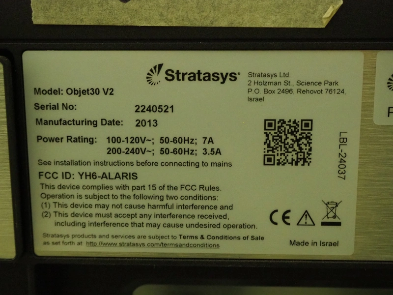 Stratasys Ltd. 3D printer, model: Objet30 V2, serial number: 2240521, year of construction: 2013, 100-120/200-240 V, 50-60 Hz, 7/3.5 A, dimensions: 830 mm x 620 mm x 600 mm.
