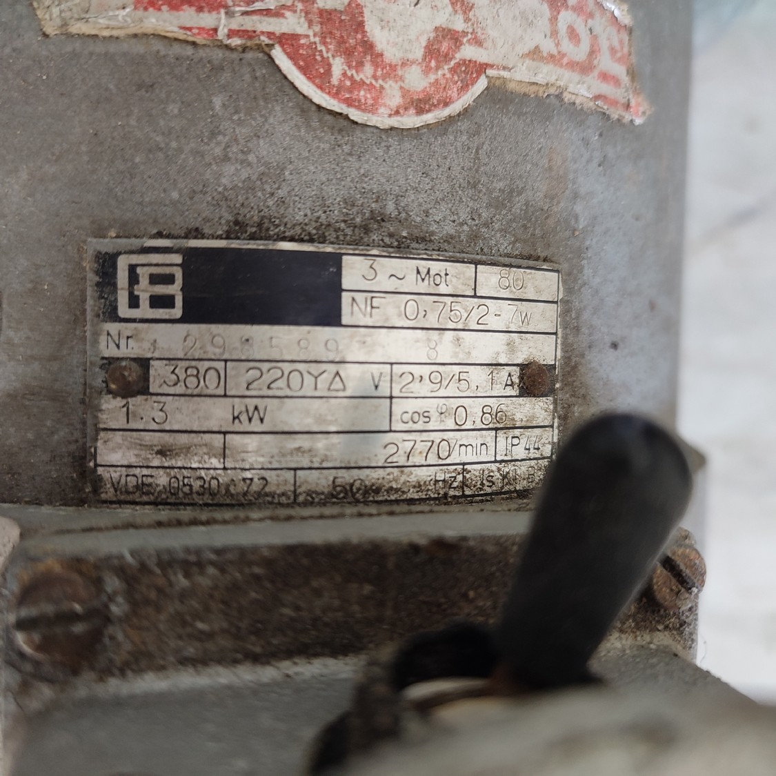 CB breaking saw, type: NF 0.75/2-7w, serial number: 298589, 380/220 V, 50 Hz, 2.9/5.1A, 1300 W, 2770 rpm, dimensions: 750 mm x 300 mm x 250 mm.
