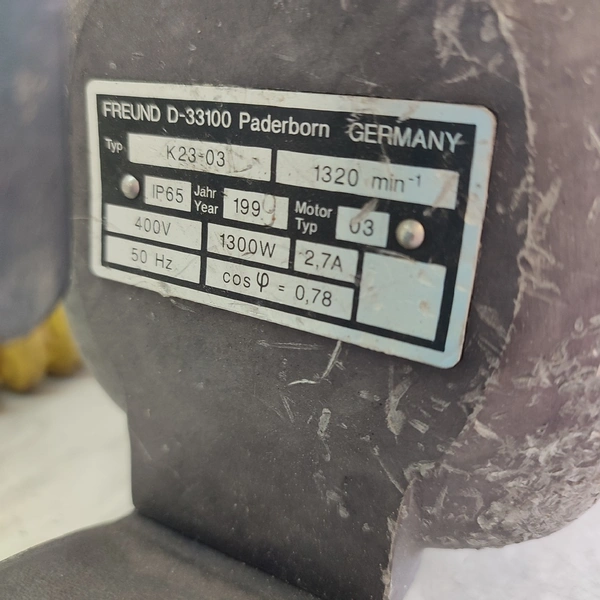 Freund breaking saw, type: K 23-03, year of construction: 1999, 400 V, 50 Hz, 2.7 A, 1300 W, 1320 rpm, dimensions: 660 mm x 180 mm x 170 mm. Without blade.
