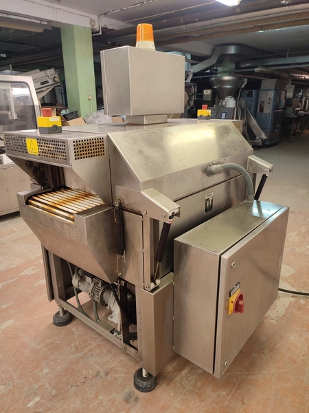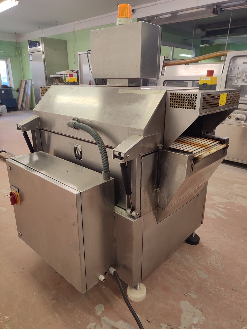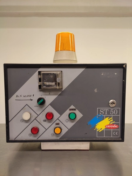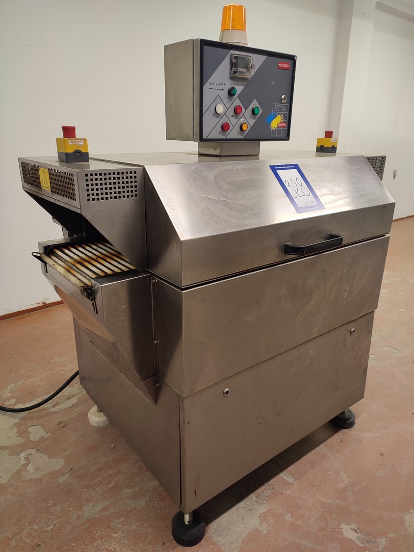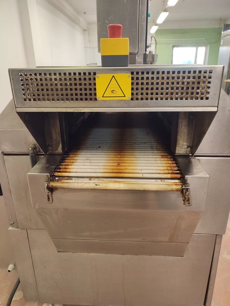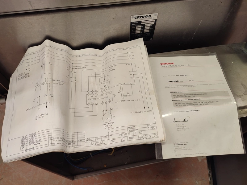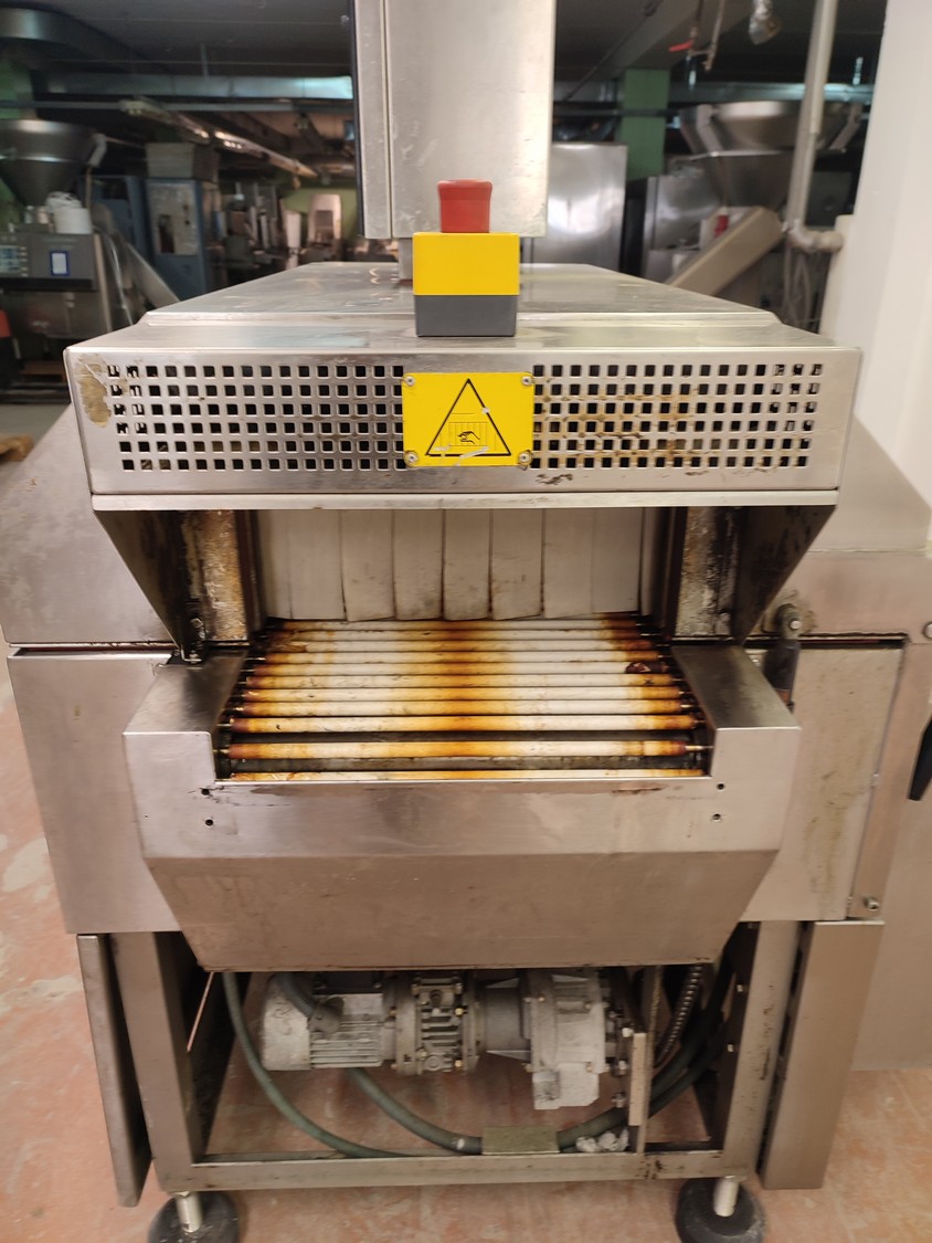 Cryovac shrink tunnel, model number: ST 50 LH, serial number: A52400109, year of construction: 1997, 380 V, 50 Hz, 16 A, 10 kW, clearance: 400 mm x 180 mm, plastic rollers, rollers width: 400 mm, total dimensions: 1400 mm x 1300 mm x 1850 mm.