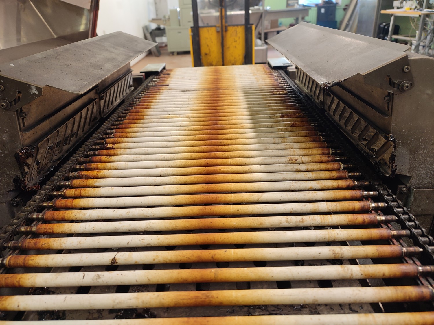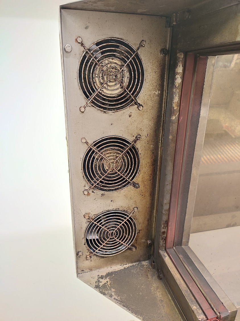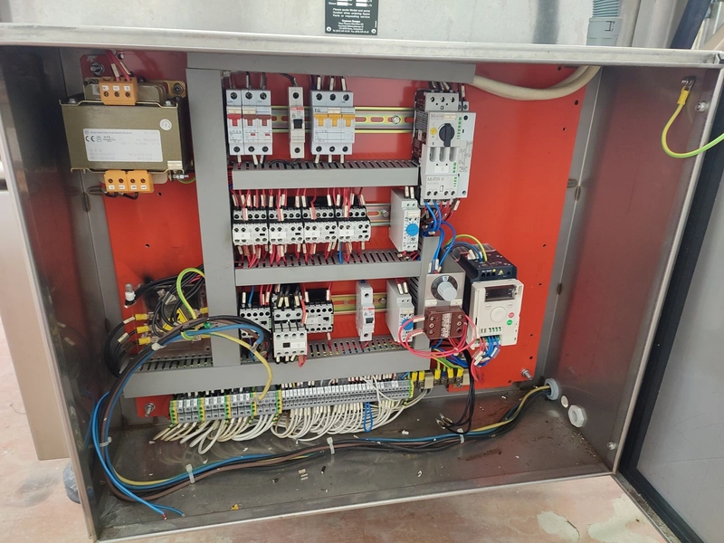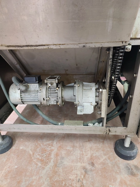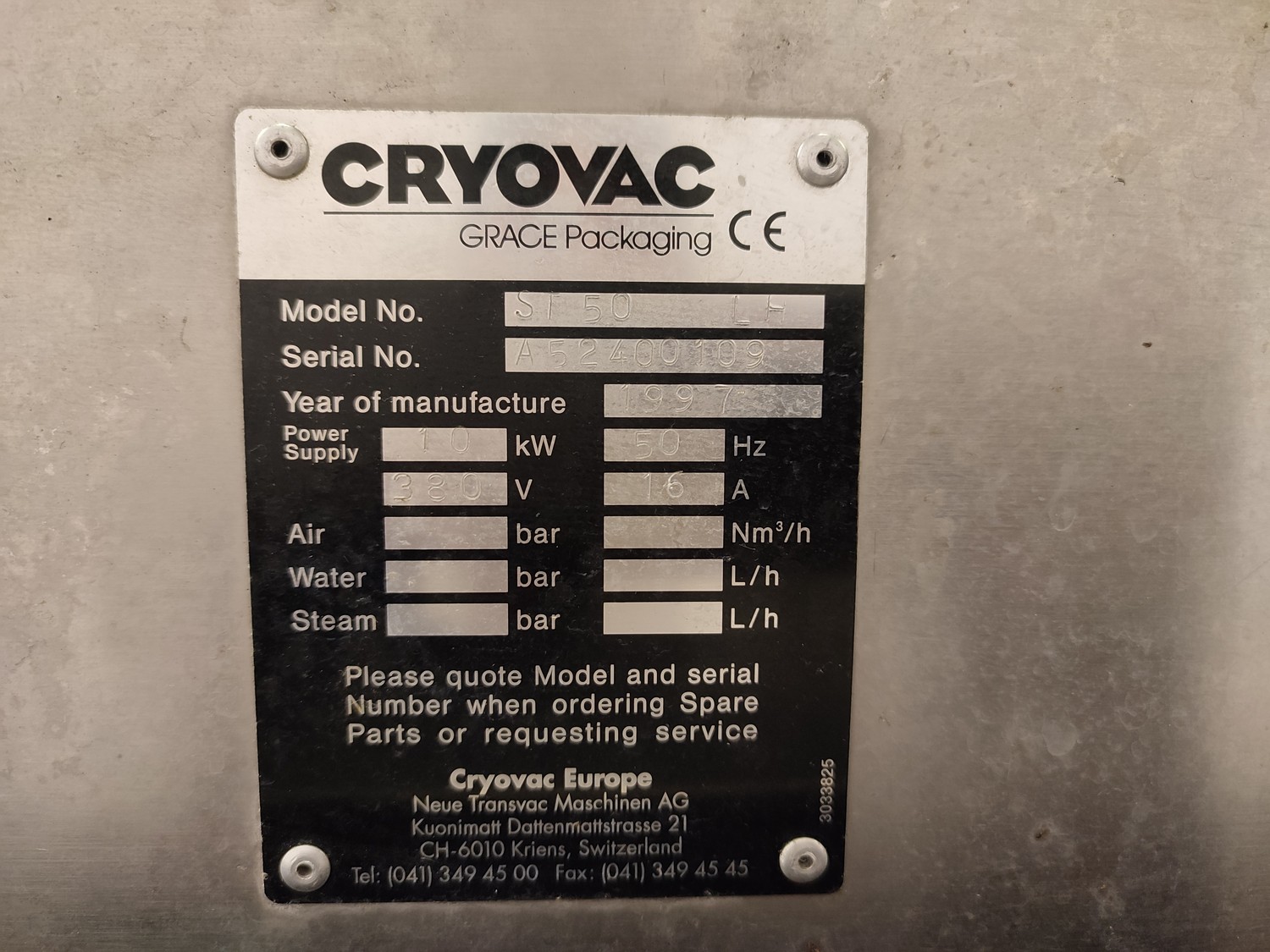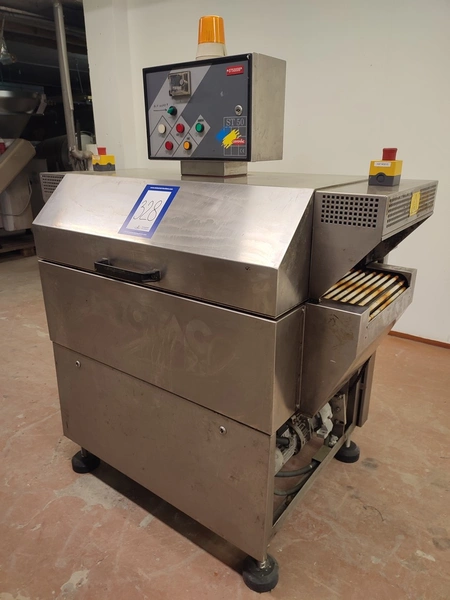 Cryovac shrink tunnel, model number: ST 50 LH, serial number: A52400109, year of construction: 1997, 380 V, 50 Hz, 16 A, 10 kW, clearance: 400 mm x 180 mm, plastic rollers, rollers width: 400 mm, total dimensions: 1400 mm x 1300 mm x 1850 mm.