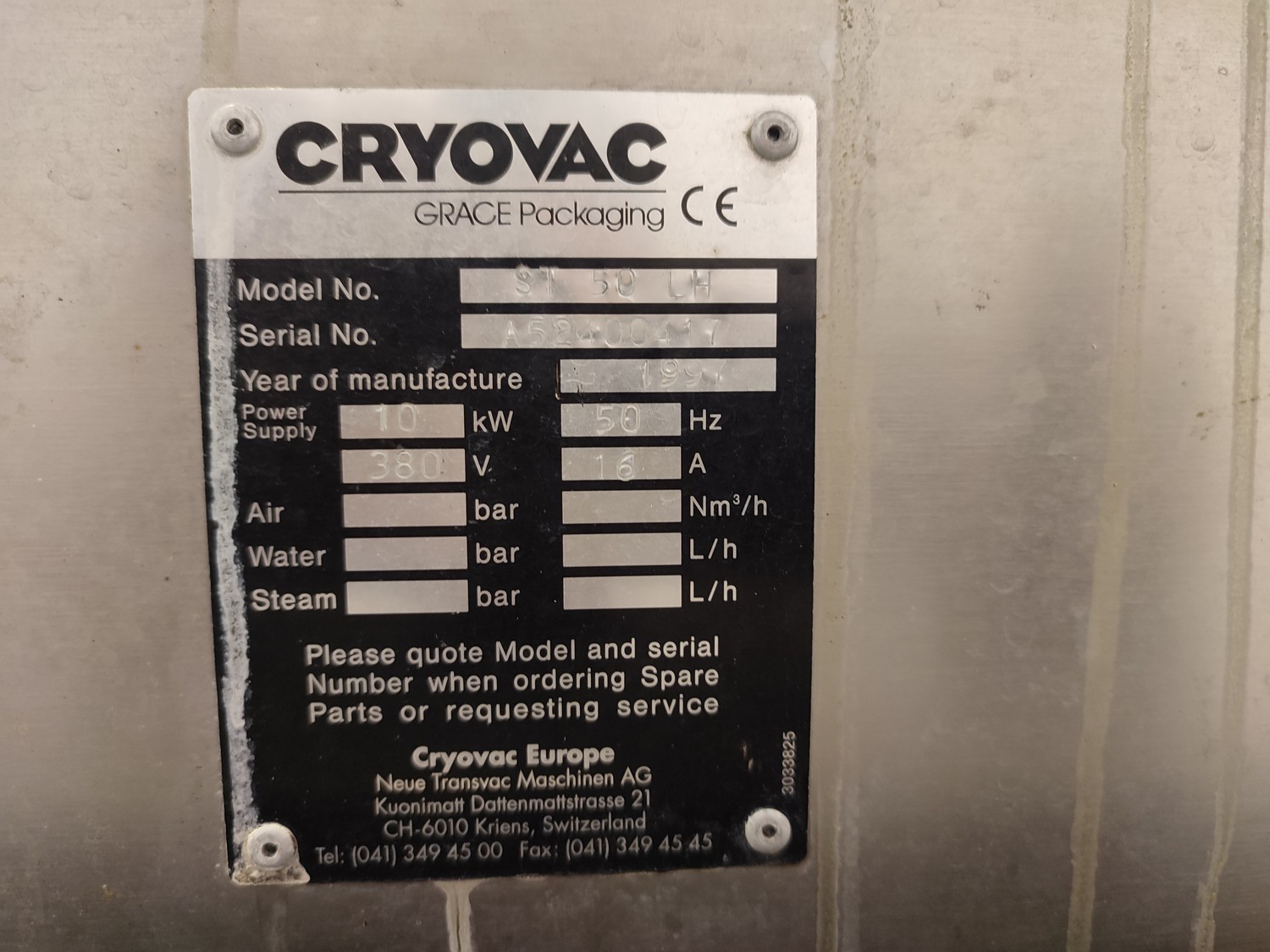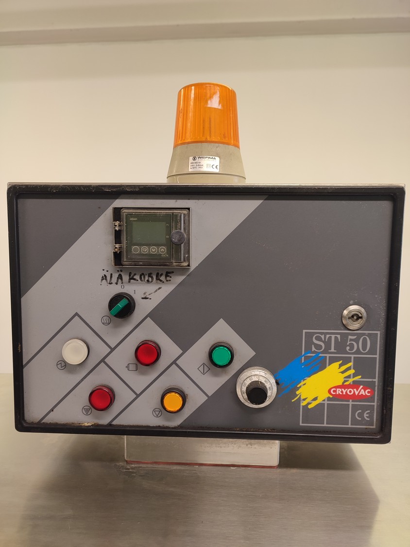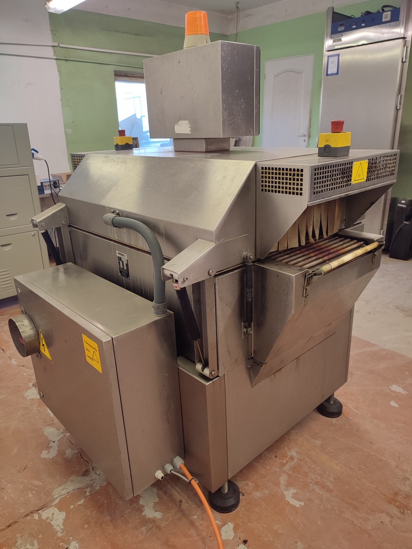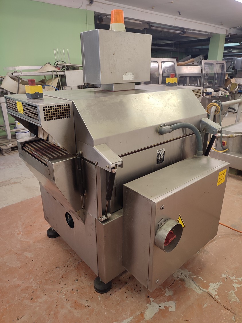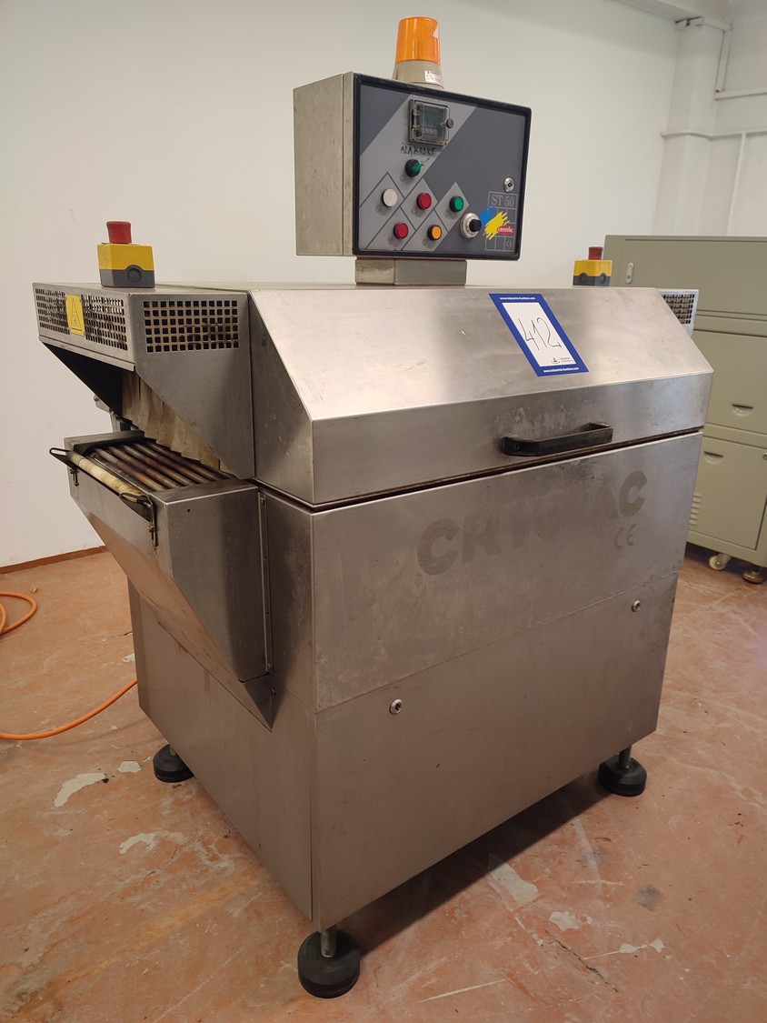 Cryovac shrink tunnel, model number: ST 50 LH, serial number: A52400417, year of construction: 1997, 380 V, 50 Hz, 16 A, 10 kW, clearance: 400 mm x 180 mm, plastic rollers, rollers width: 400 mm, total dimensions: 1400 mm x 1300 mm x 1850 mm.