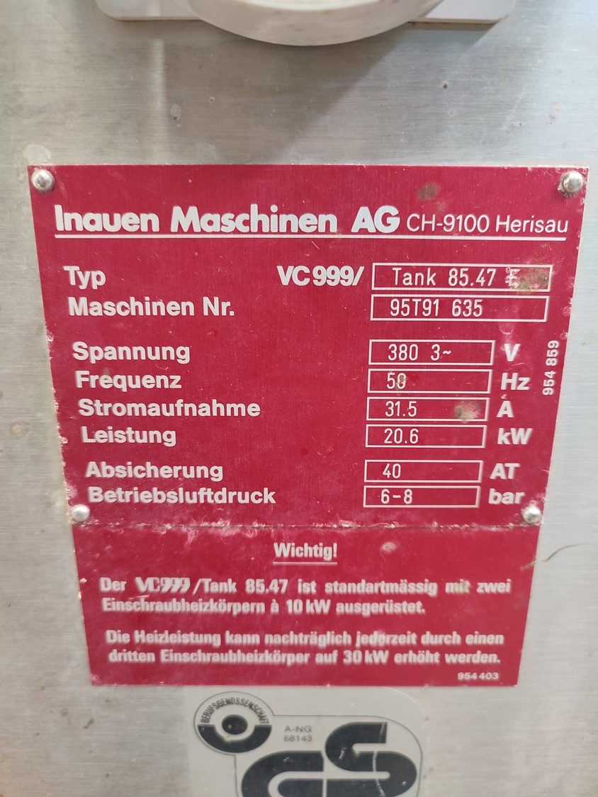 Inauen Maschinen AG mobile dip tank, type: VC999/TANK 85.47 E, machine number: 95T91 635, 380 V, 3 Ph, 50 Hz, 20.6 kW, 31.5 A, pressure: 6-8 bar, s/s rollers, roller width: (2x) 470 mm, inside dimensions: 1000 mm x 470 mm x 350 mm, dip tank dimensions: 1300 mm x 1100 mm x 1660 mm. Including s/s drip table,dimensions: 1000 mm x 600 mm x 750 mm.