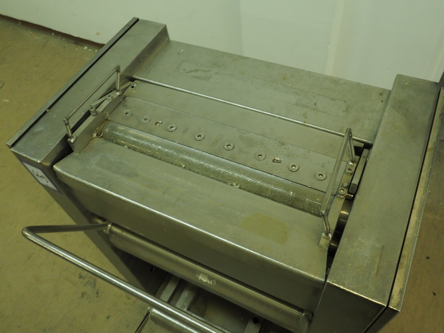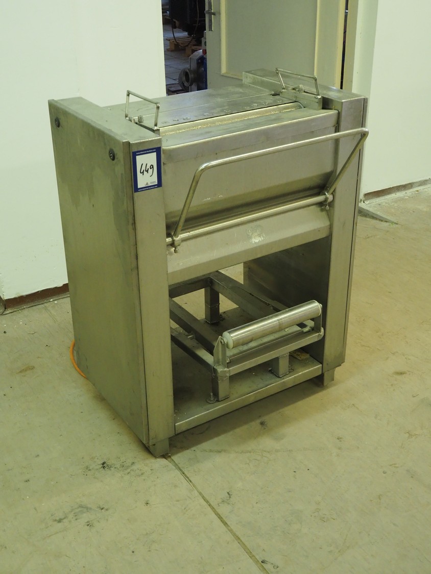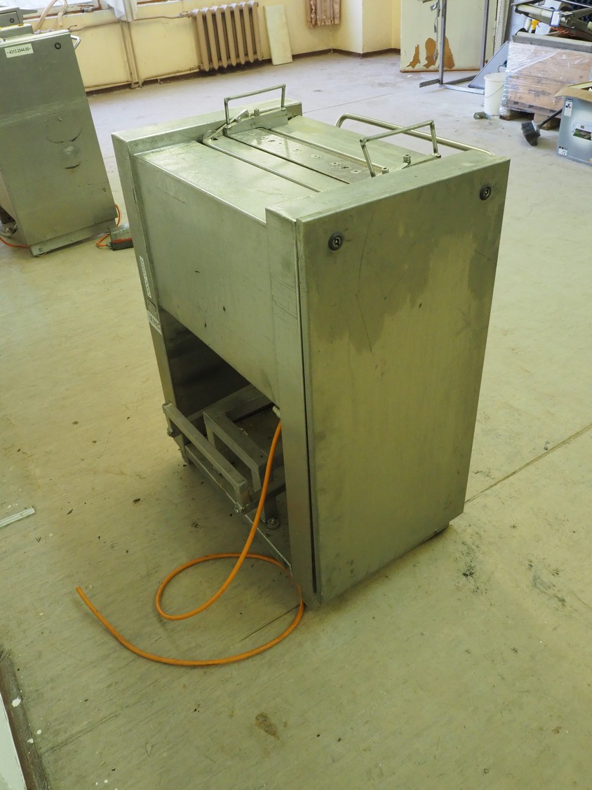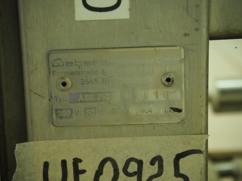 Weber Maschinenbau GmbH skinning machine, type: ASE 553, number: 910, 380 V, 50 Hz, 0.4 kW, working width: 500 mm, total dimensions: 760 mm x 670 mm x 990 mm.