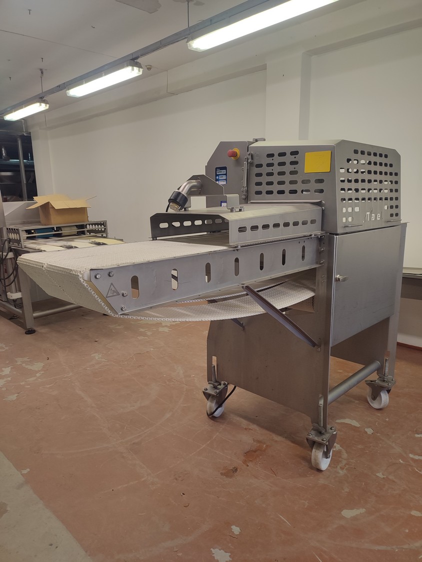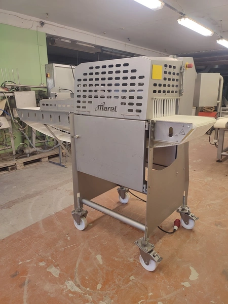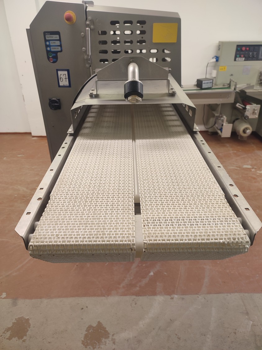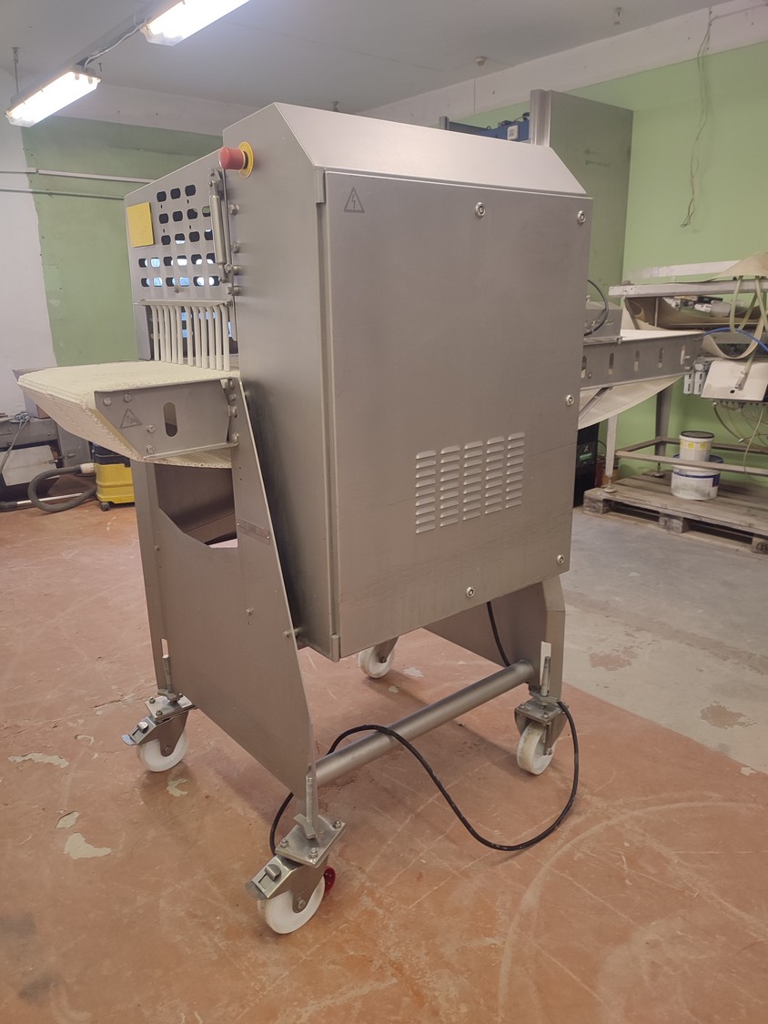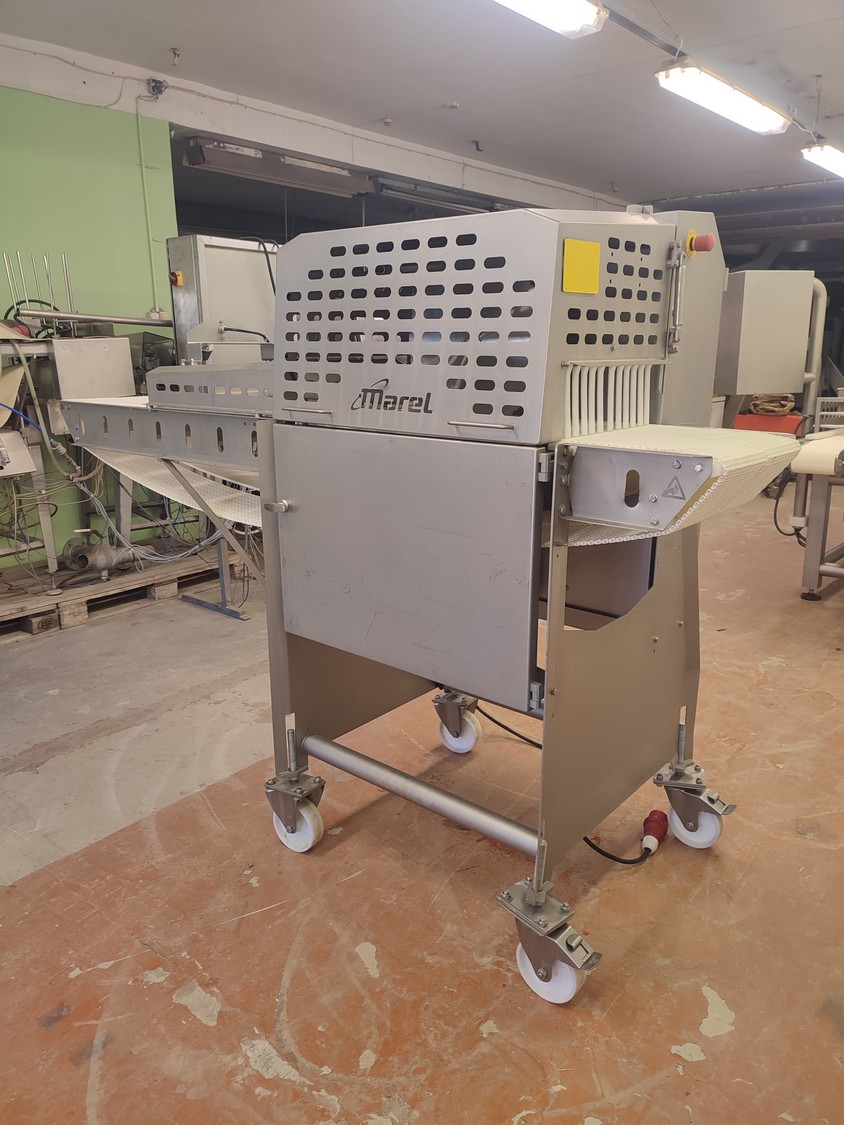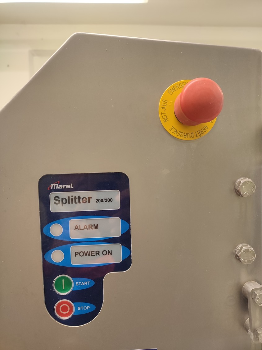 Marel A/S mobile splitting machine, type: Splitter 200/200, serial number: A040210, year of construction: 2006, 230-400 V, 3 Ph, 0.75 kW, plastic mesh belt, belt width: (2x) 200 mm , ø saw blade: 400 mm, total dimensions: 2325 mm x 900 mm x 1700 mm.