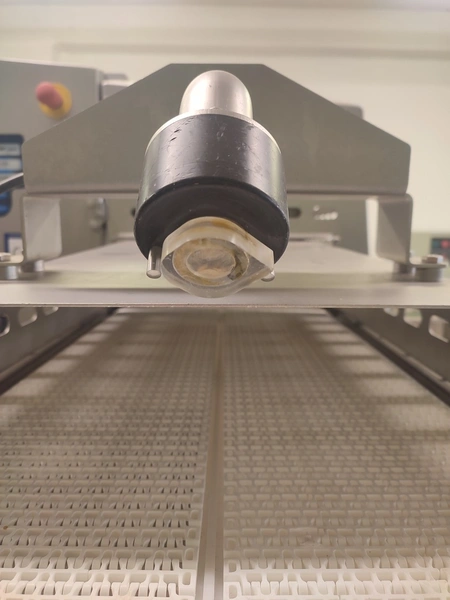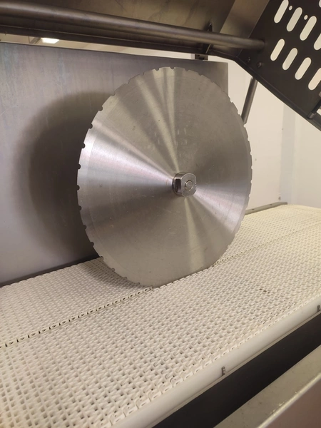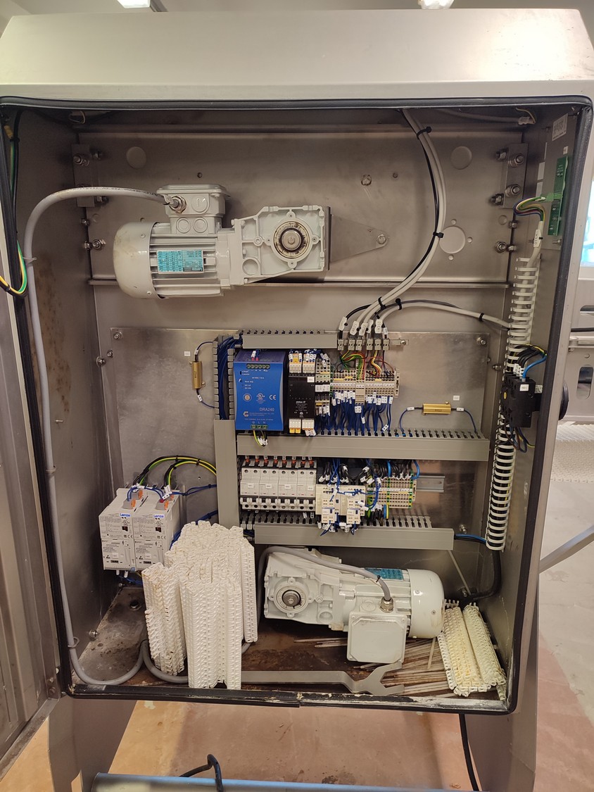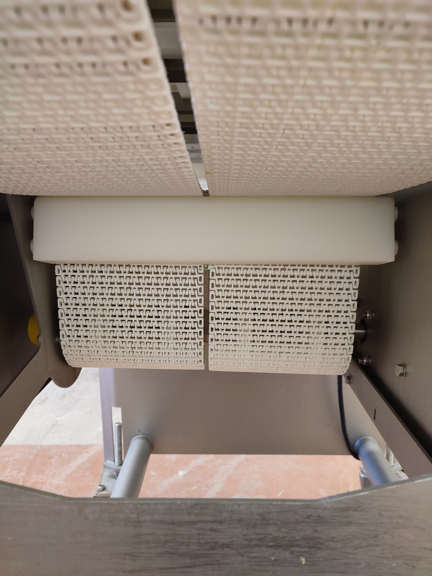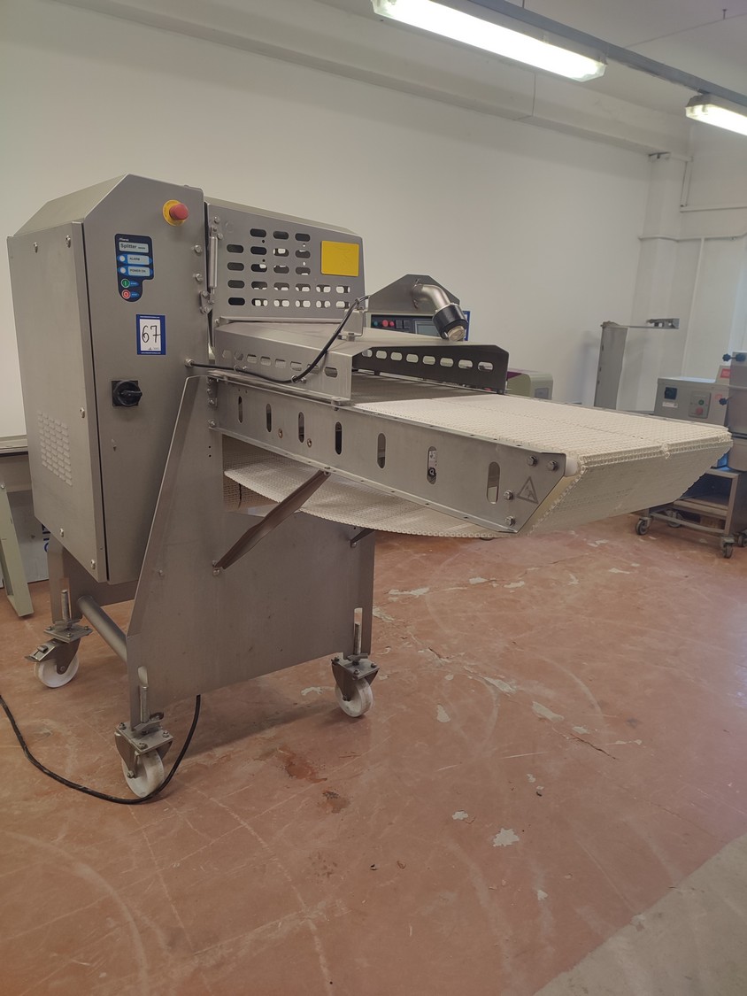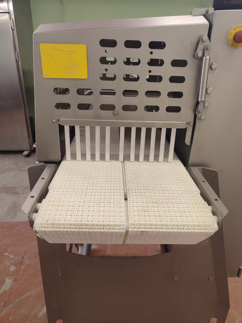 Marel A/S mobile splitting machine, type: Splitter 200/200, serial number: A040210, year of construction: 2006, 230-400 V, 3 Ph, 0.75 kW, plastic mesh belt, belt width: (2x) 200 mm , ø saw blade: 400 mm, total dimensions: 2325 mm x 900 mm x 1700 mm.