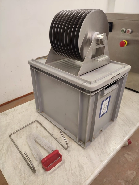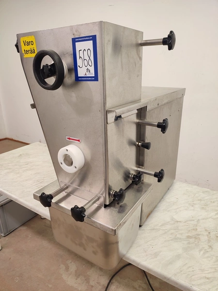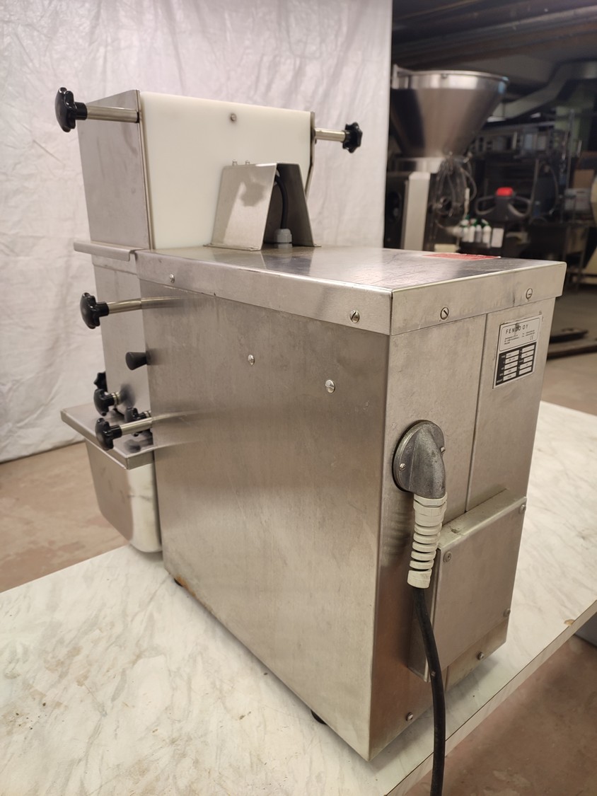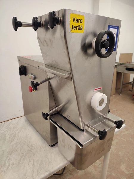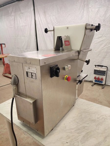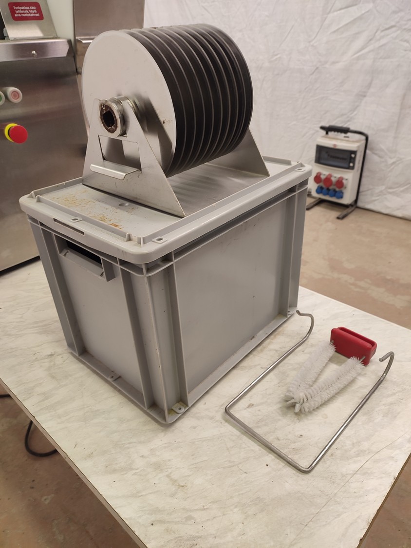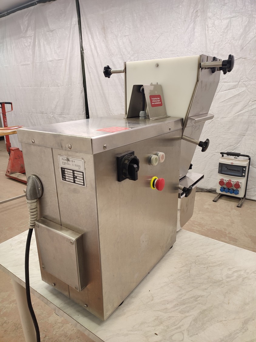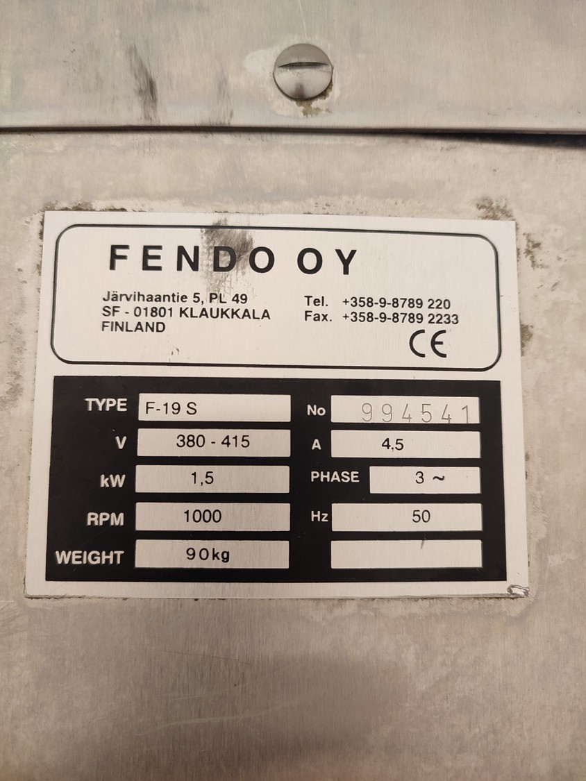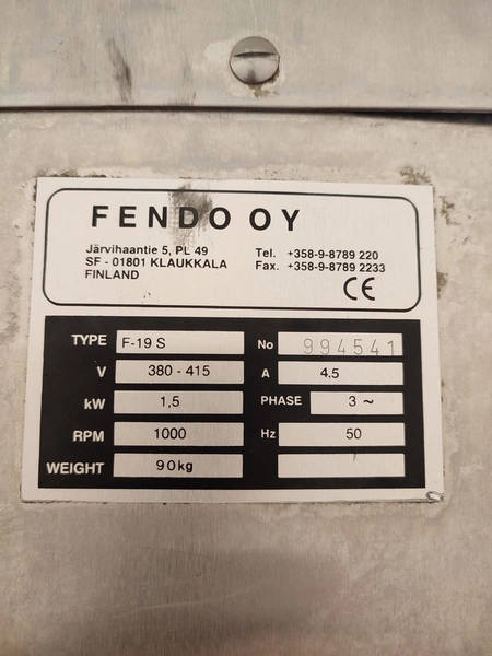 Fendo Oy strip cutter, type: F-19 S, number: 994541, 380-415 V, 3 Ph, 50 Hz, 4.5 A, 1.5 kW, weight: 90 kg, working width: 190 mm, distance between knives: 9 mm, total dimensions: 500 mm x 810 mm x 720 mm. Including a plastic box with a set of knives, distance between knives: 18 mm, box dimensions: 310 mm x 405 mm x 340 mm.