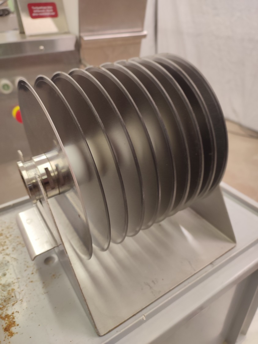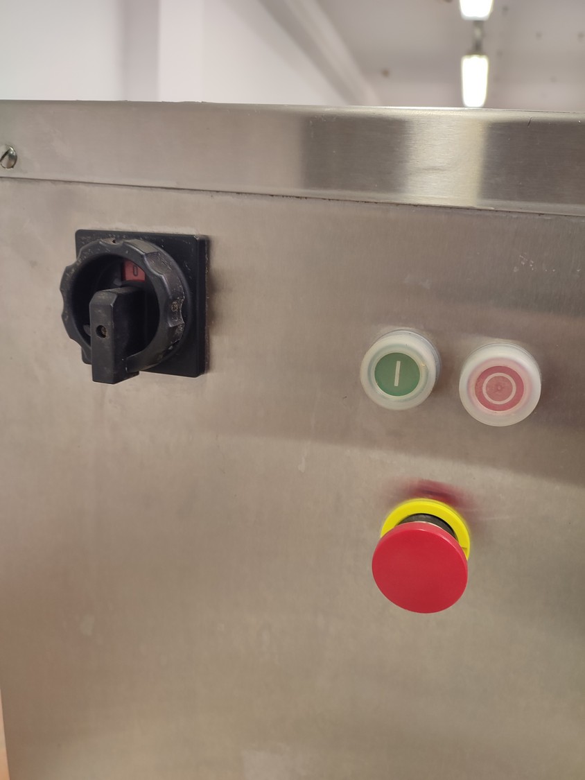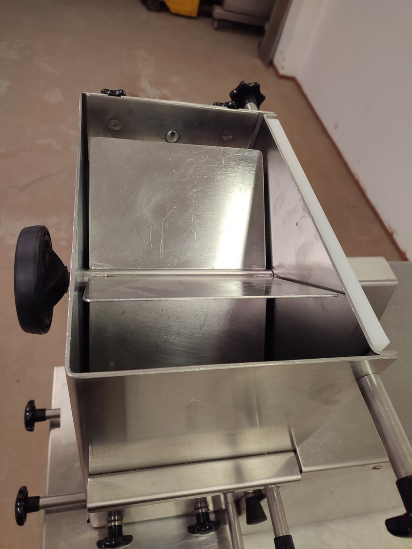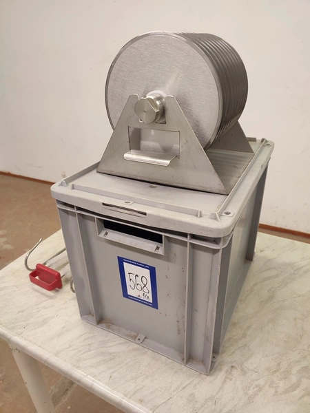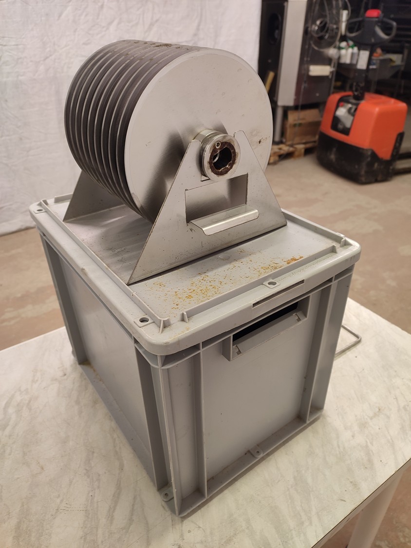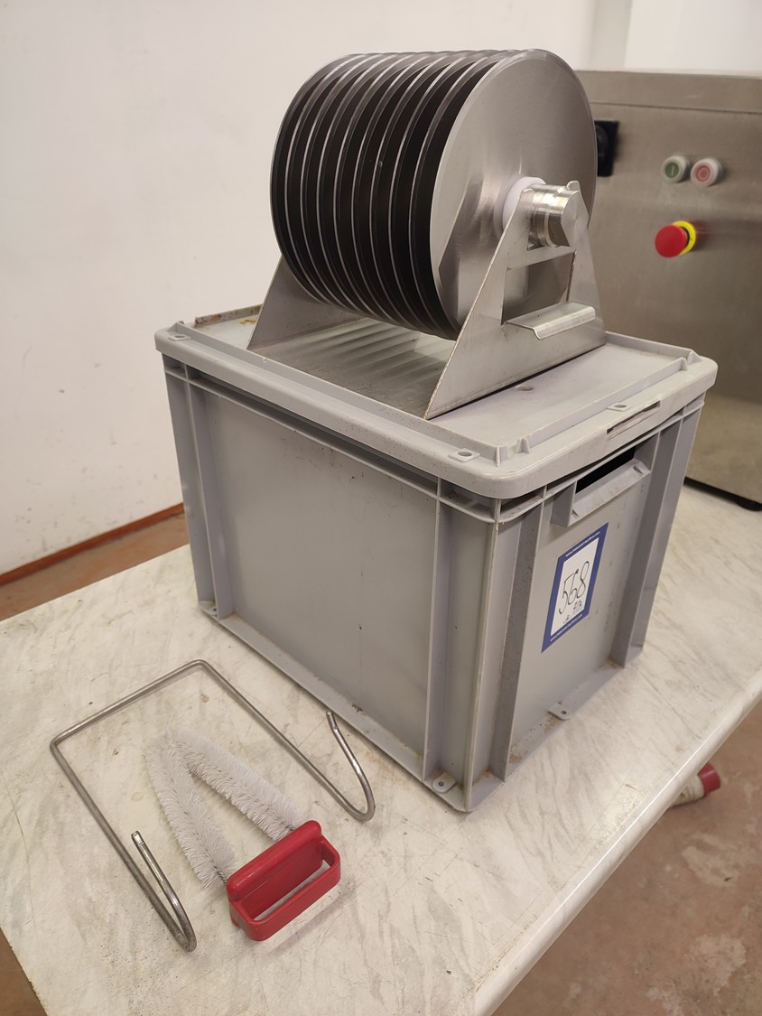 Fendo Oy strip cutter, type: F-19 S, number: 994541, 380-415 V, 3 Ph, 50 Hz, 4.5 A, 1.5 kW, weight: 90 kg, working width: 190 mm, distance between knives: 9 mm, total dimensions: 500 mm x 810 mm x 720 mm. Including a plastic box with a set of knives, distance between knives: 18 mm, box dimensions: 310 mm x 405 mm x 340 mm.