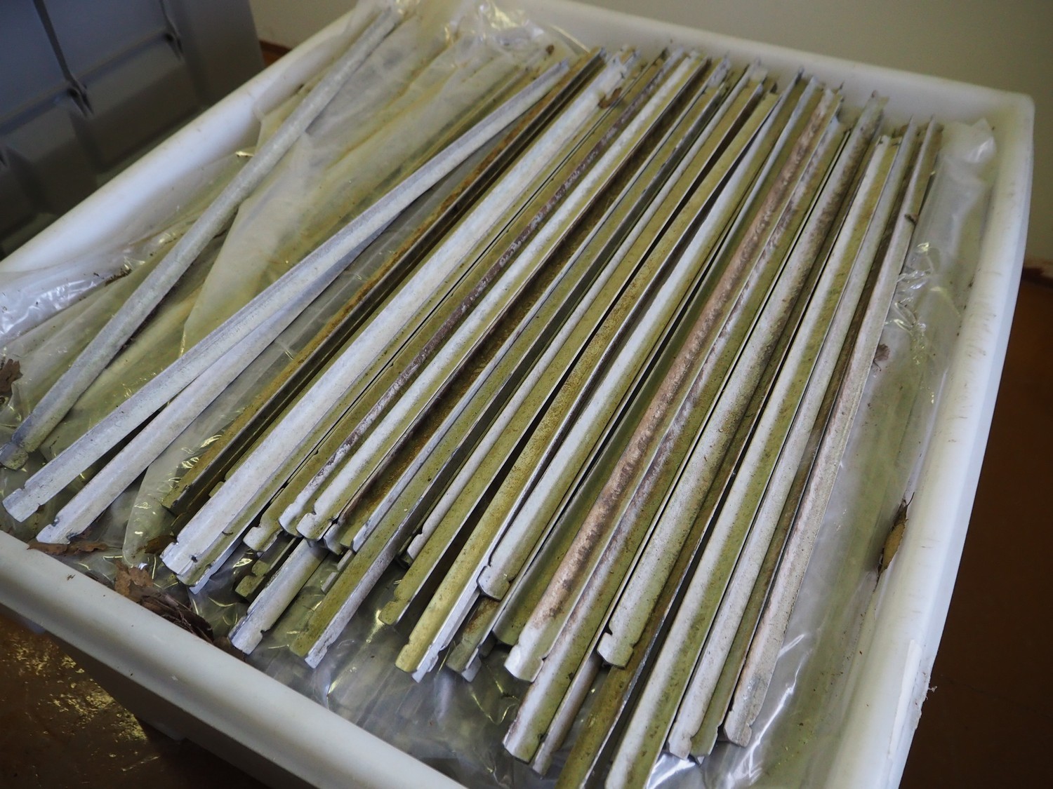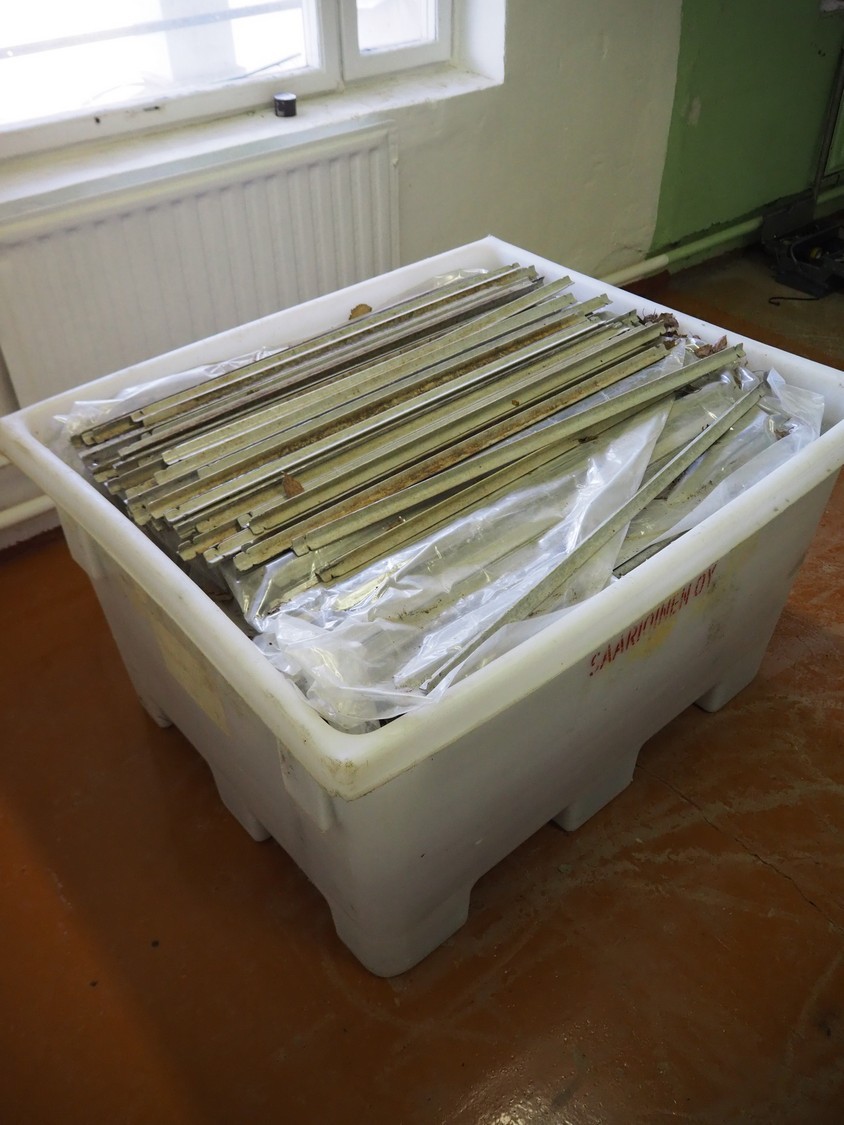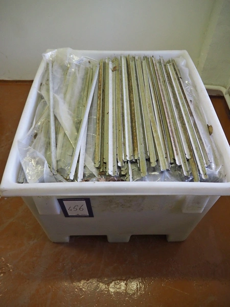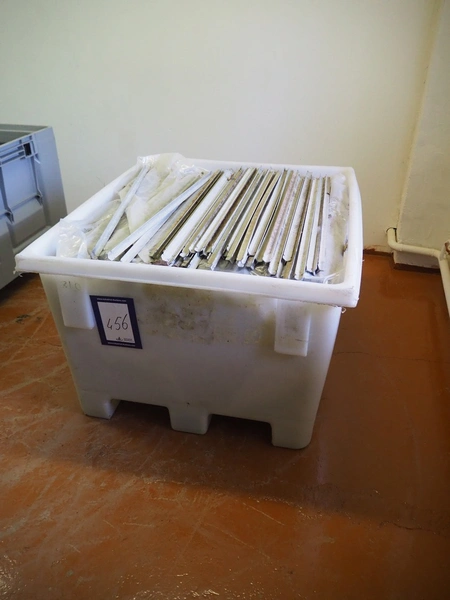 Plastic pallet box with large amount of aluminium smoke sticks, Y-profile, length: 940 mm, dimensions pallet box: 1200 mm x 1000 mm x 700 mm.