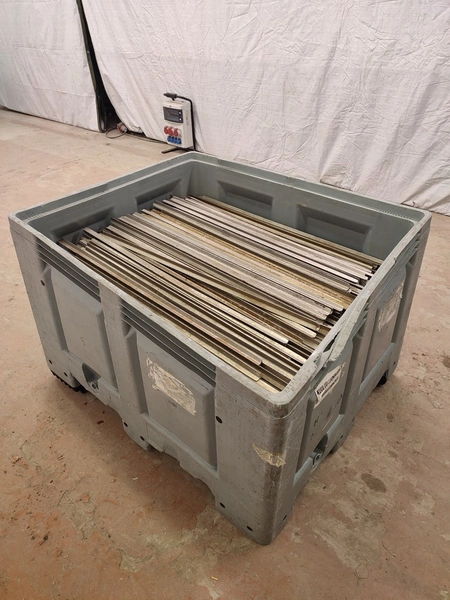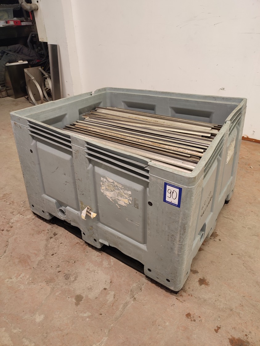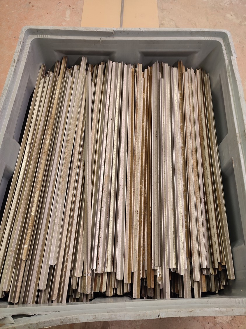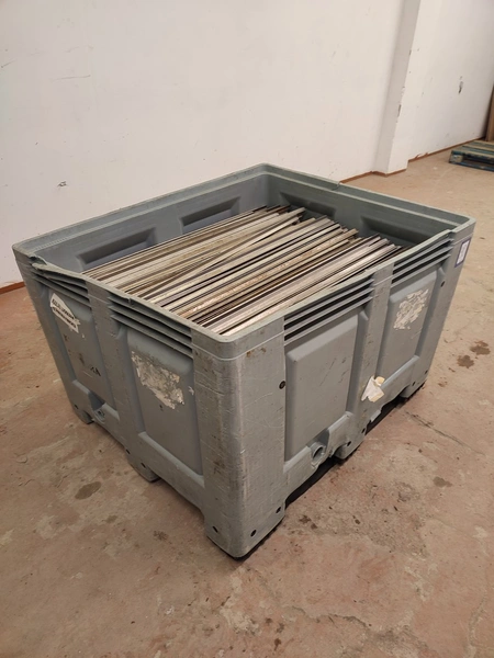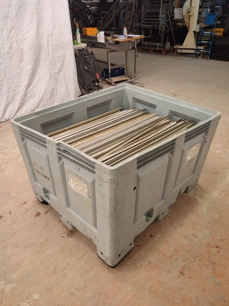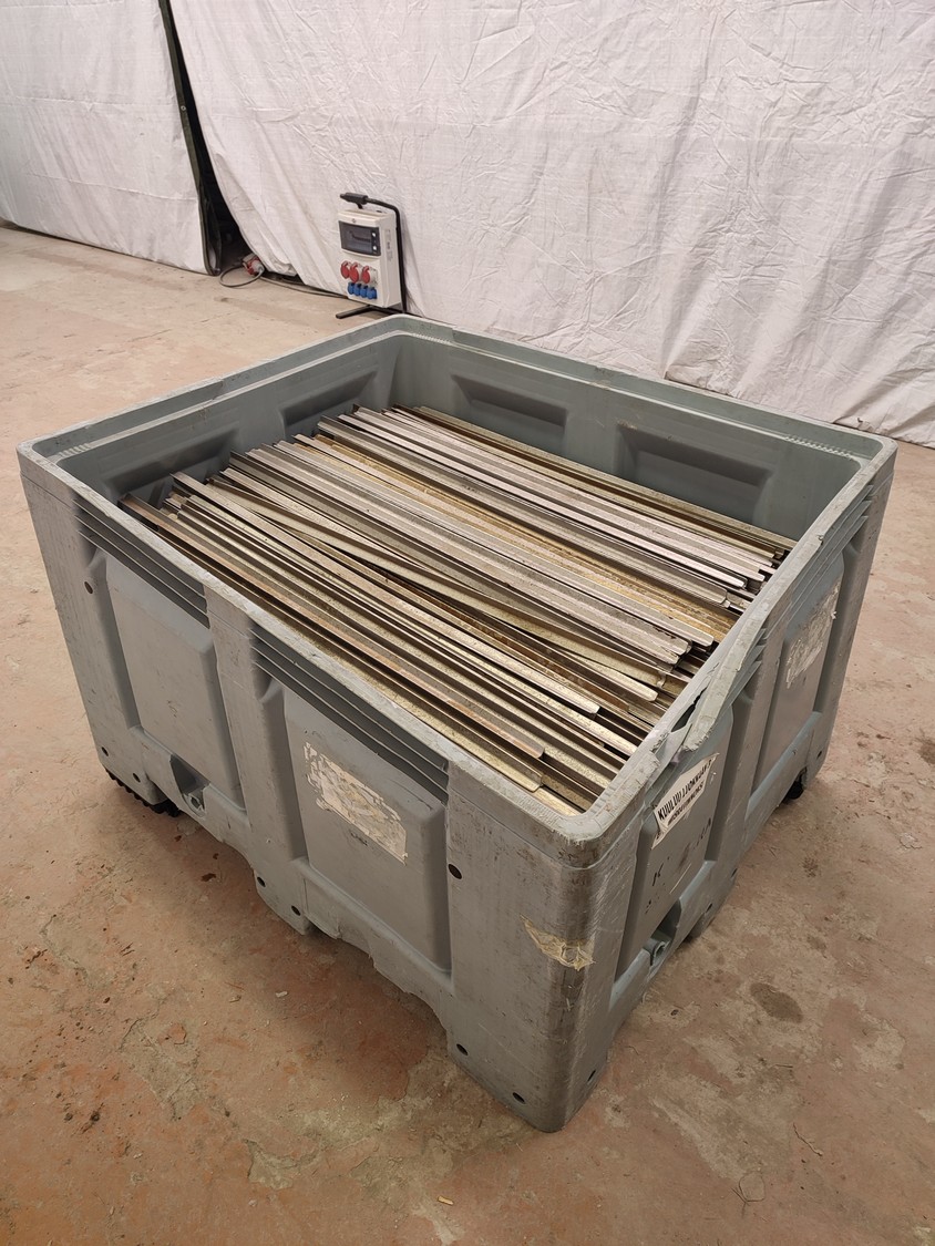 Plastic pallet box with large amount of aluminium smoke sticks, Y-shaped, length: 1000 mm, dimensions pallet box: 1200 mm x 1000 mm x 800 mm.