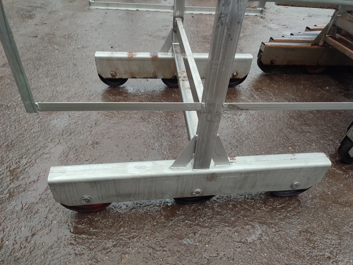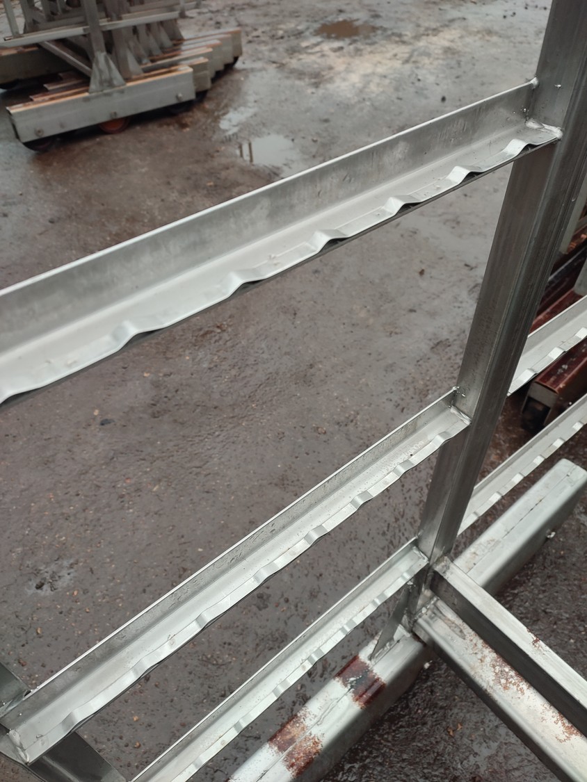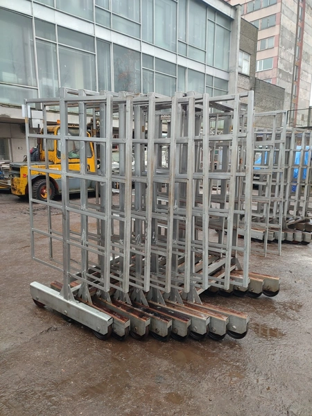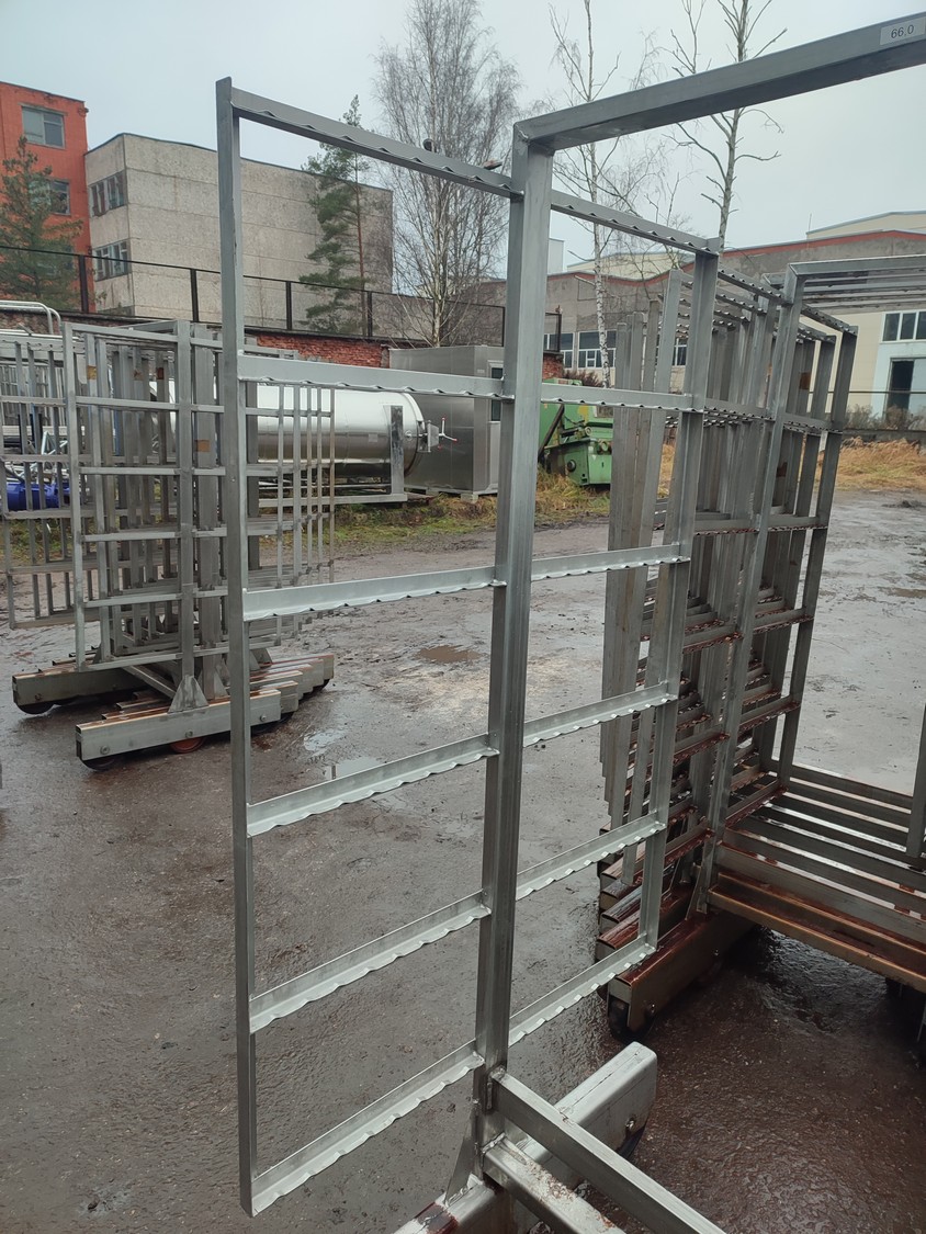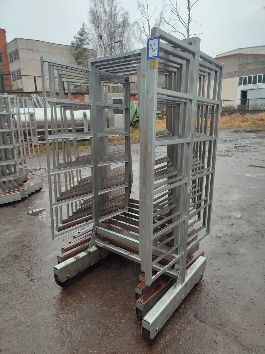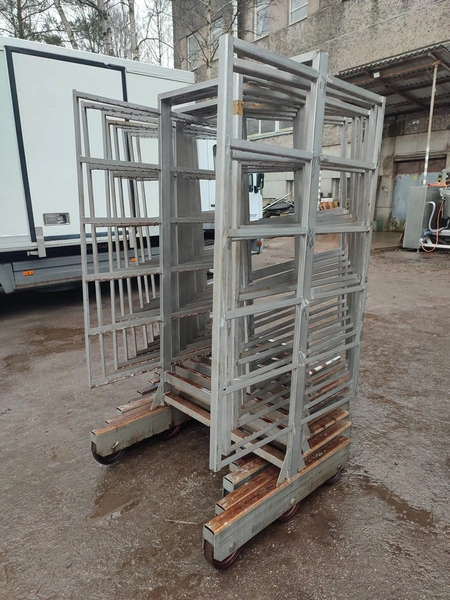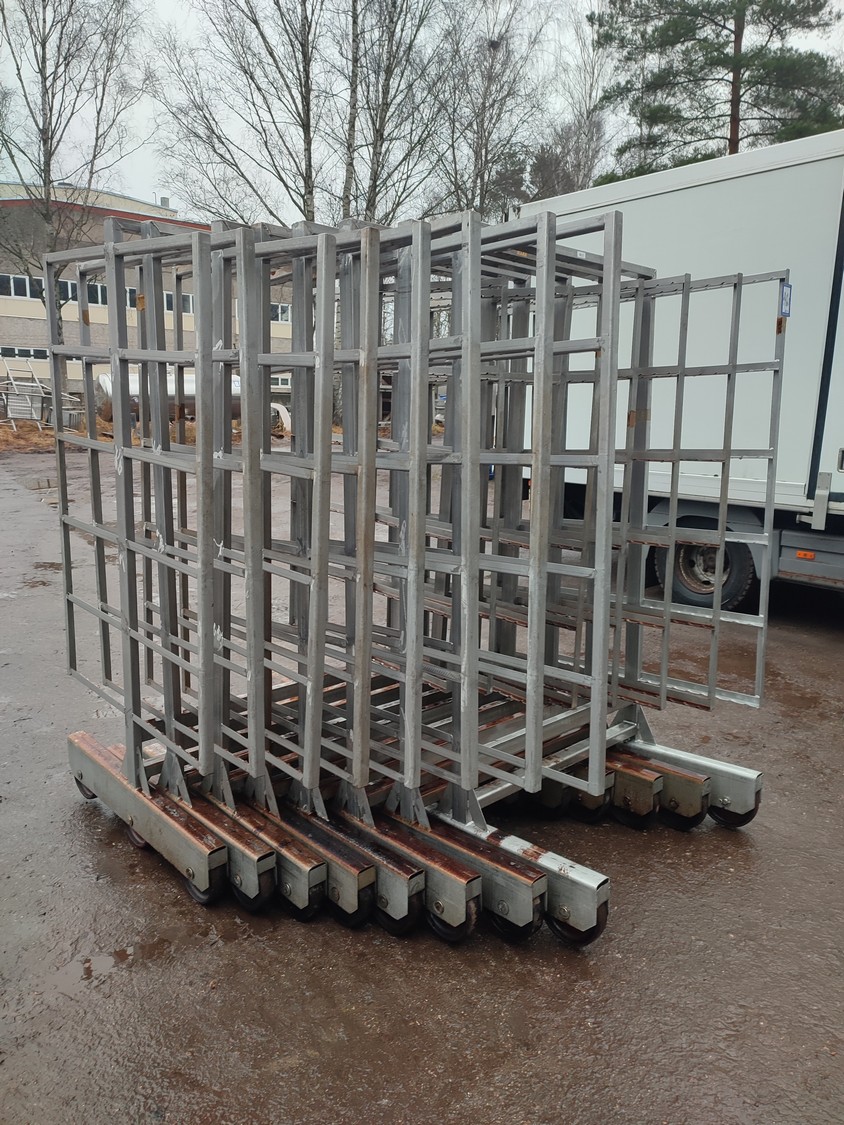 8 s/s smoke trolleys, 6 floors each, dimensions each floor: 1005 mm x 995 mm, total dimensions: (10x) 1010 mm x 1000 mm x 1995 mm.