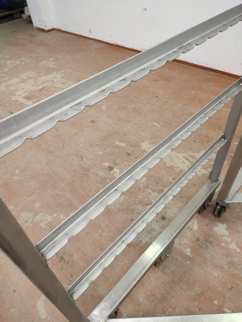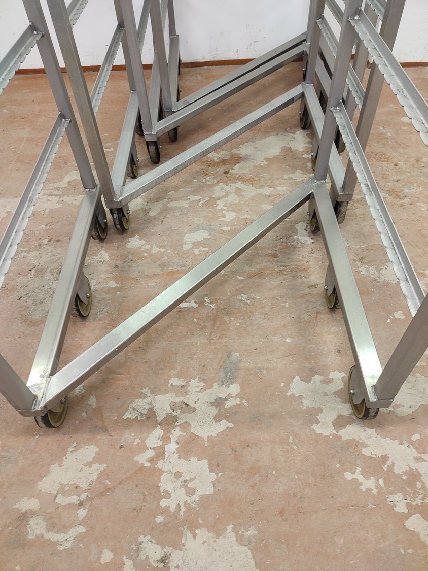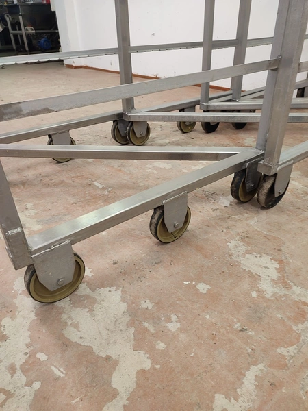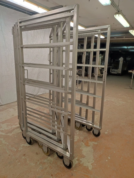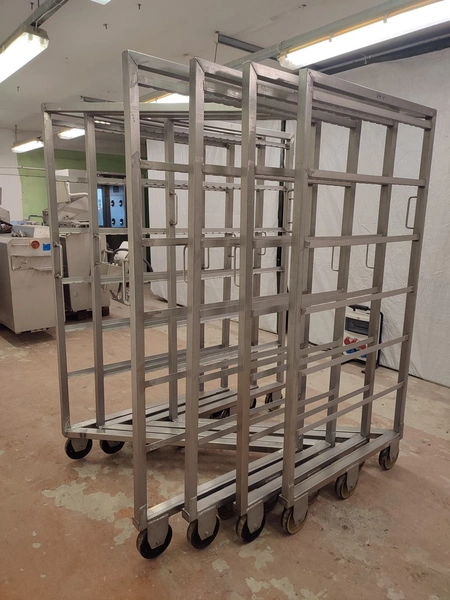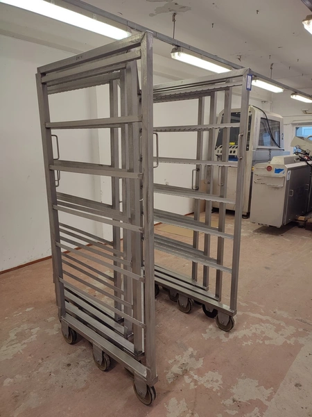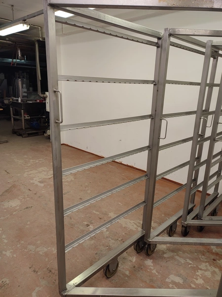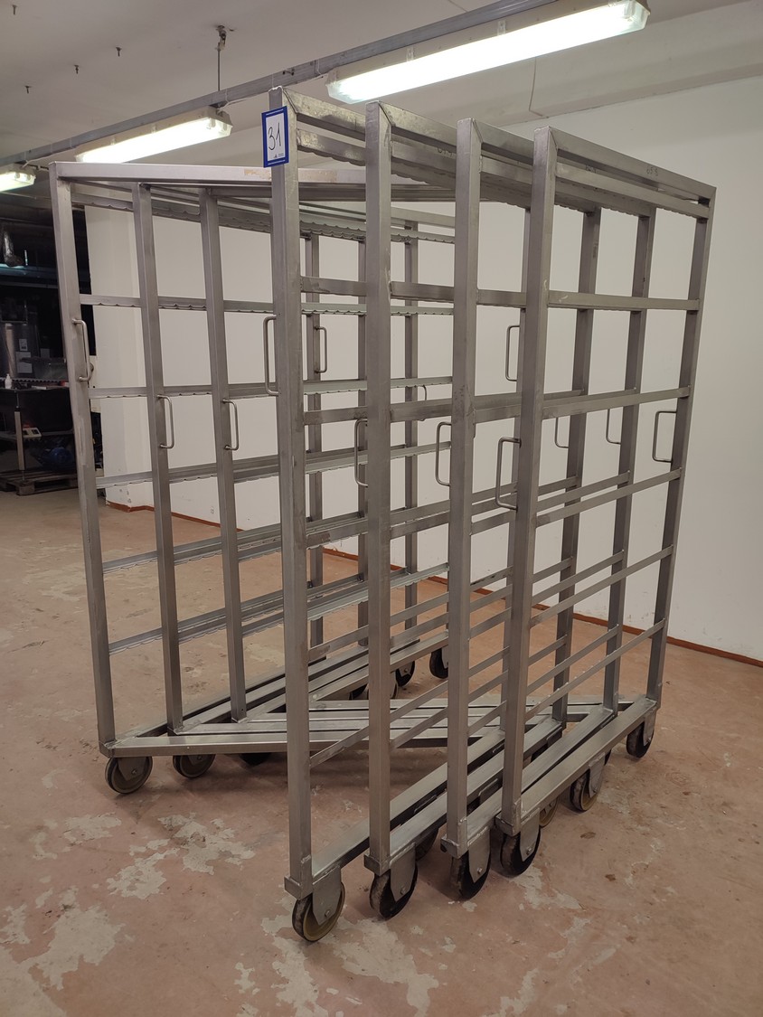 4 s/s smoke trolleys, 6 floors each, dimensions each floor: 995 mm x 920 mm, total dimensions: (4x) 1000 mm x 1000 mm x 2000 mm.
