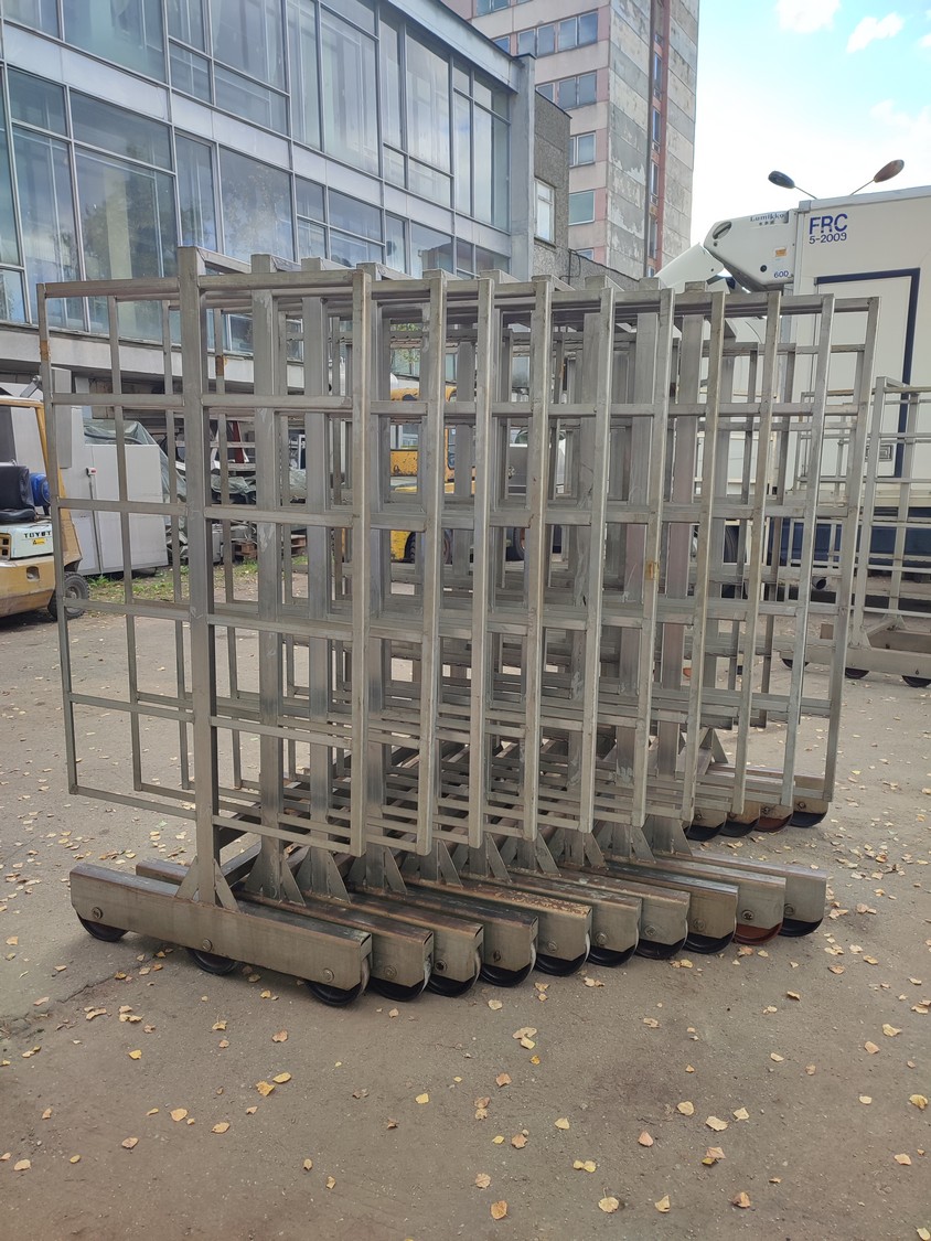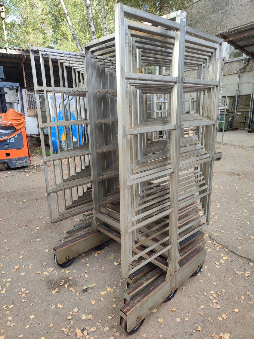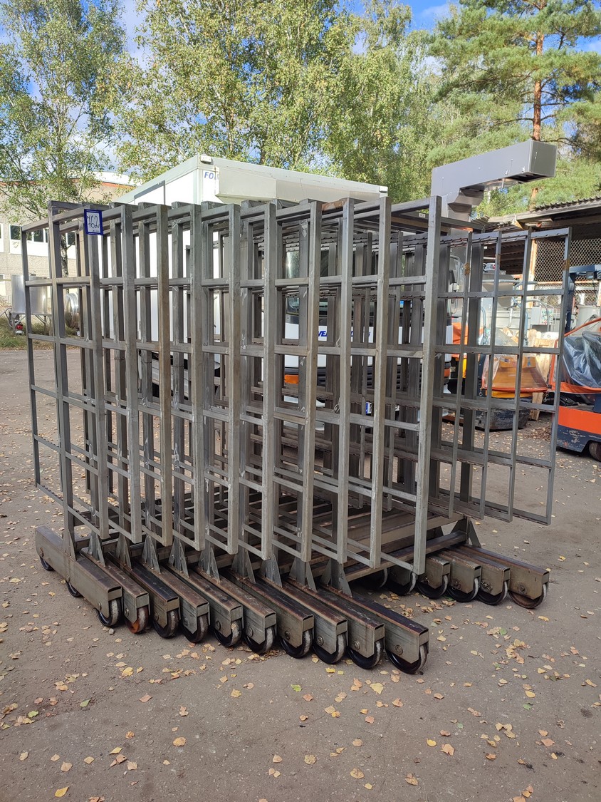10 s/s smoke trolleys, 6 floors each, dimensions each floor: 1005 mm x 995 mm, total dimensions: (10x) 1015 mm x 1000 mm x 2005 mm.