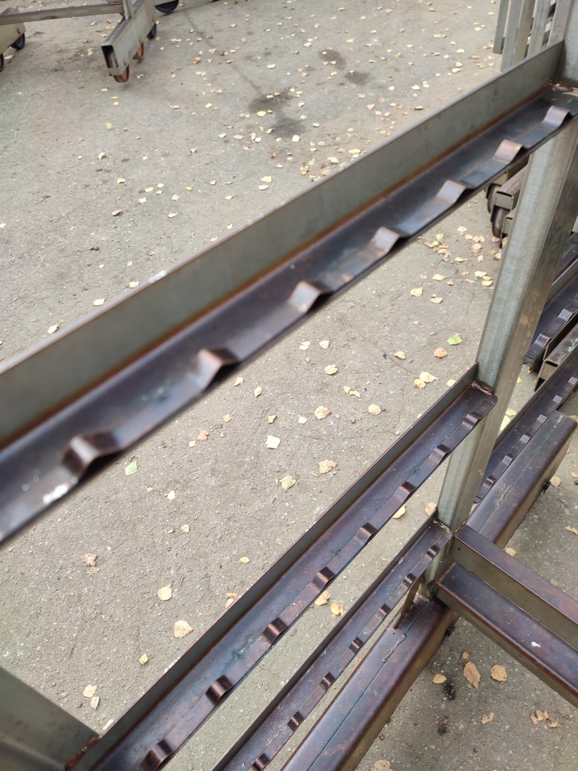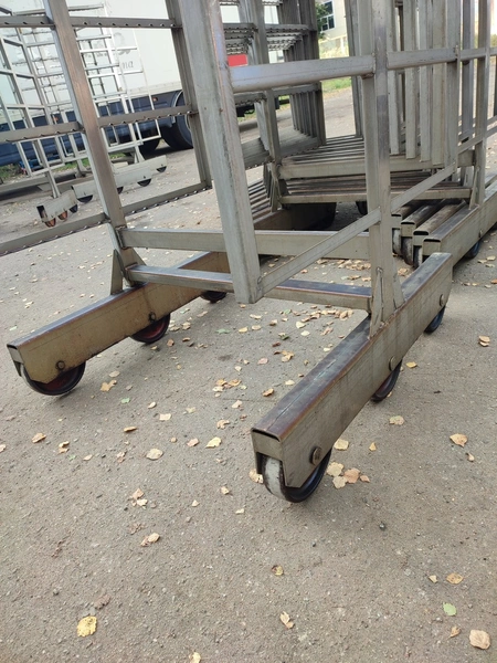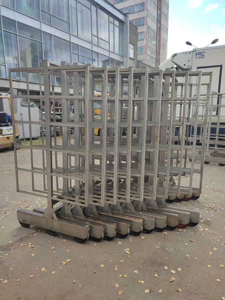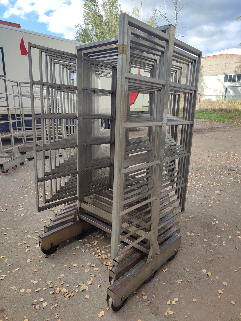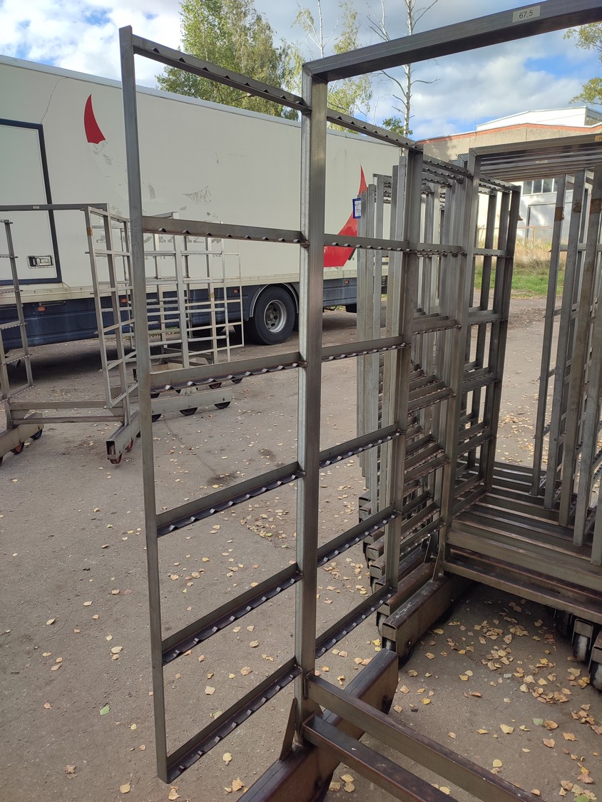 10 s/s smoke trolleys, 6 floors each, dimensions each floor: 1005 mm x 995 mm, total dimensions: (10x) 1015 mm x 1000 mm x 2005 mm.