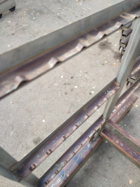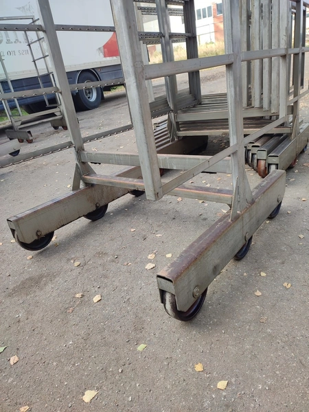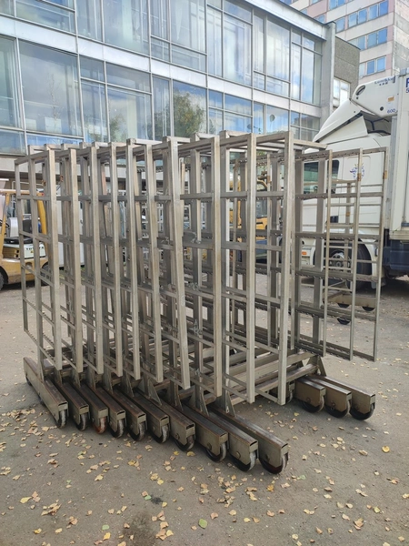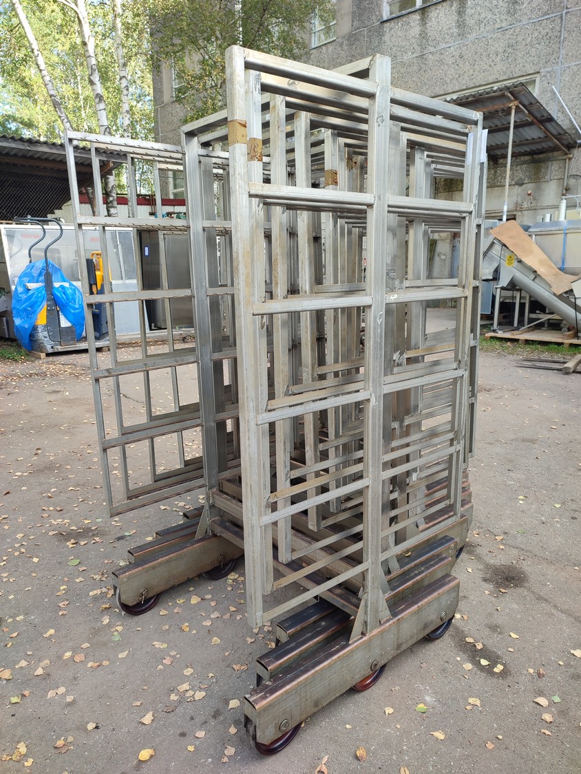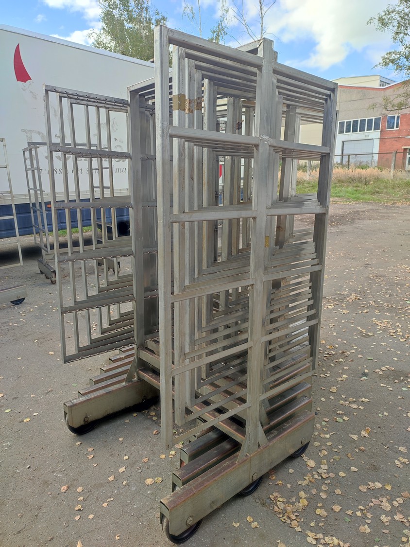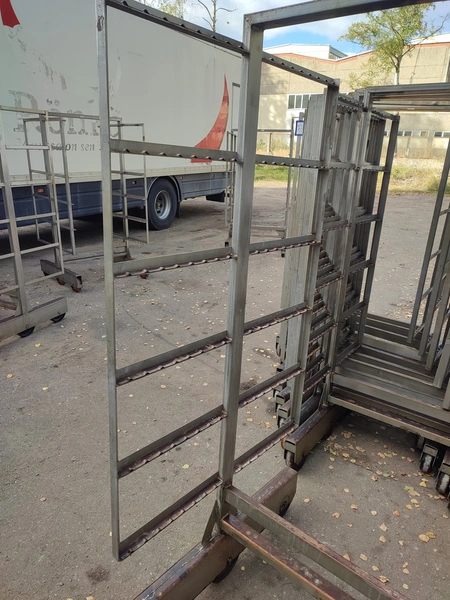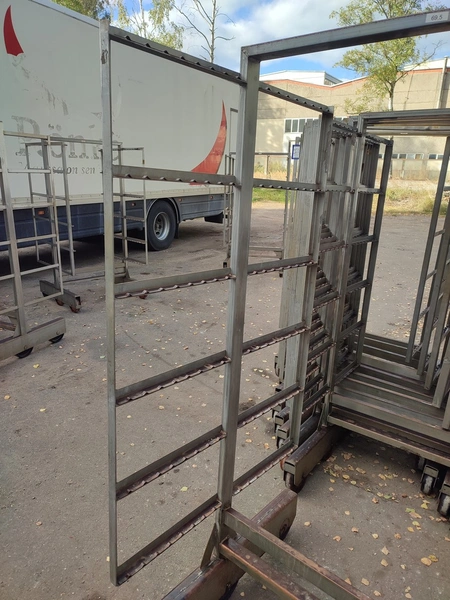 10 s/s smoke trolleys, 6 floors each, dimensions each floor: 1005 mm x 995 mm, total dimensions: (10x) 1015 mm x 1000 mm x 2005 mm.
