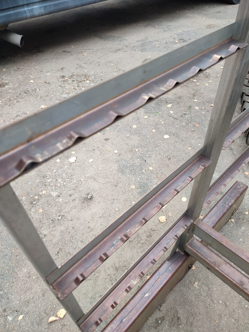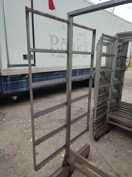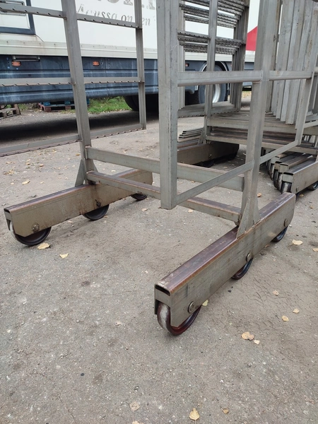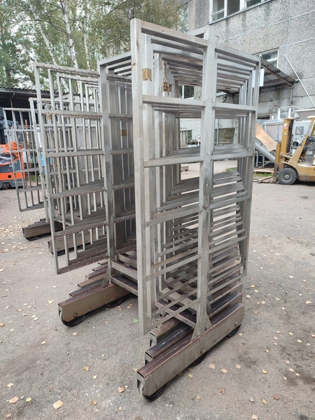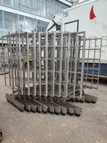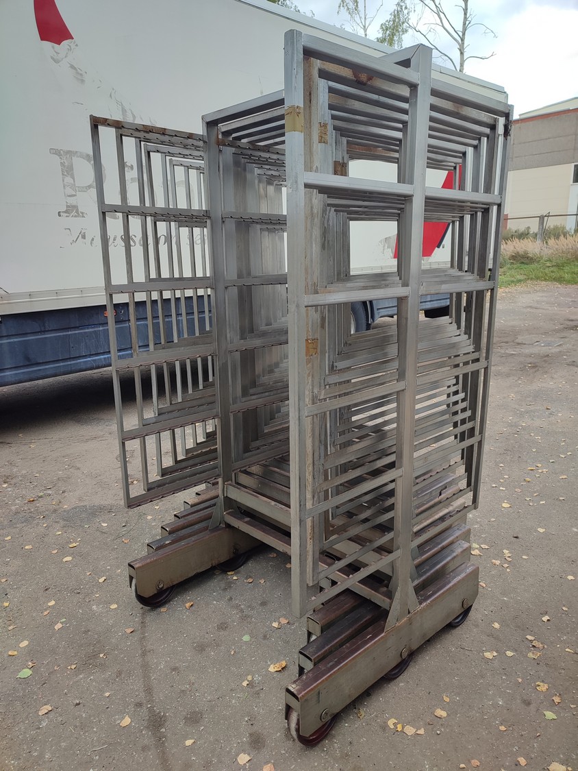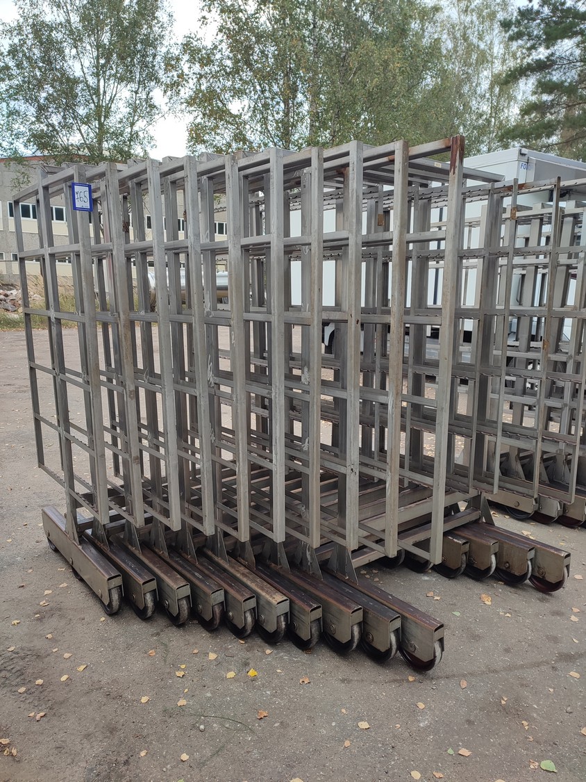 10 s/s smoke trolleys, 6 floors each, dimensions each floor: 1005 mm x 995 mm, total dimensions: (10x) 1015 mm x 1000 mm x 2005 mm.