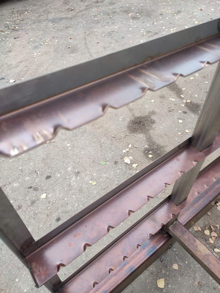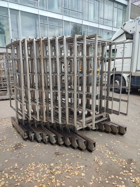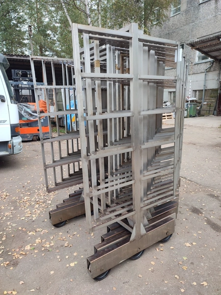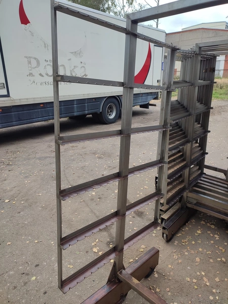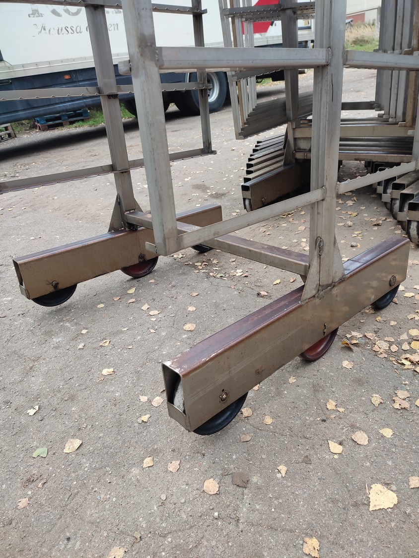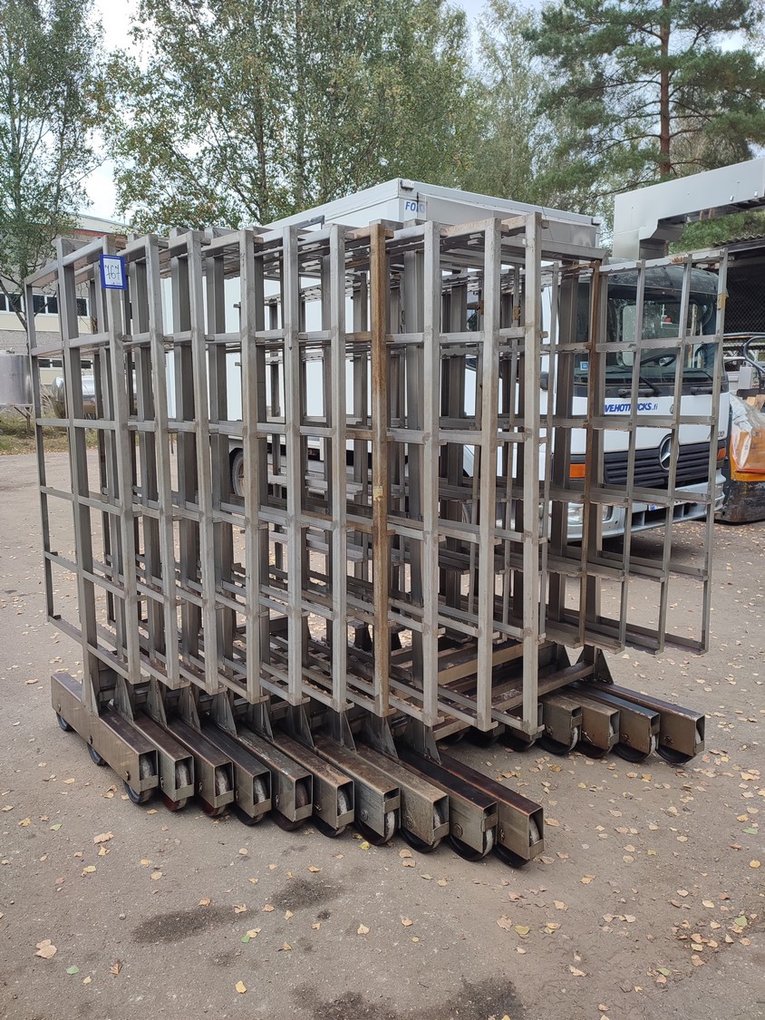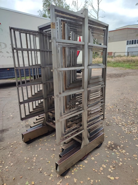 10 s/s smoke trolleys, 6 floors each, dimensions each floor: 1015 mm x 995 mm, total dimensions: (10x) 1020 mm x 1000 mm x 2000 mm.