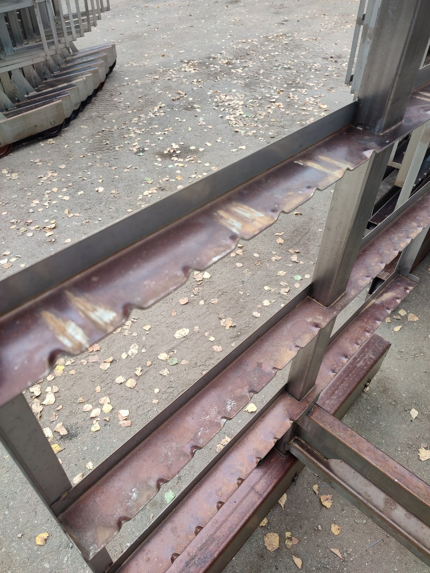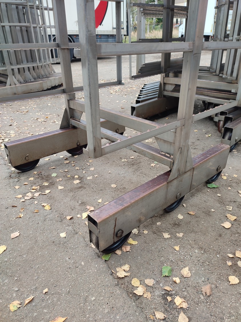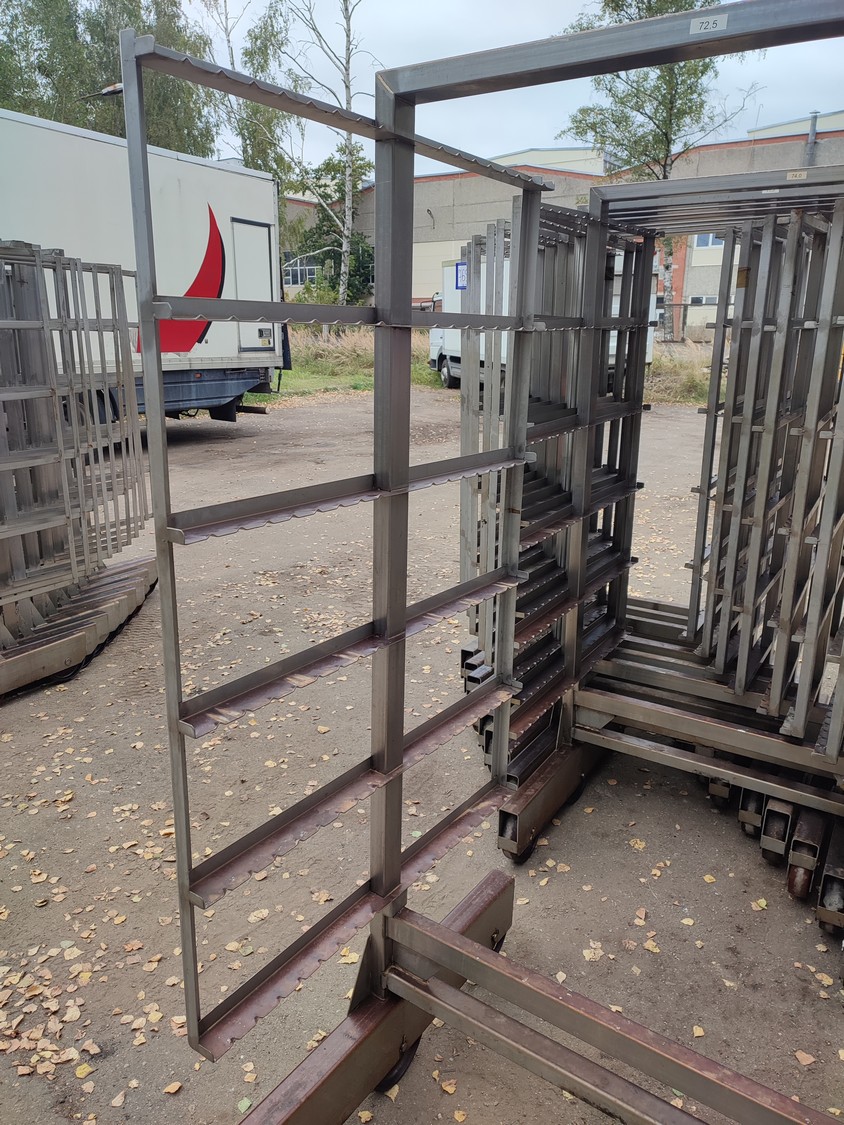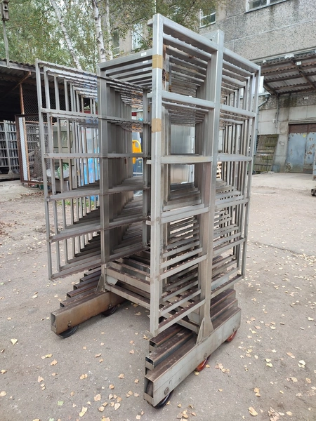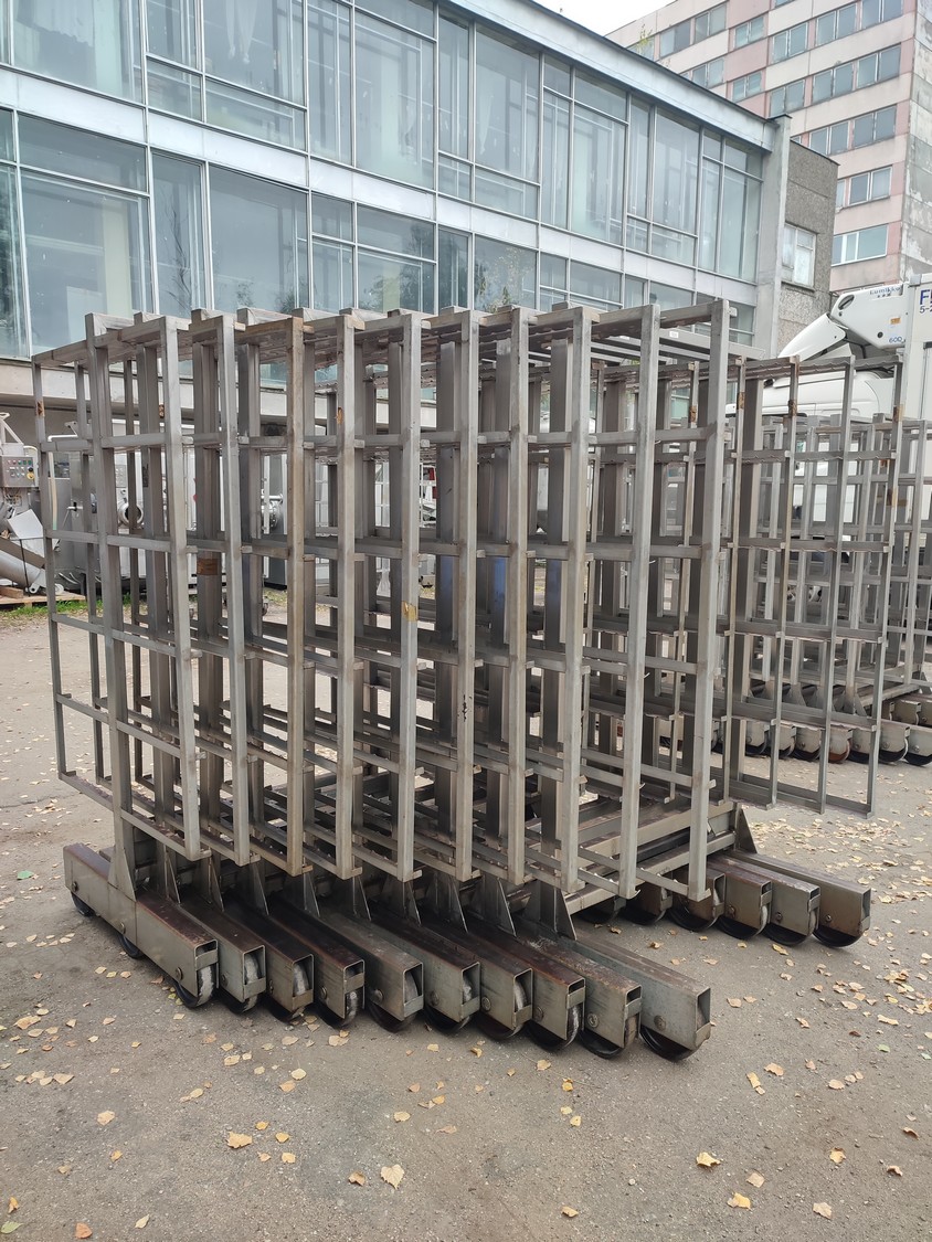 10 s/s smoke trolleys, 6 floors each, dimensions each floor: 1015 mm x 995 mm, total dimensions: (10x) 1020 mm x 1000 mm x 2000 mm.
