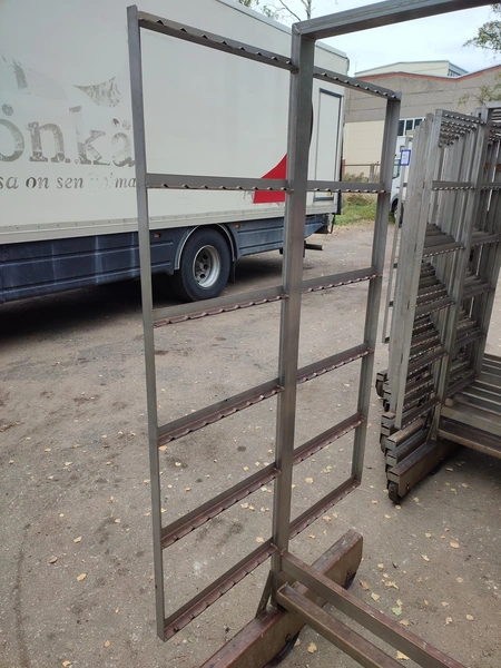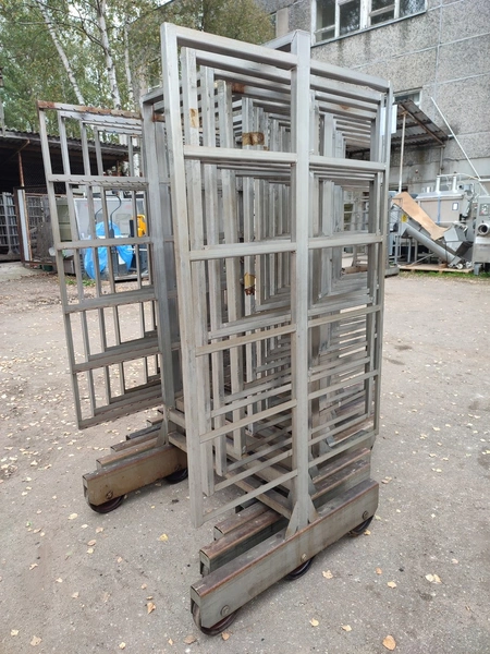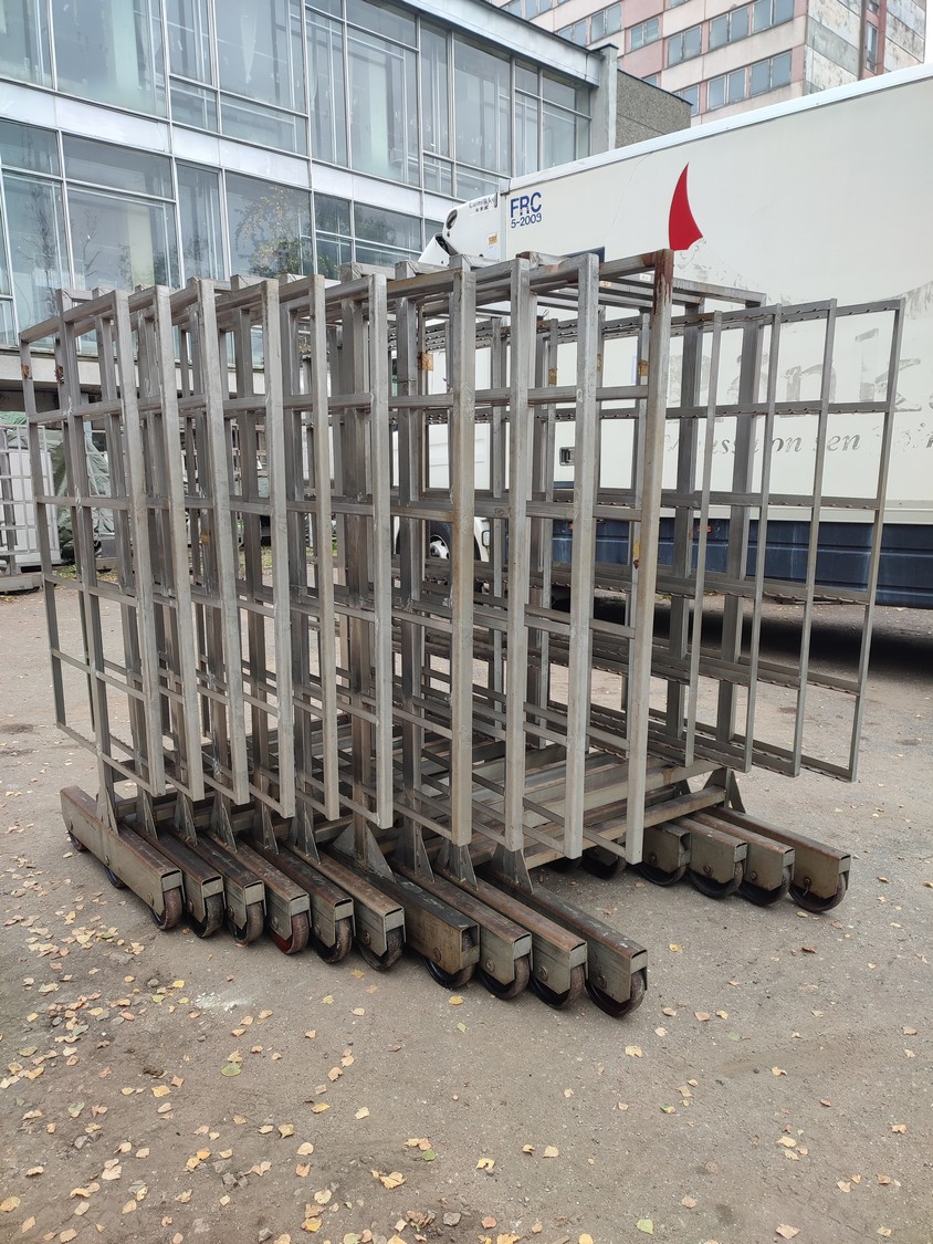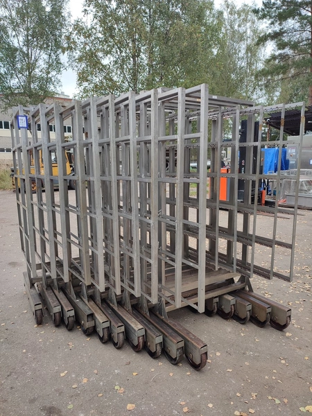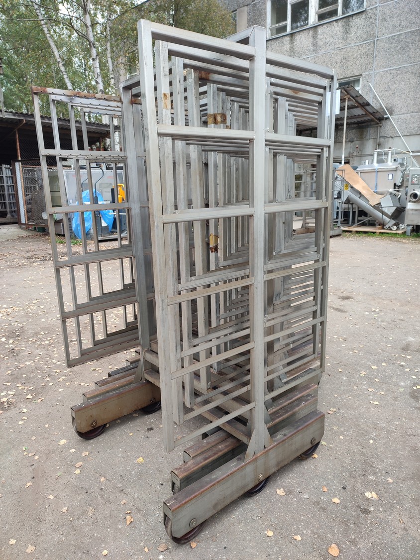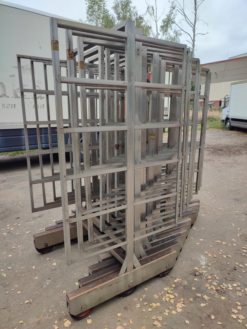 10 s/s smoke trolleys, 6 floors each, dimensions each floor: 1005 mm x 995 mm, total dimensions: (10x) 1015 mm x 1000 mm x 2005 mm.