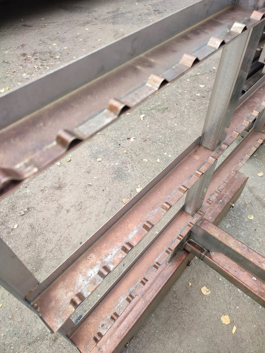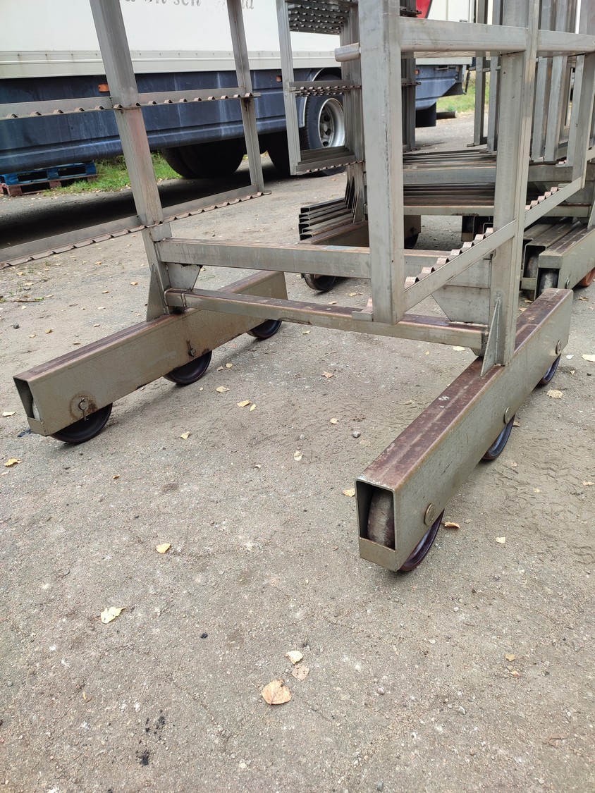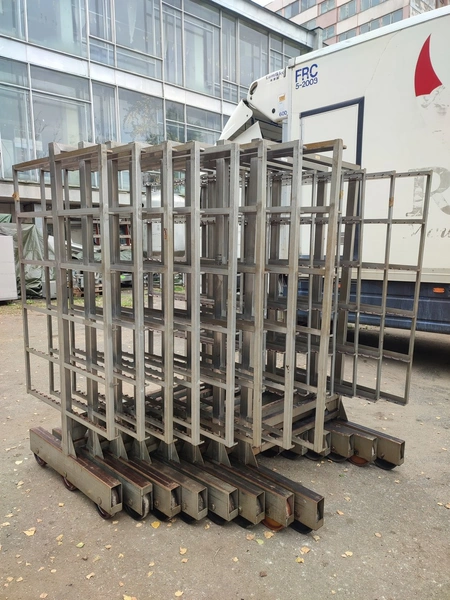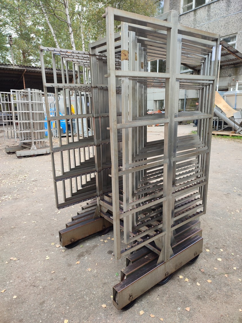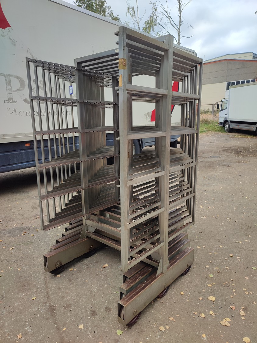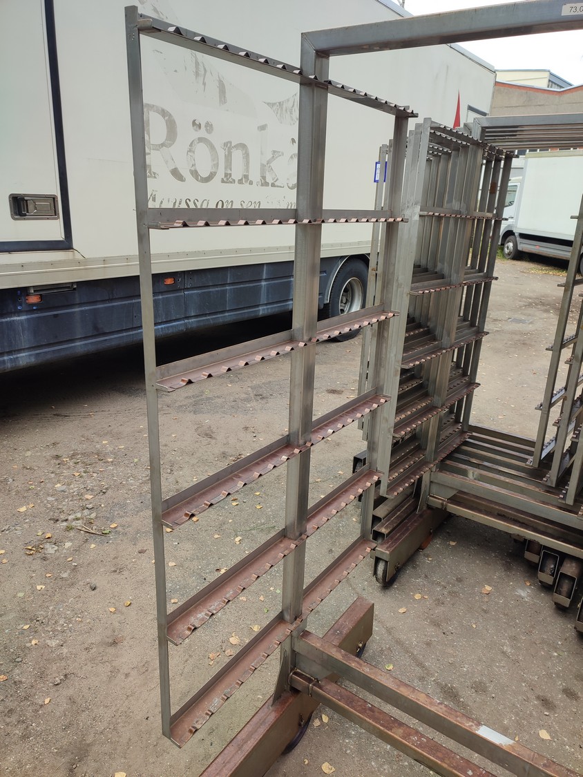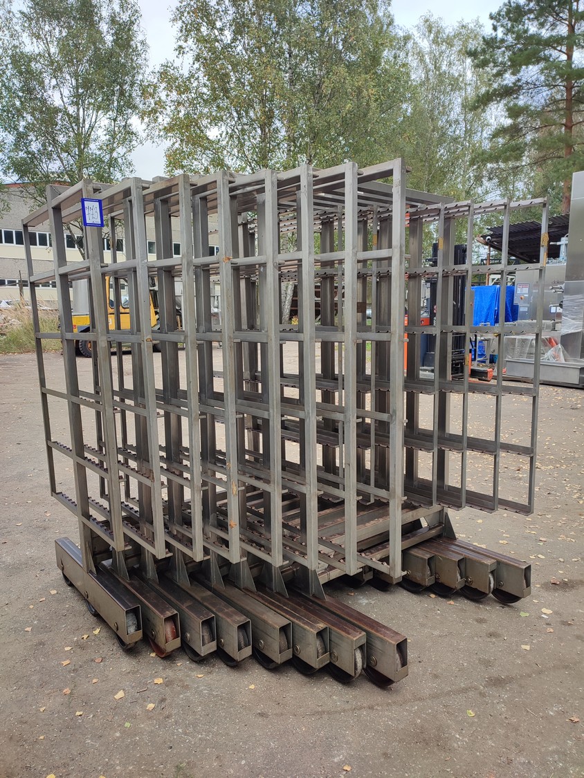 8 s/s smoke trolleys, 6 floors each, dimensions each floor: 1010 mm x 995 mm, total dimensions: (8x) 1015 mm x 1000 mm x 2005 mm.