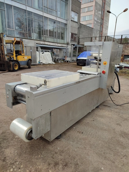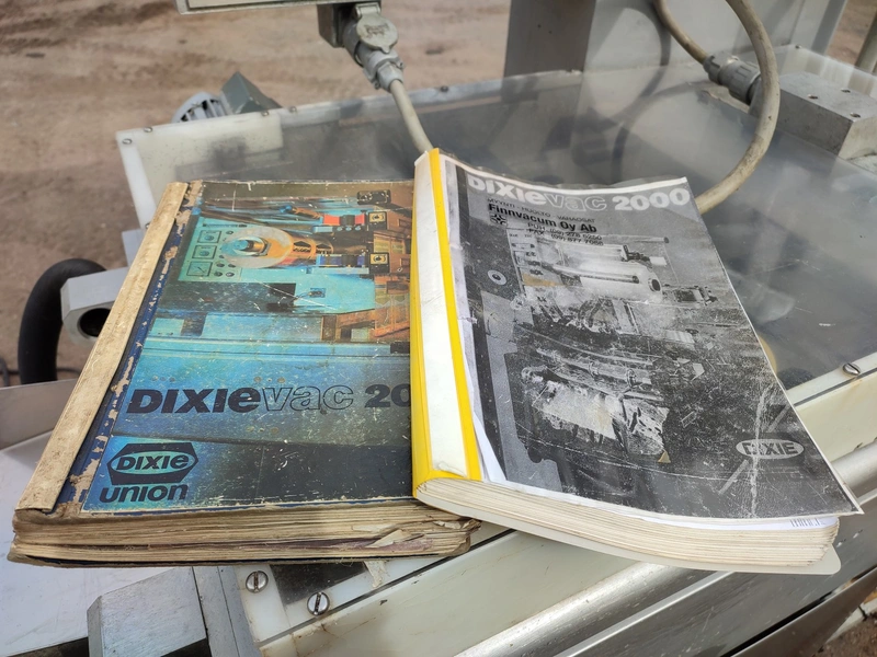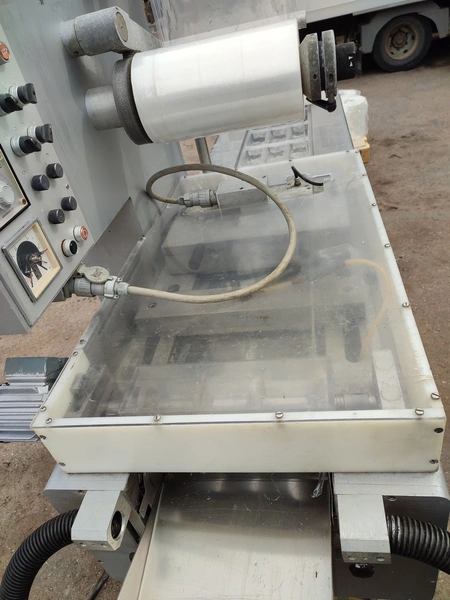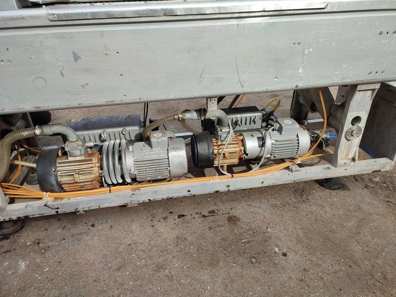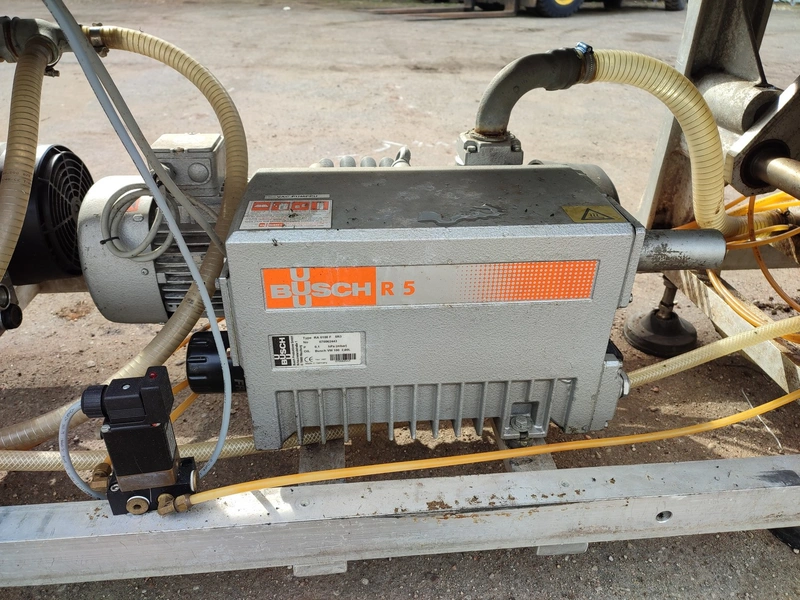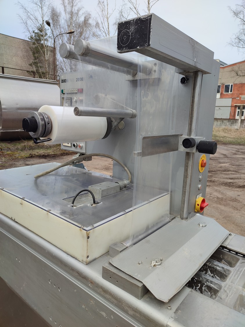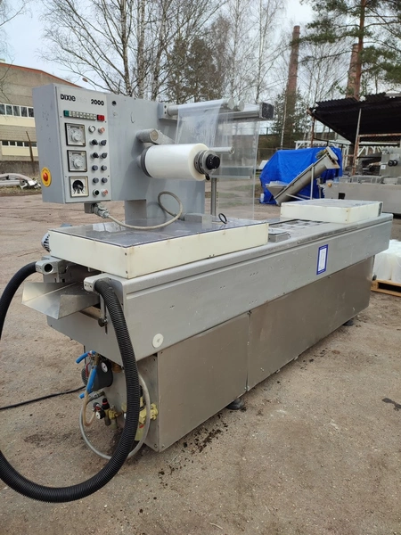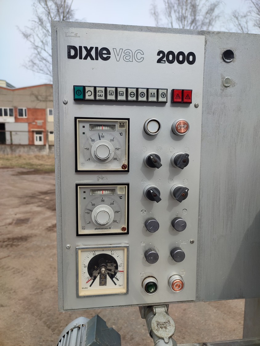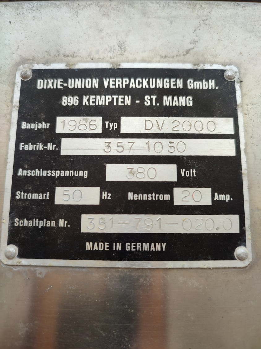 Dixie Union thermoformer, type: DV 2000, number: 357 1050, year of construction: 1986, 380 V, 50 Hz, 20 A, bottom film width: 322 mm, top film width: 305 mm, dye: (6x) 200 mm x 83 mm x 120 mm, 2 Busch vacuum pumps, type: RA 0040 E / RA 0100 F 5R3, capacity: 40 / 100 m³ per hour, total dimensions: 3500 mm x 800 mm x 1725 mm. Including suction device for rest film and pallet with plastic film, pallet dimensions: 1200 mm x 800 mm x 470 mm.