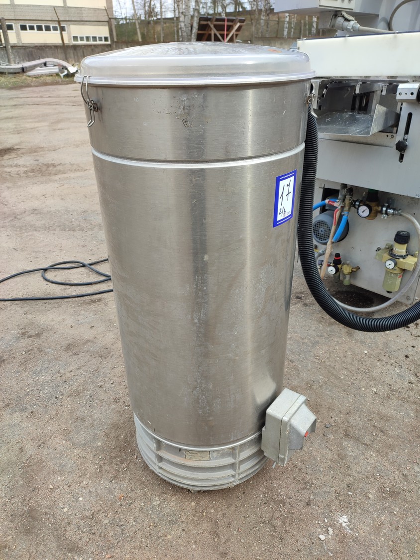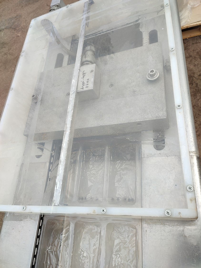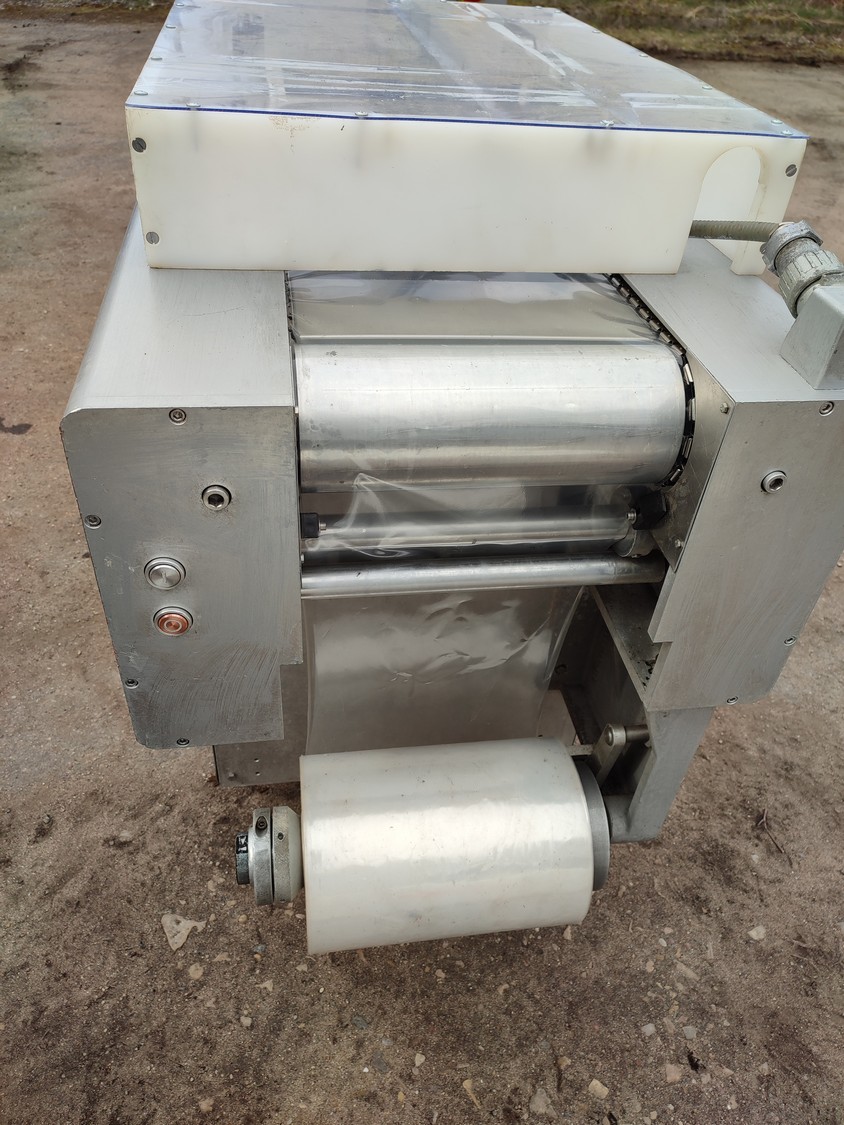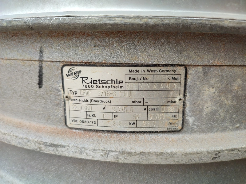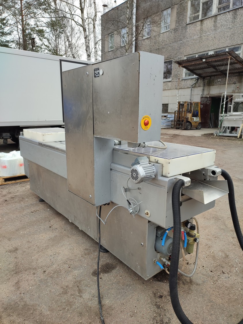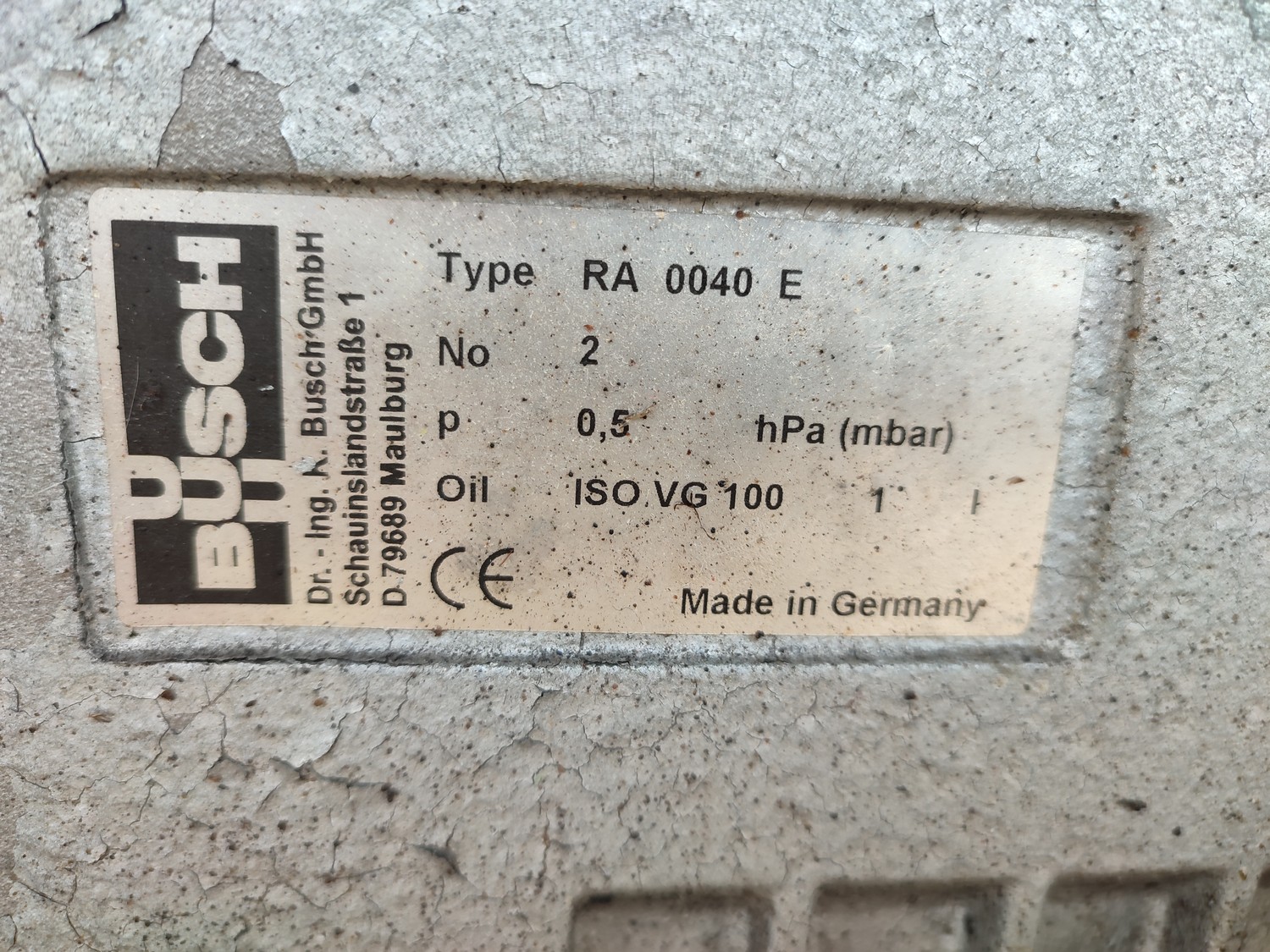 Dixie Union thermoformer, type: DV 2000, number: 357 1050, year of construction: 1986, 380 V, 50 Hz, 20 A, bottom film width: 322 mm, top film width: 305 mm, dye: (6x) 200 mm x 83 mm x 120 mm, 2 Busch vacuum pumps, type: RA 0040 E / RA 0100 F 5R3, capacity: 40 / 100 m³ per hour, total dimensions: 3500 mm x 800 mm x 1725 mm. Including suction device for rest film and pallet with plastic film, pallet dimensions: 1200 mm x 800 mm x 470 mm.