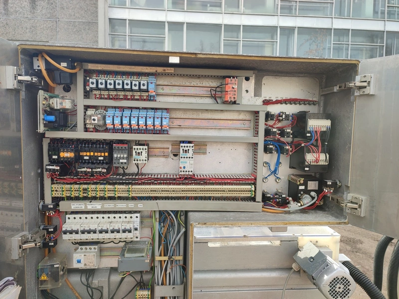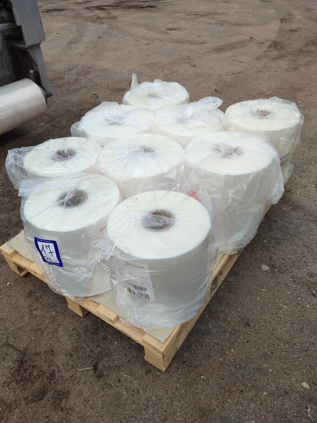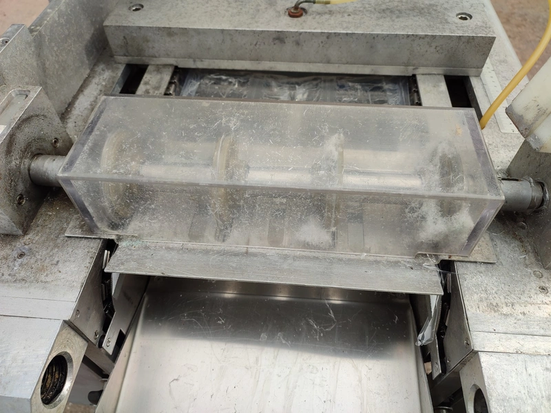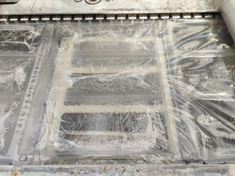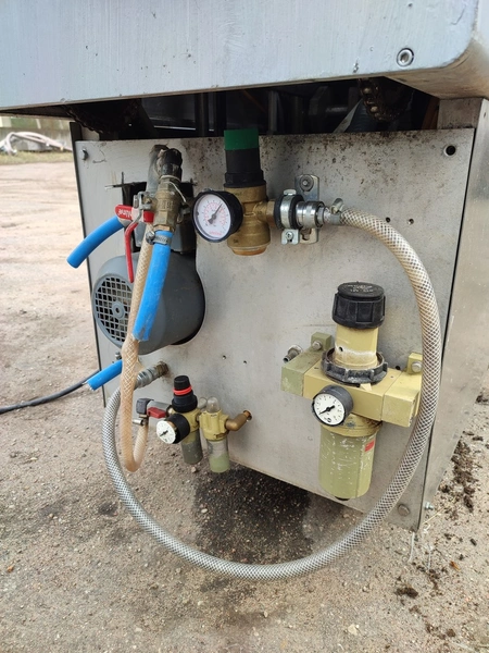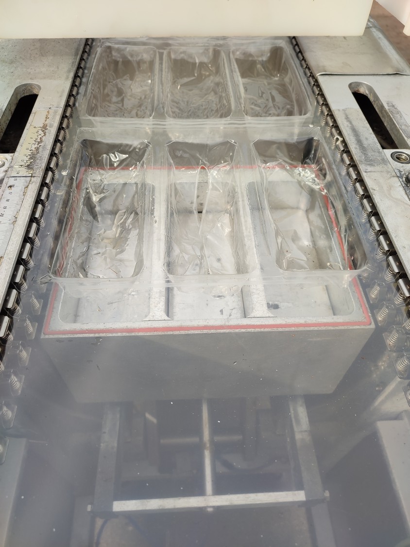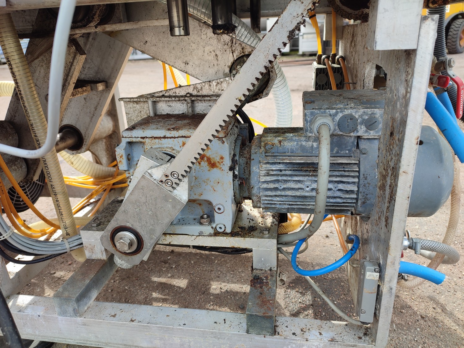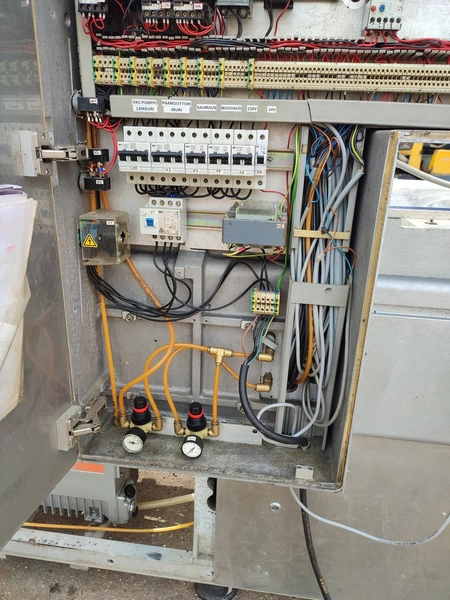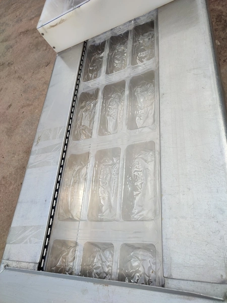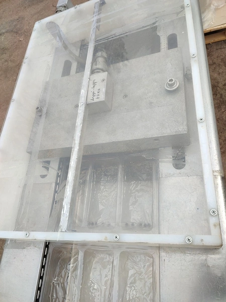 Dixie Union thermoformer, type: DV 2000, number: 357 1050, year of construction: 1986, 380 V, 50 Hz, 20 A, bottom film width: 322 mm, top film width: 305 mm, dye: (6x) 200 mm x 83 mm x 120 mm, 2 Busch vacuum pumps, type: RA 0040 E / RA 0100 F 5R3, capacity: 40 / 100 m³ per hour, total dimensions: 3500 mm x 800 mm x 1725 mm. Including suction device for rest film and pallet with plastic film, pallet dimensions: 1200 mm x 800 mm x 470 mm.