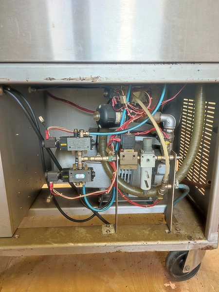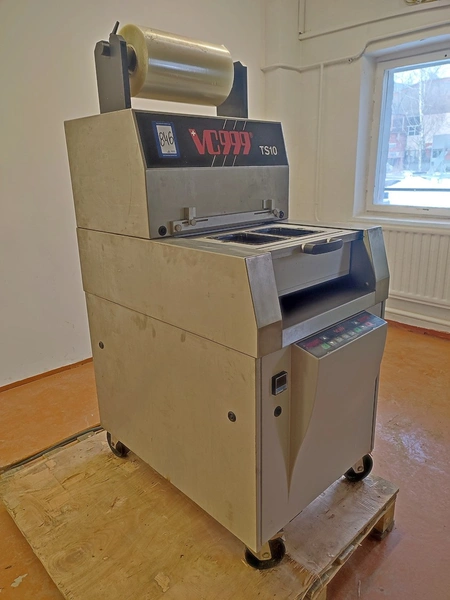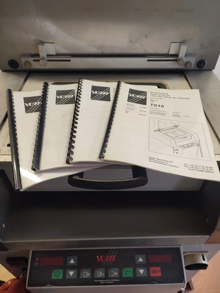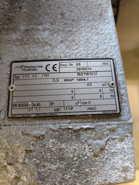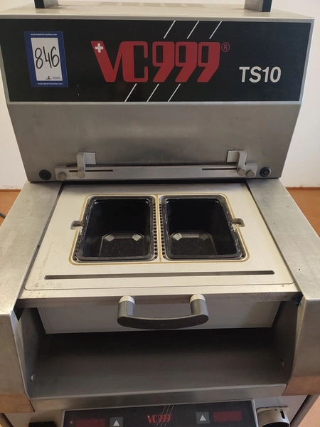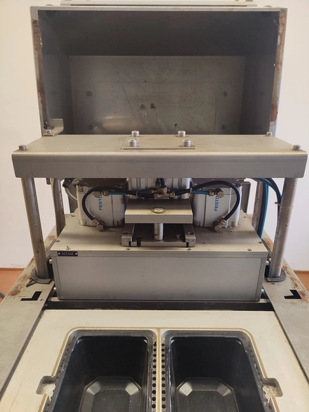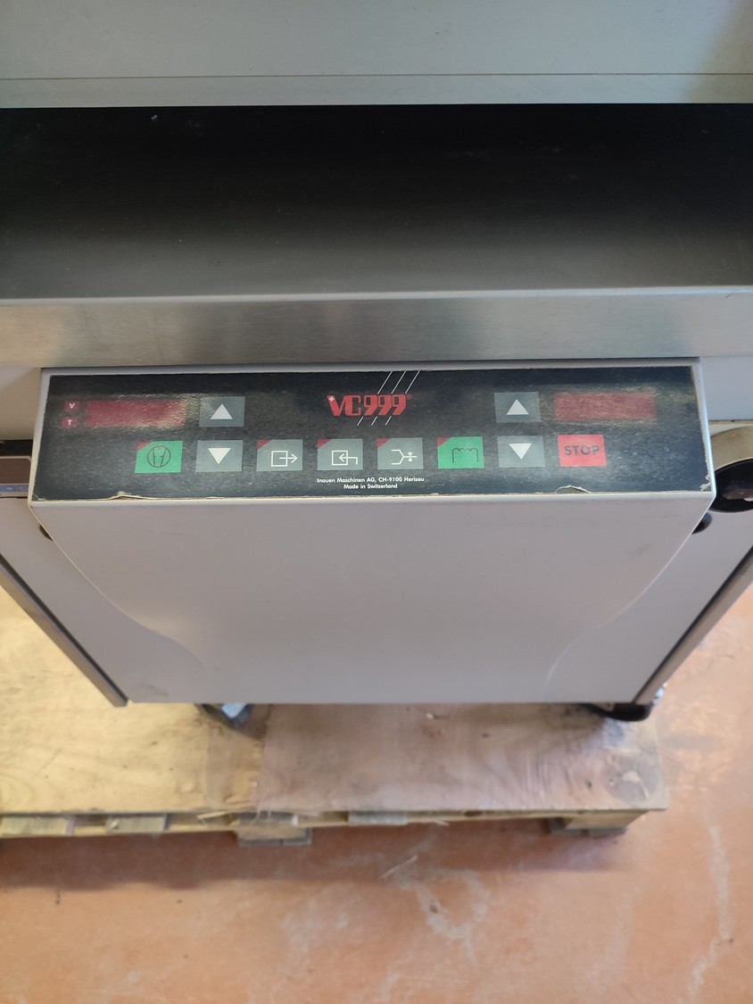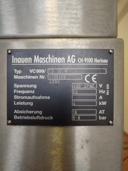 Inauen Maschinen AG mobile traysealer, type: VC999/TS 10 N, machine number: 4106129, year of construction: 2006, 400 V, 4 kW, 6-8 bar, 50 Hz, dye: (2x) 195 mm x 130 mm, film width: 360 mm, Rietschle vacuum pump, type: VCA 40 (10), machine number: 06 2610514, 1,1 kW, 40 m3/h, total dimensions: 1100 mm x 1300 mm x 1800 mm. Including pallet with film.