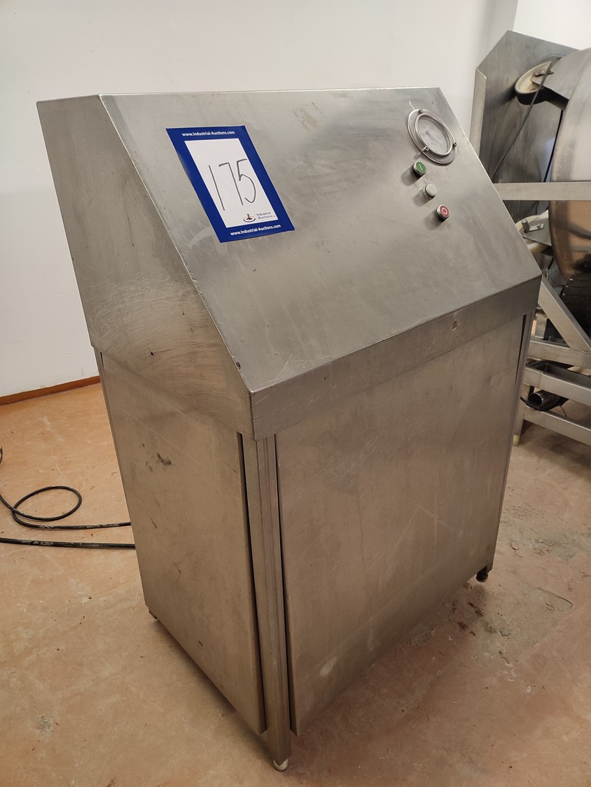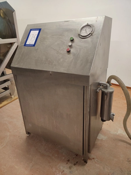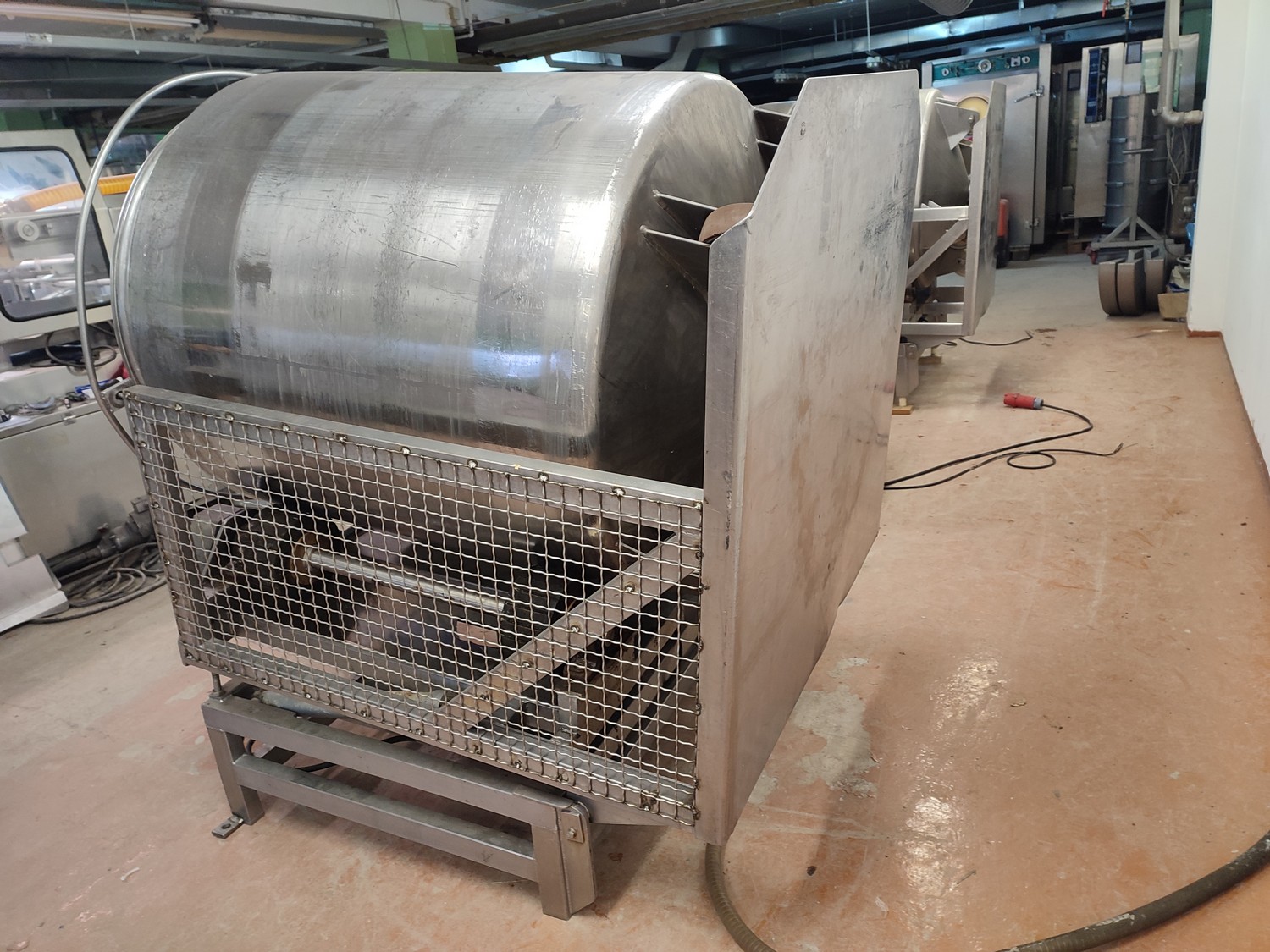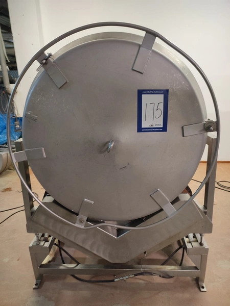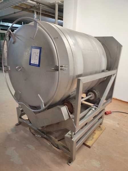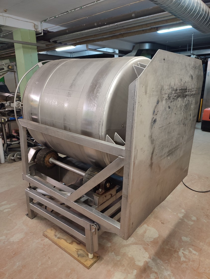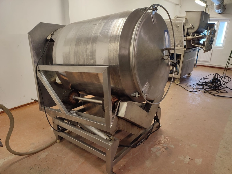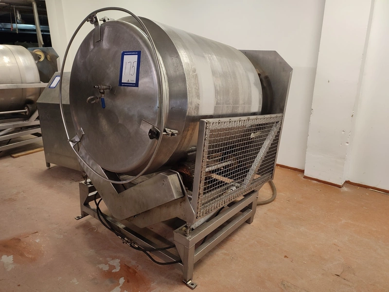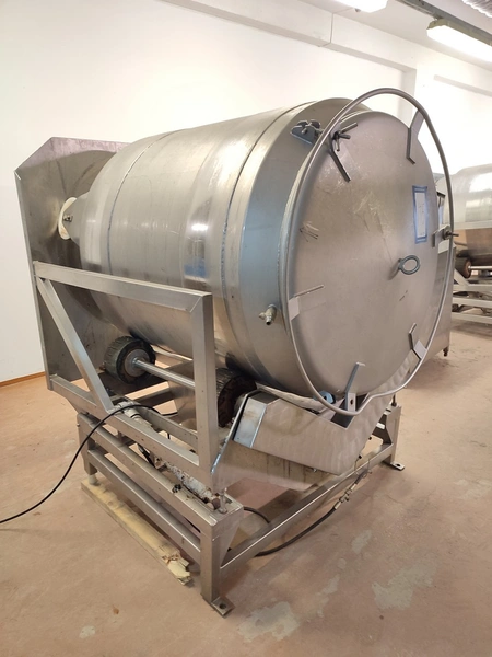 Vacuum tumbler installation with 2 s/s vacuum tumblers, dimensions barrel: (2x) ø 1000 mm x 1000 mm, total dimensions tumbler: (2x) 1270 mm x 1580 mm x 1670 mm, Busch vacuum pump, type: 063-136-64965, capacity: 63 m³ per hour, hydraulic pump, dimensions of vacuum and hydraulic unit: 970 mm x 560 mm x 1260 mm. Incomplete, no control panel.