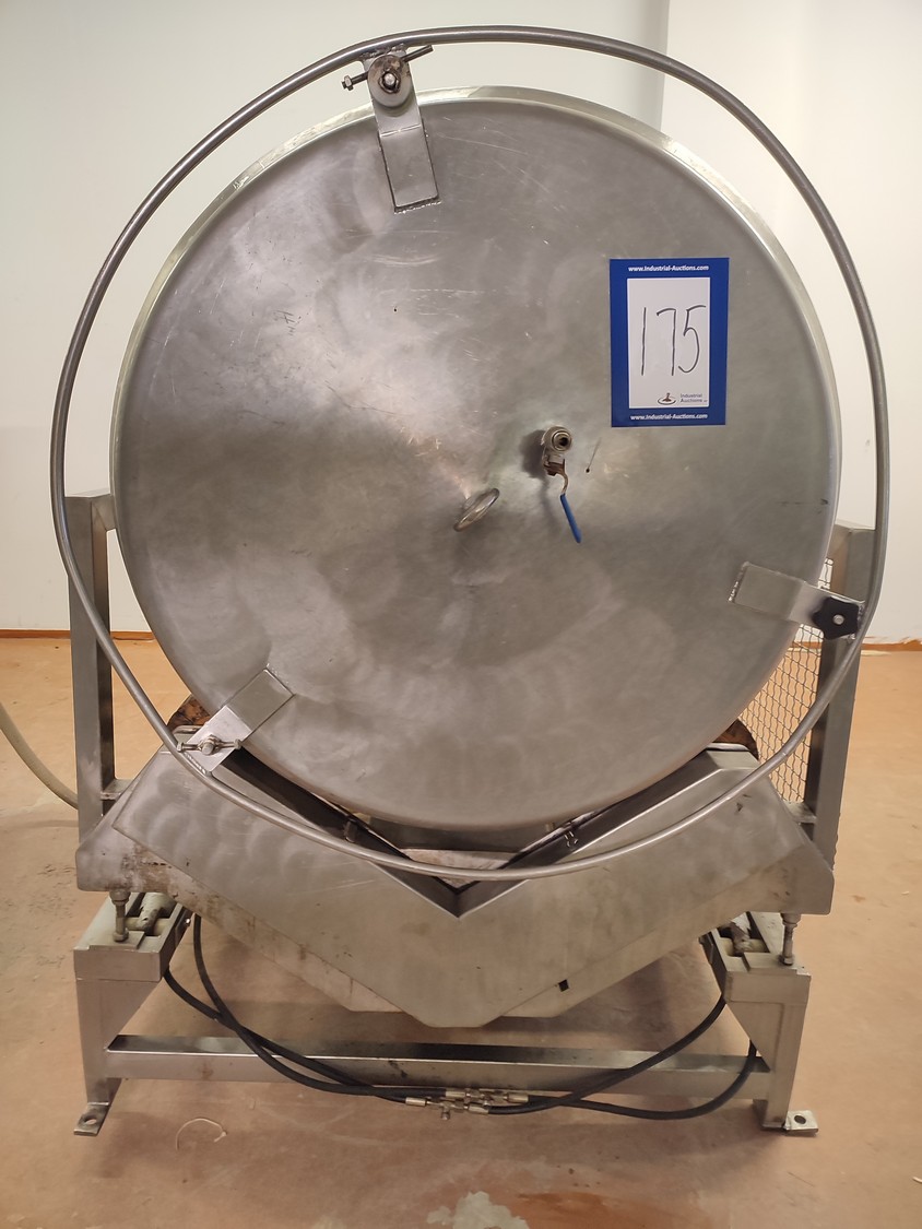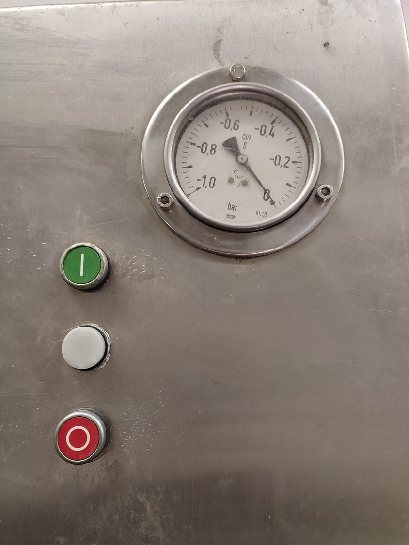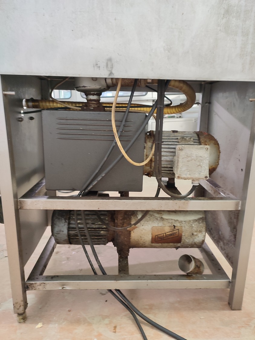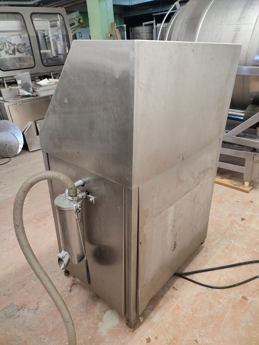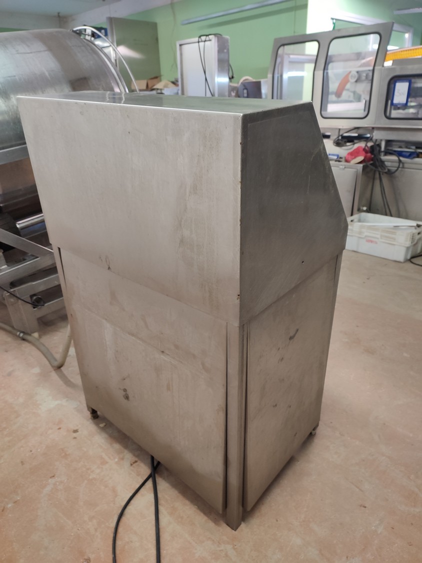 Vacuum tumbler installation with 2 s/s vacuum tumblers, dimensions barrel: (2x) ø 1000 mm x 1000 mm, total dimensions tumbler: (2x) 1270 mm x 1580 mm x 1670 mm, Busch vacuum pump, type: 063-136-64965, capacity: 63 m³ per hour, hydraulic pump, dimensions of vacuum and hydraulic unit: 970 mm x 560 mm x 1260 mm. Incomplete, no control panel.