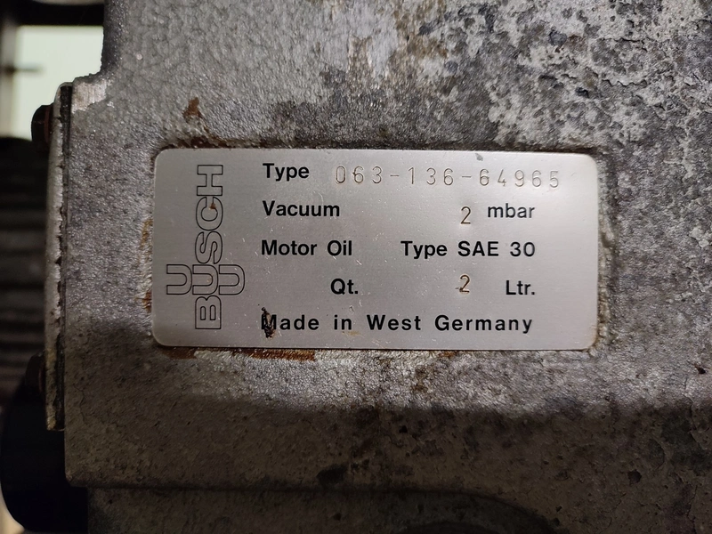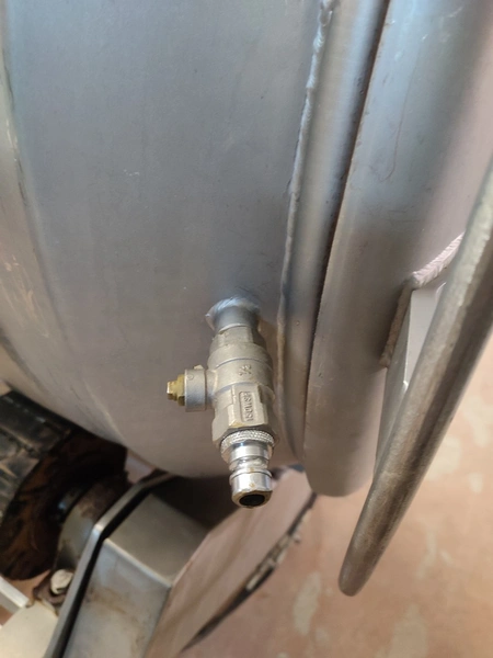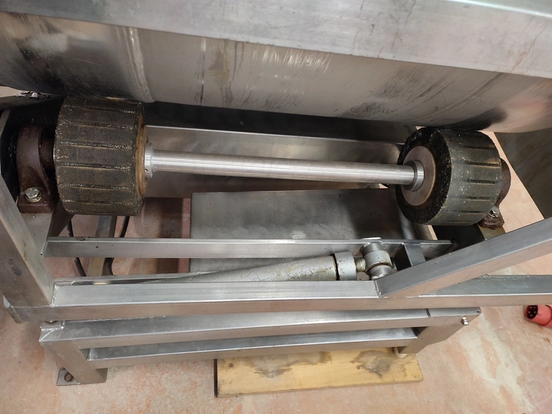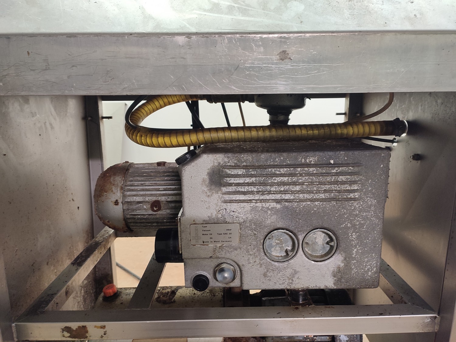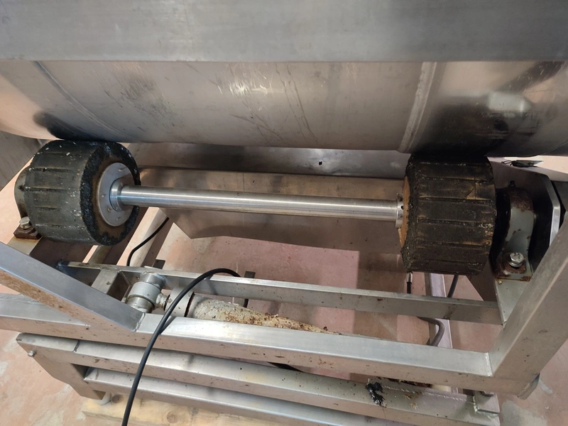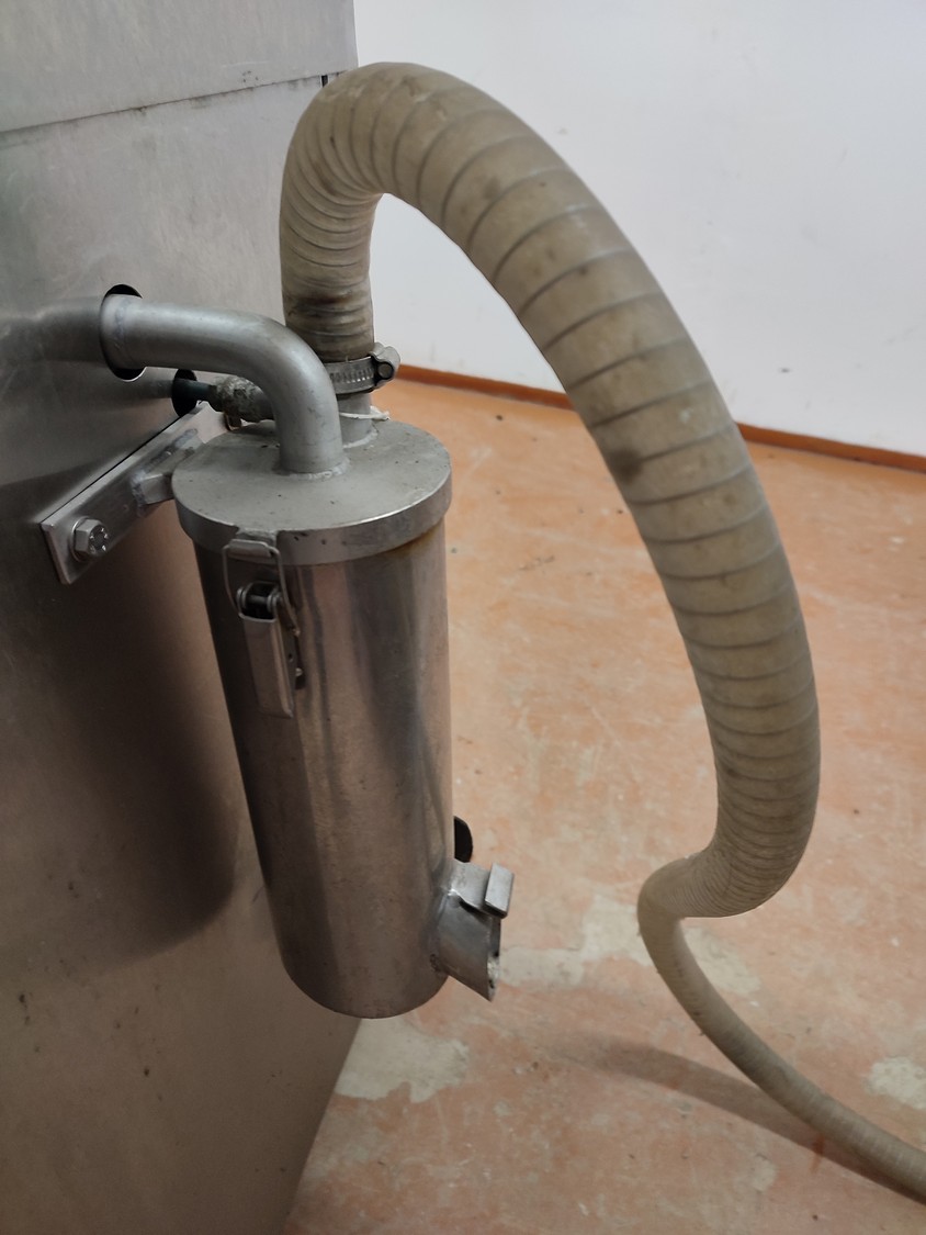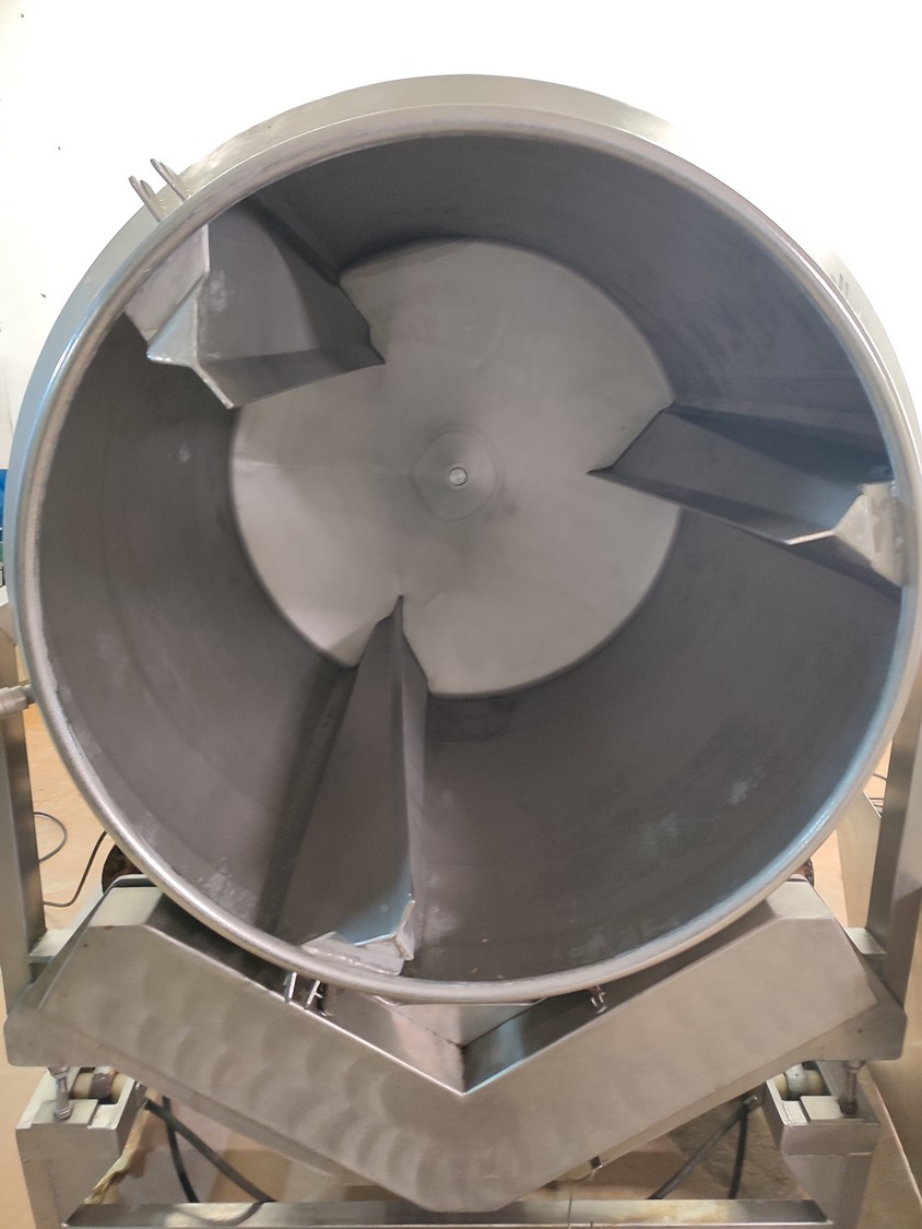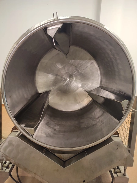 Vacuum tumbler installation with 2 s/s vacuum tumblers, dimensions barrel: (2x) ø 1000 mm x 1000 mm, total dimensions tumbler: (2x) 1270 mm x 1580 mm x 1670 mm, Busch vacuum pump, type: 063-136-64965, capacity: 63 m³ per hour, hydraulic pump, dimensions of vacuum and hydraulic unit: 970 mm x 560 mm x 1260 mm. Incomplete, no control panel.