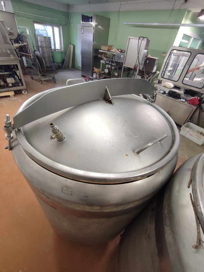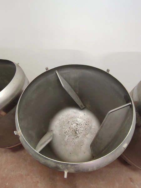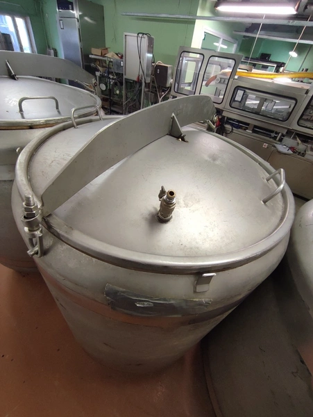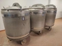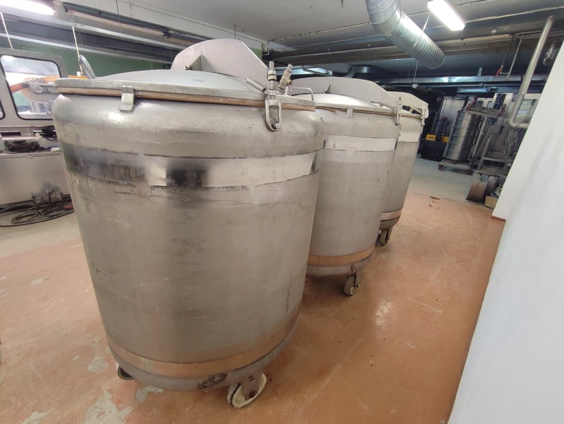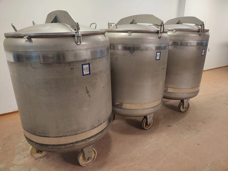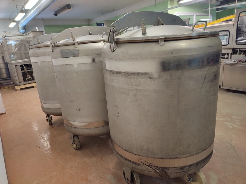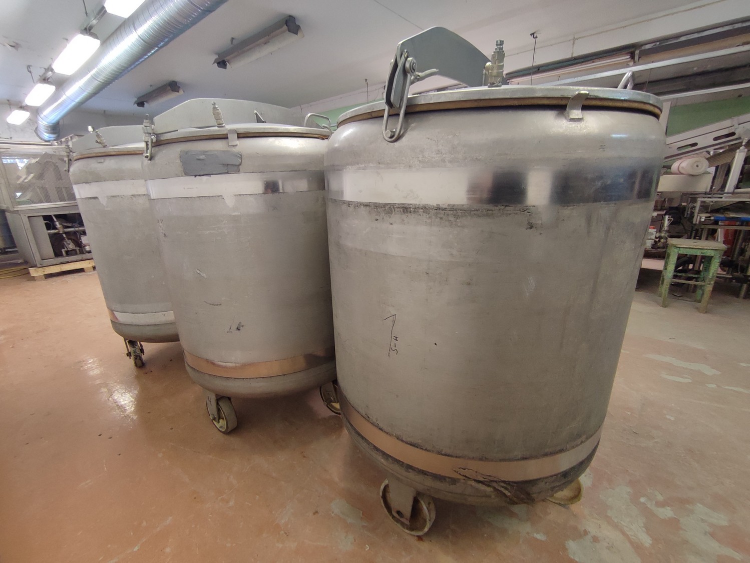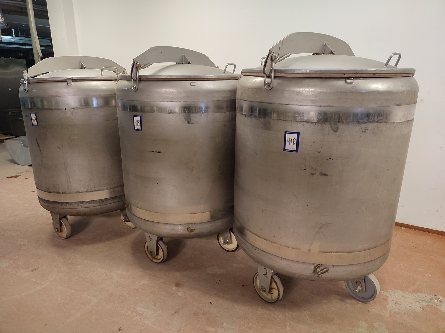 3 s/s mobile tubs for vacuum tumbler, inside dimensions: Ø (3x) 1000 mm x 1000 mm, total dimensions: (3x) Ø 1120 mm x 1600 mm.